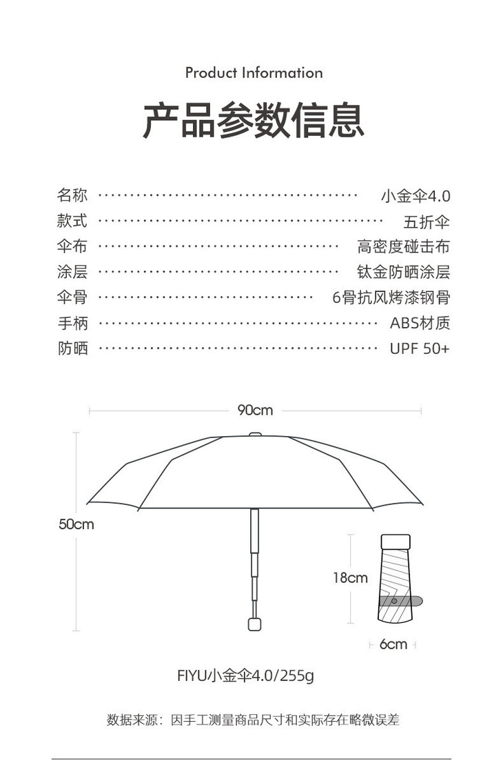 FIYU小金伞4.0作为地表最强防晒伞,UPF>50、UPFAV >2000,是远远超过国家规定的标准,防护系数更是行业之最;