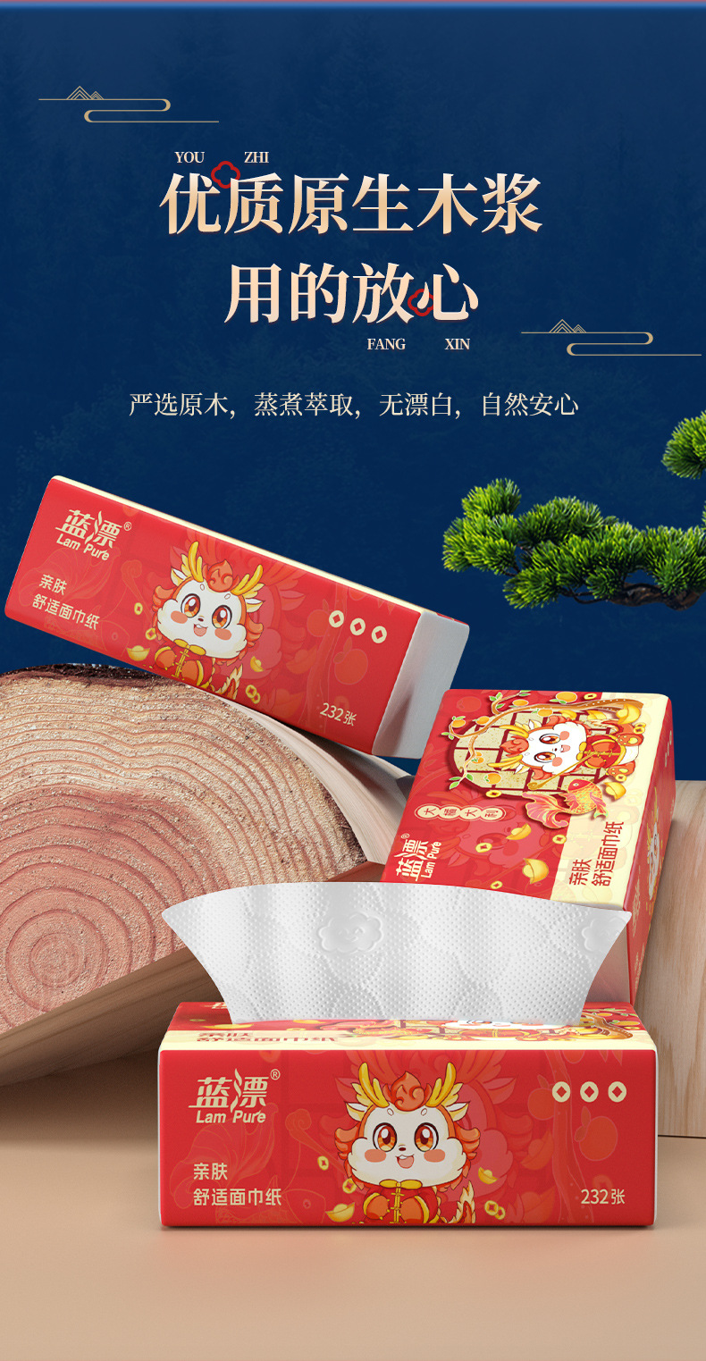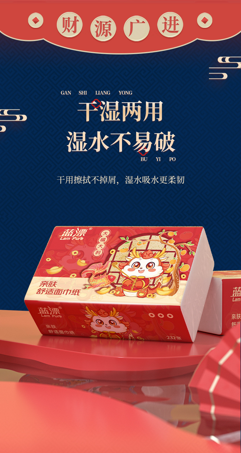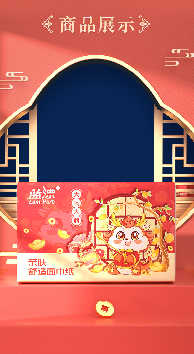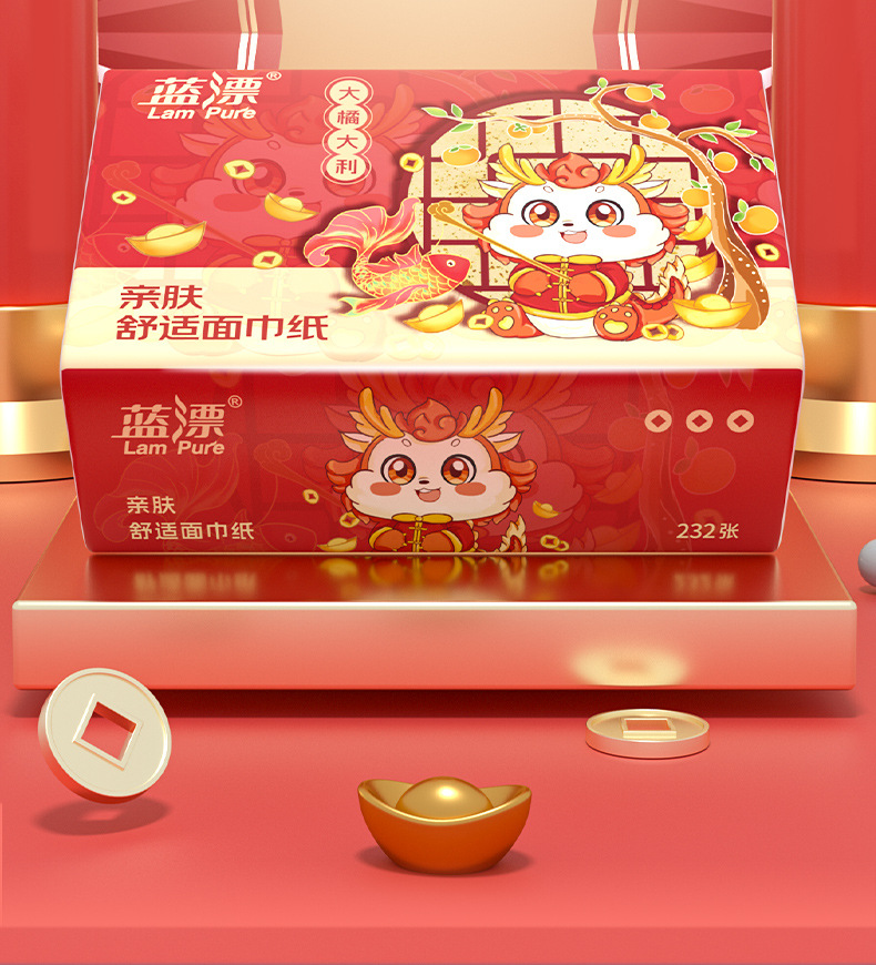 「30包装!龙年新年抽纸」蓝漂居家日用实惠装新年装卫生纸龙年行大运(大橘大利)白色抽纸