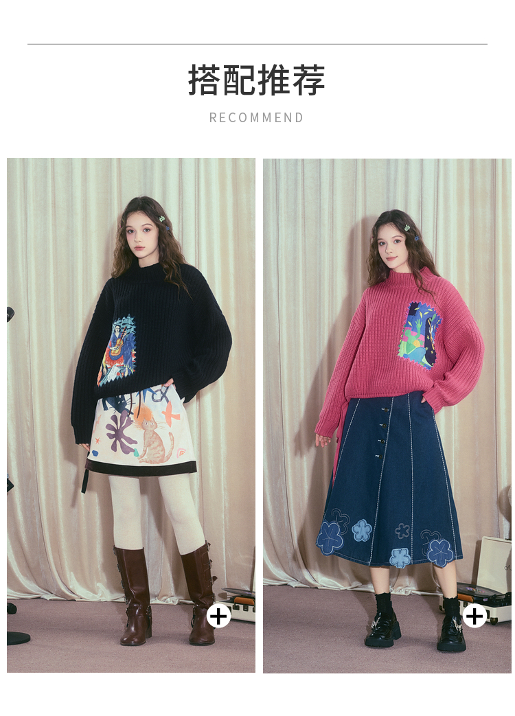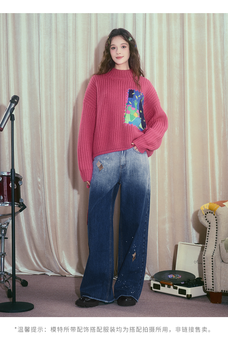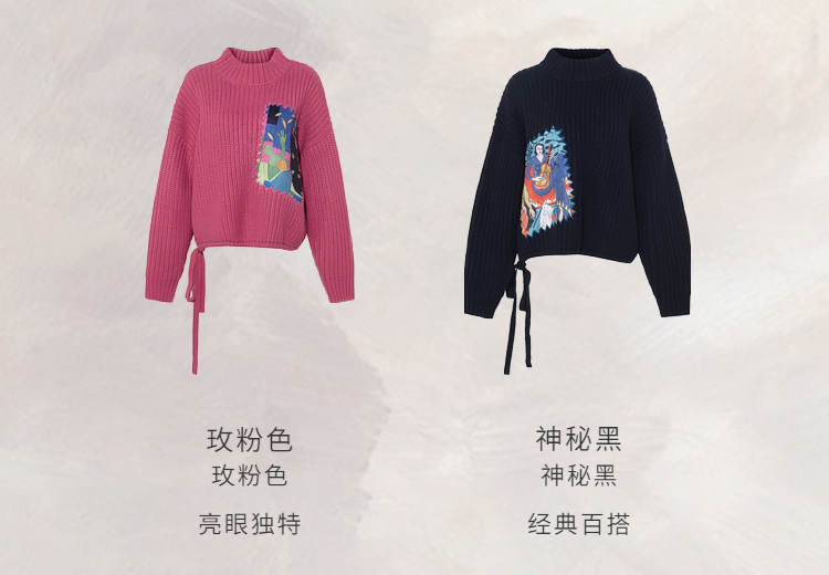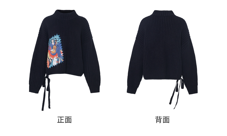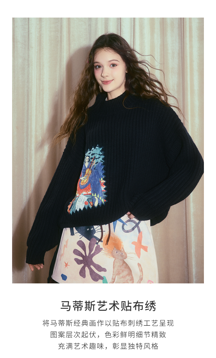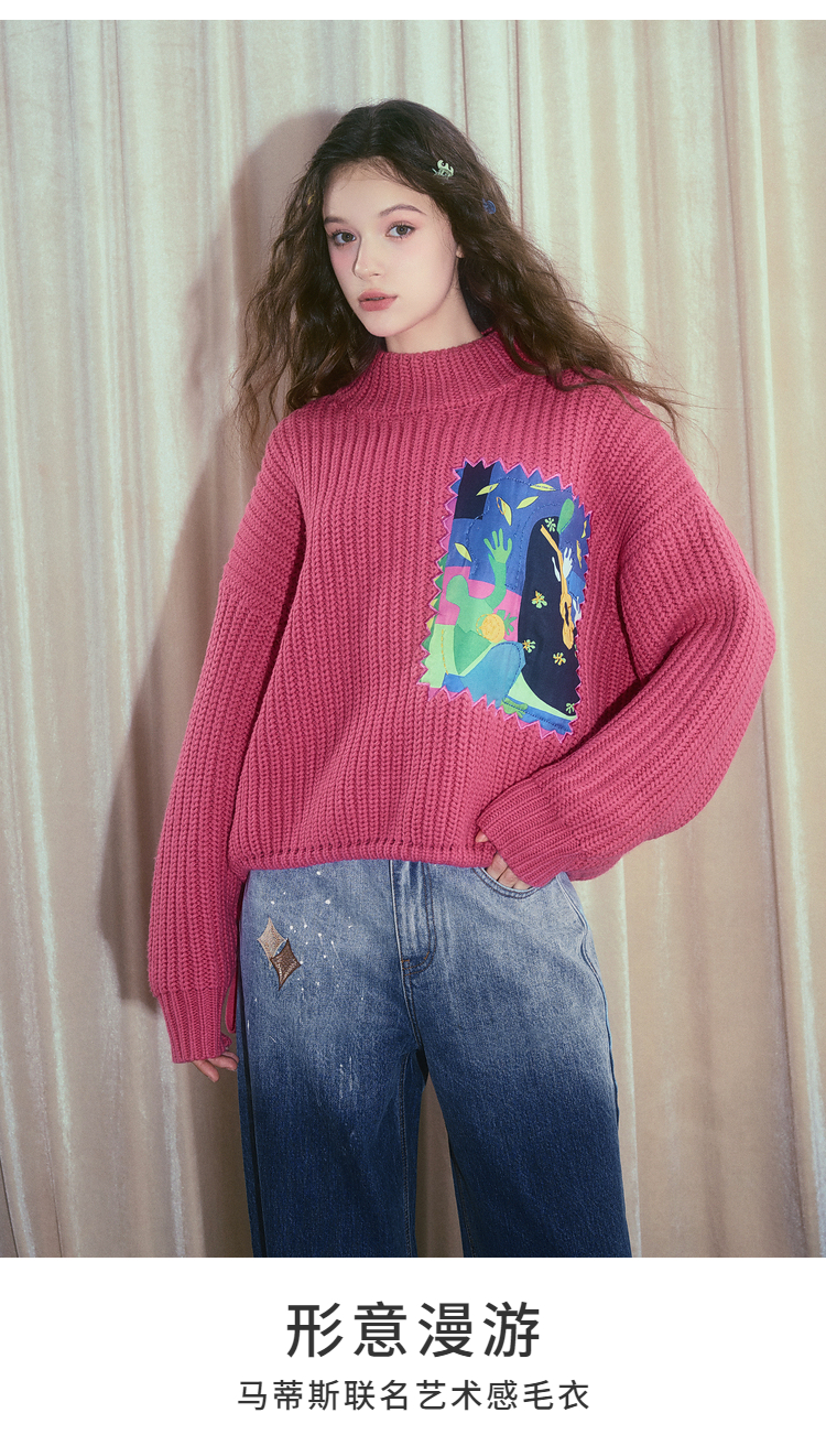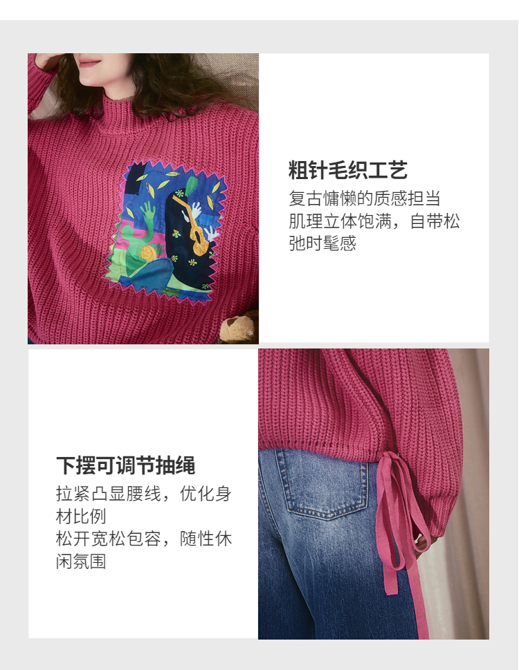 两三事 形意漫游 2025冬季新款抽象印花贴布绣抽绳下摆毛衣女宽松
