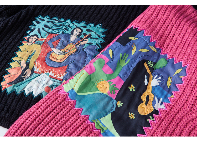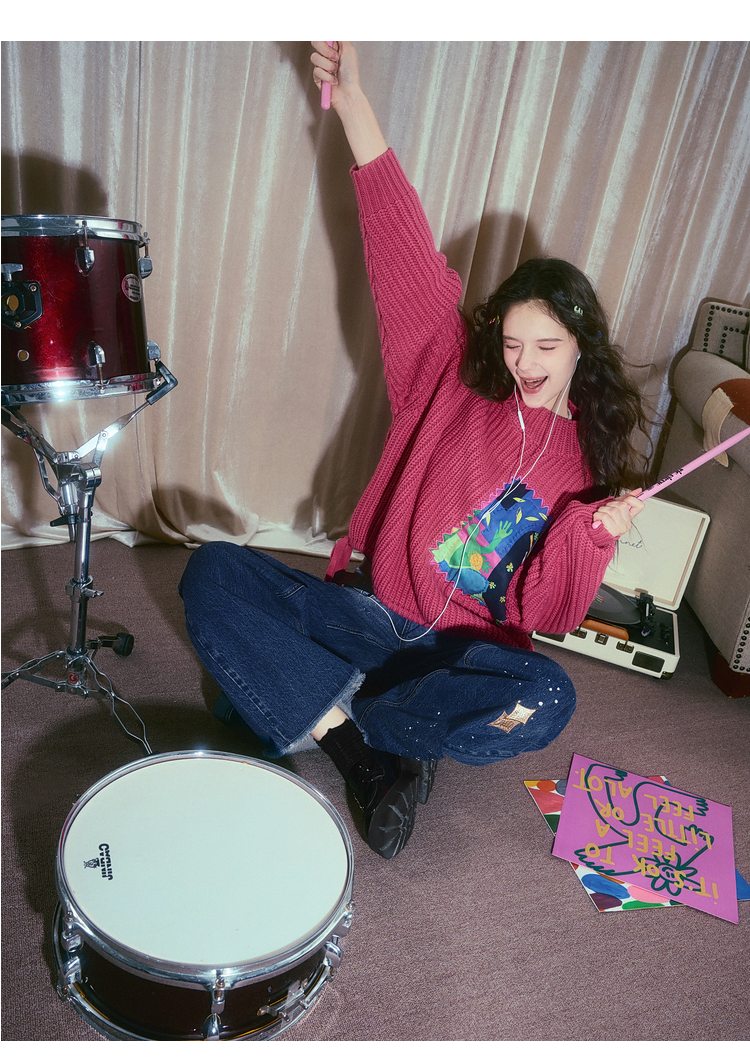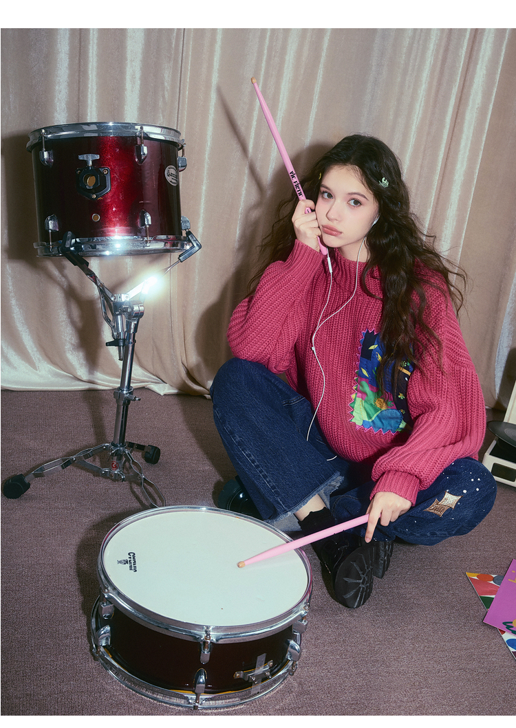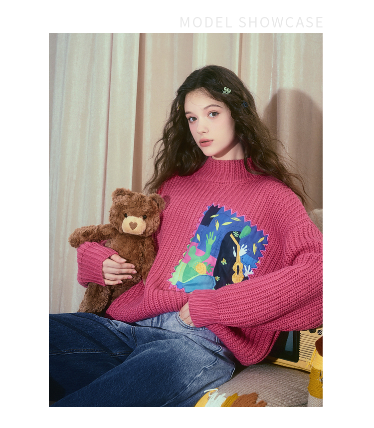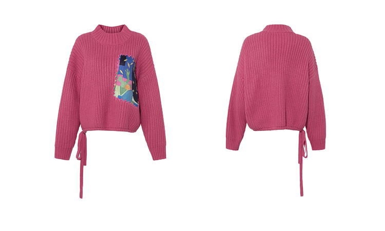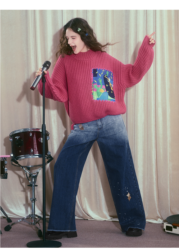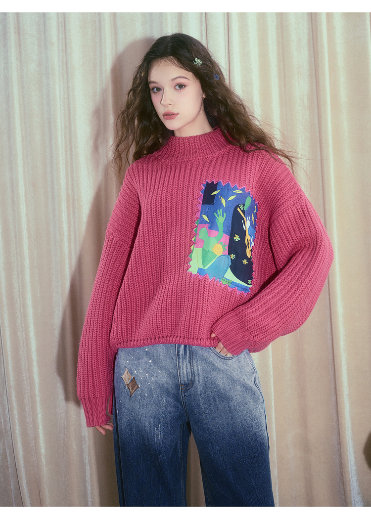 两三事 形意漫游 2025冬季新款抽象印花贴布绣抽绳下摆毛衣女宽松