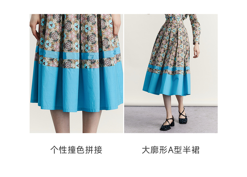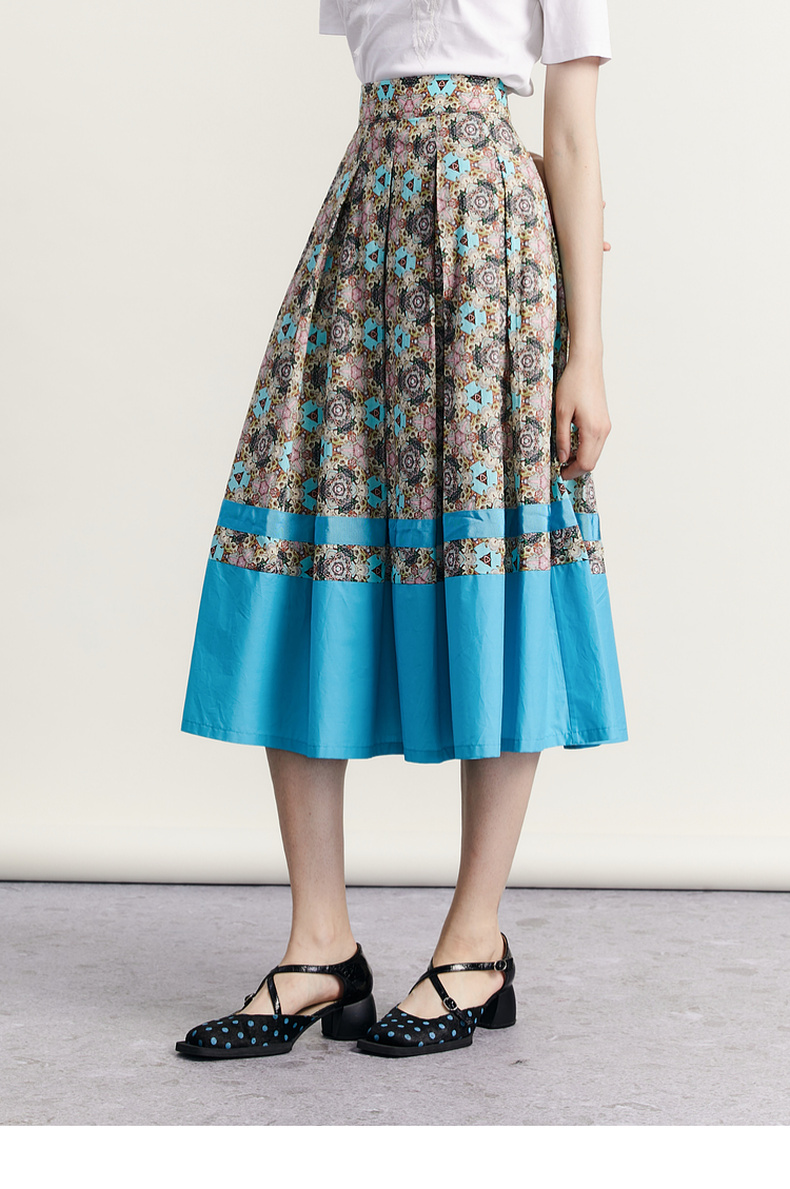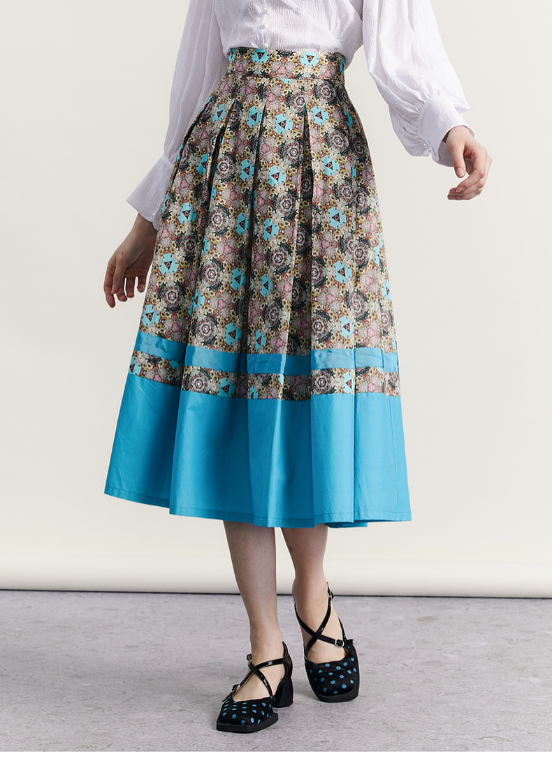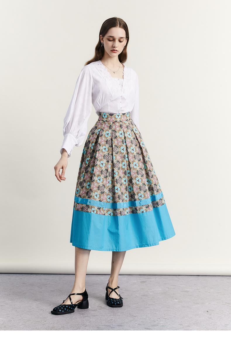 谜底文艺花色半裙2023秋新款复古浪漫棉质百褶A型半身裙233MB1043
