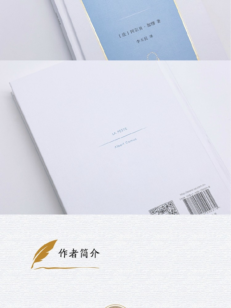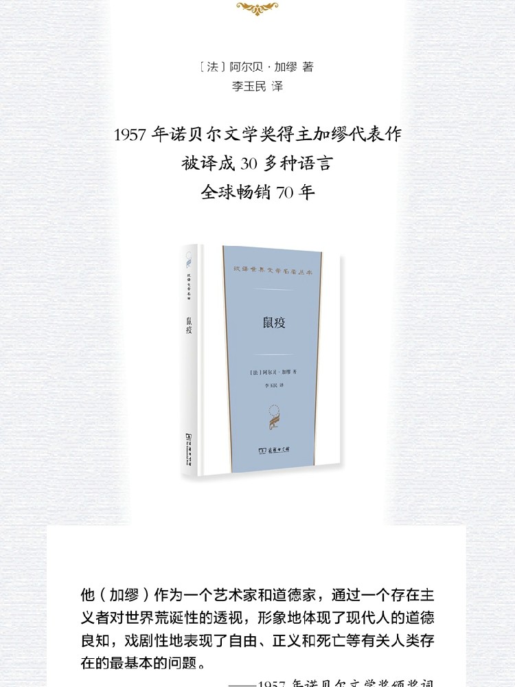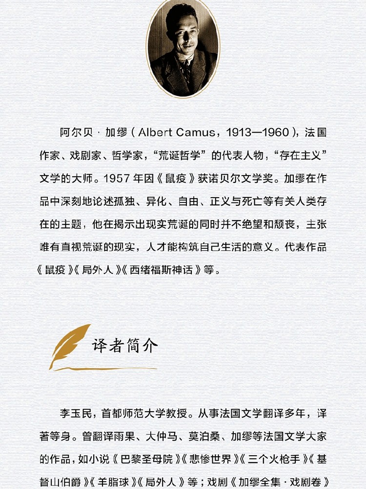 阿尔贝•加缪(Albert Camus,1913—1960), 法国作家、戏剧家、哲学家,“荒诞哲学”的代表人物,“存在主义”文学的大师。1957年因《鼠疫》获诺贝尔文学奖。加缪在作品中深刻地论述孤独、异化、自由、正义与死亡等有关人类存在的主题,他在揭示出现实荒诞的同时并不绝望和颓丧,主张唯有直视荒诞的现实,人才能构筑自己生活的意义。代表作品《鼠疫》《局外人》《西绪福斯神话》等。