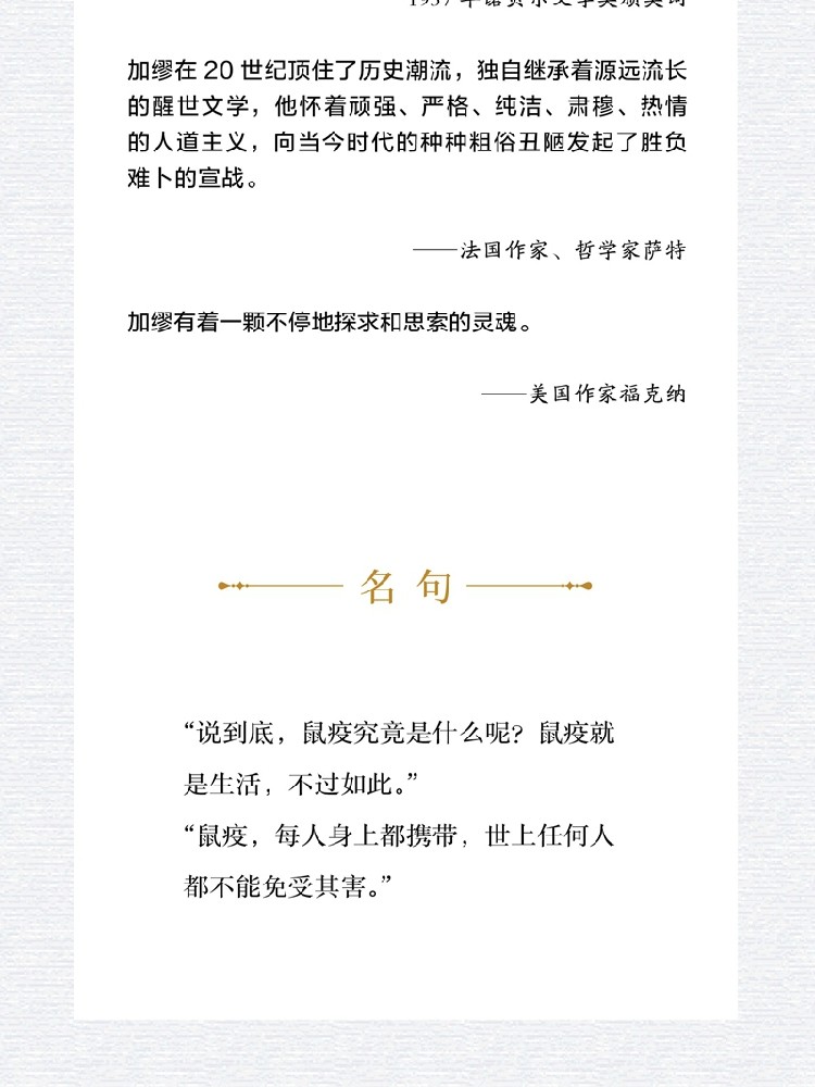 加缪在20世纪顶住了历史潮流,独自继承着源远流长的醒世文学,他怀着顽强、严格、纯洁、肃穆、热情的人道主义,向当今时代的种种粗俗丑陋发起了胜负难卜的宣战。