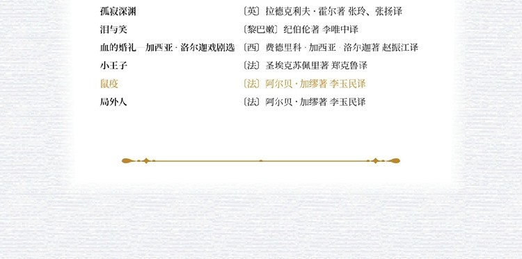 第一辑30种:《伊索寓言》《一千零一夜》《托尔梅斯河的拉撒路》《培根随笔全集》《伯爵家书》《弃儿汤姆•琼斯史》《少年维特的烦恼》《傲慢与偏见》《红与黑》《欧也妮•葛朗台 高老头》《普希金诗选》《巴黎圣母院》《大卫•考坡菲》《双城记》《呼啸山庄》《猎人笔记》《恶之花》《茶花女》《战争与和平》《德伯家的苔丝》《伤心之家》《尼尔斯骑鹅旅行记》《泰戈尔诗集:新月集•飞鸟集》《生命与希望之歌》《孤寂深渊》《泪与笑》《血的婚礼:加西亚•洛尔迦戏剧选》《小王子》《鼠疫》《局外人》。