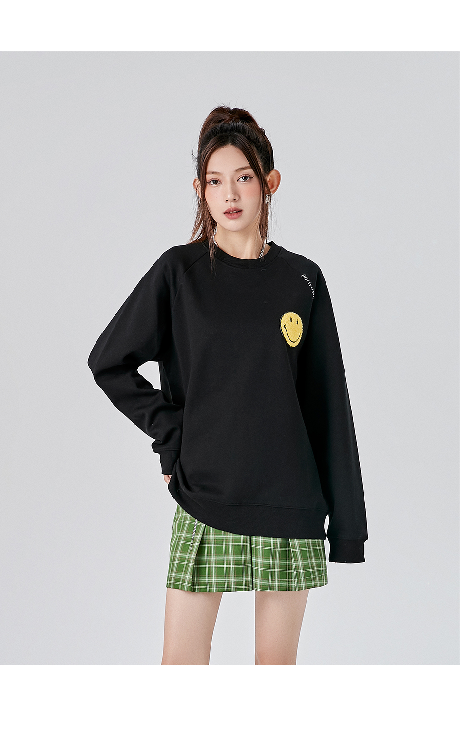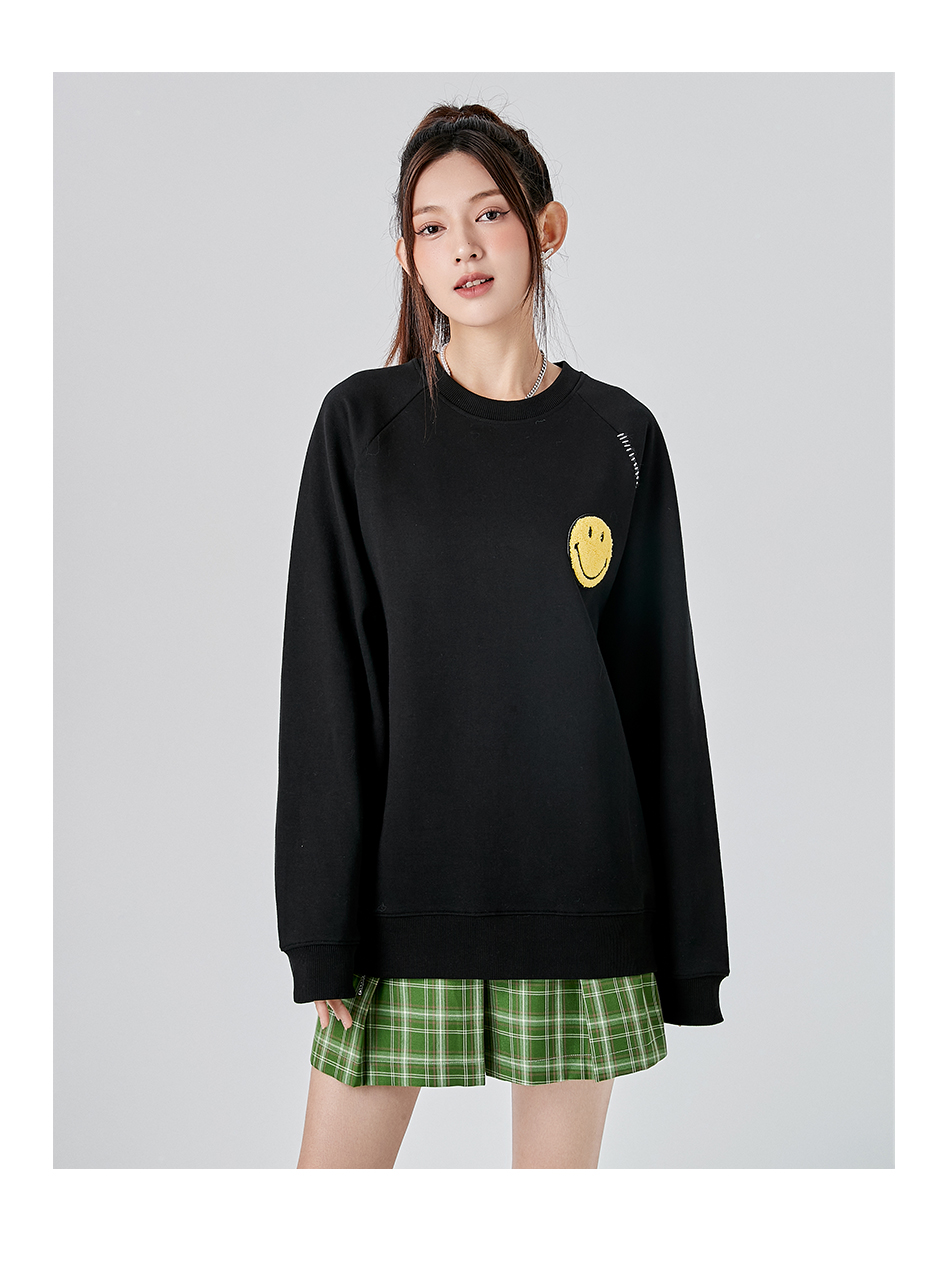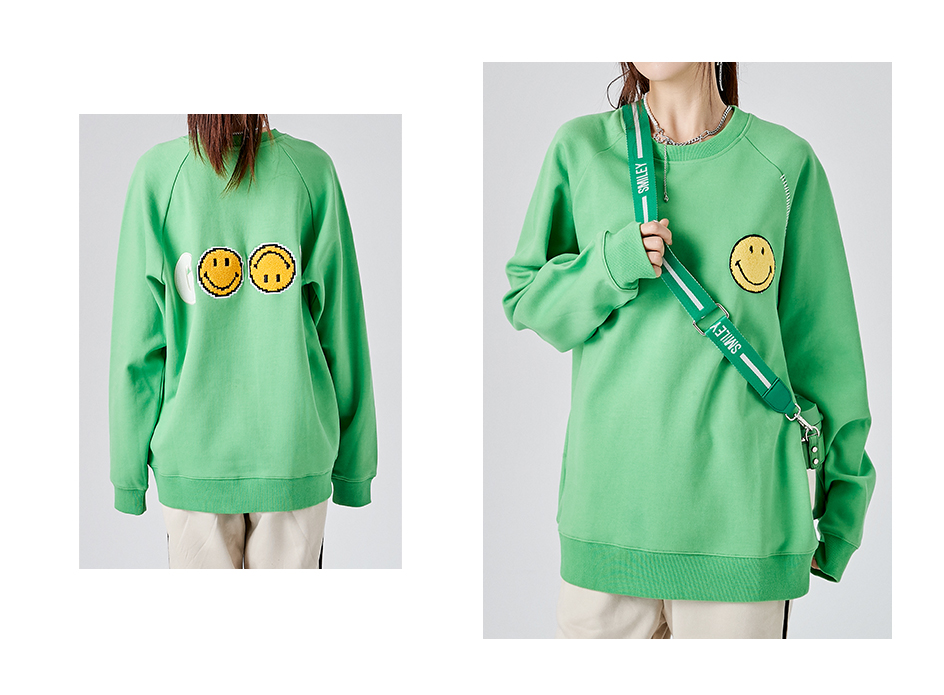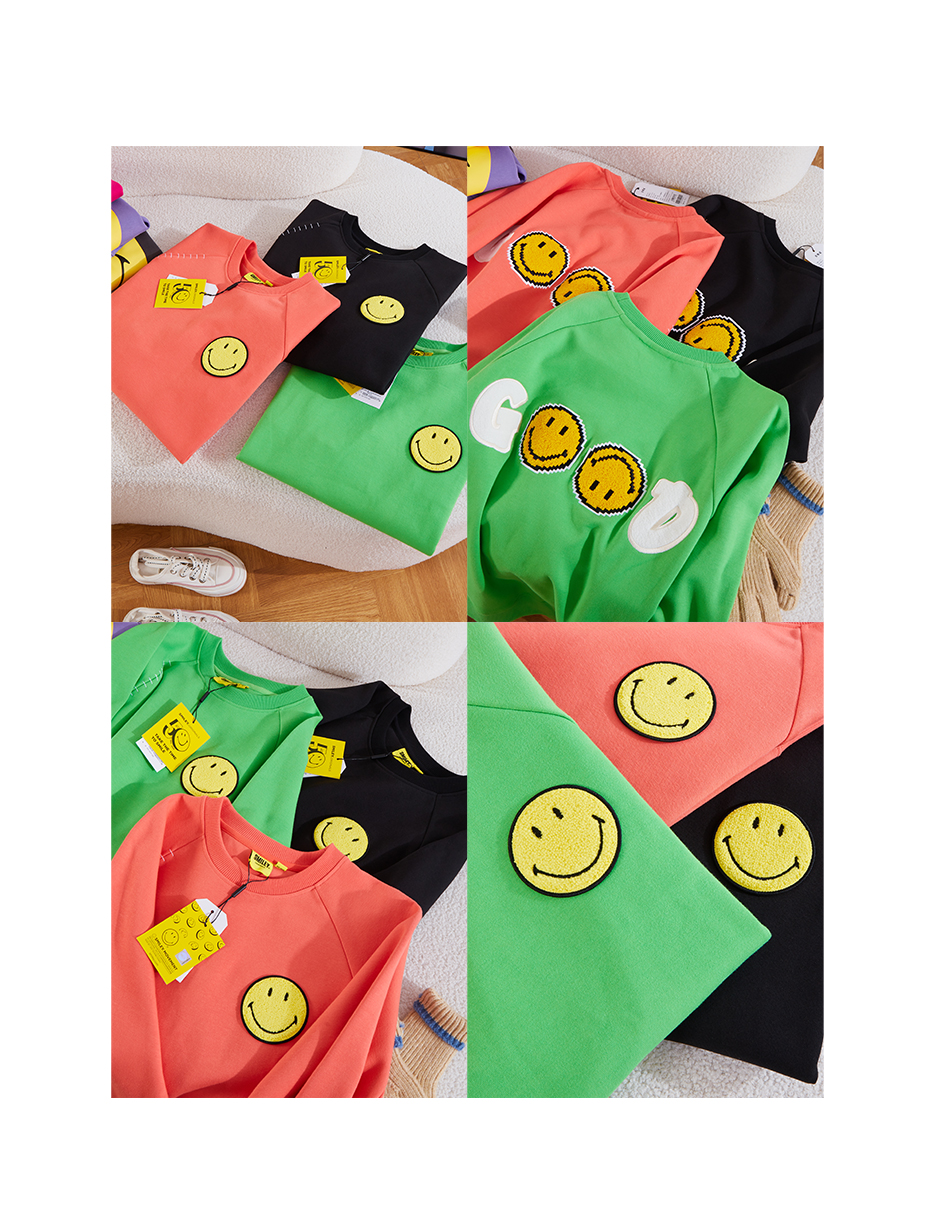 【品名】:字母印花笑脸毛巾刺绣圆领卫衣