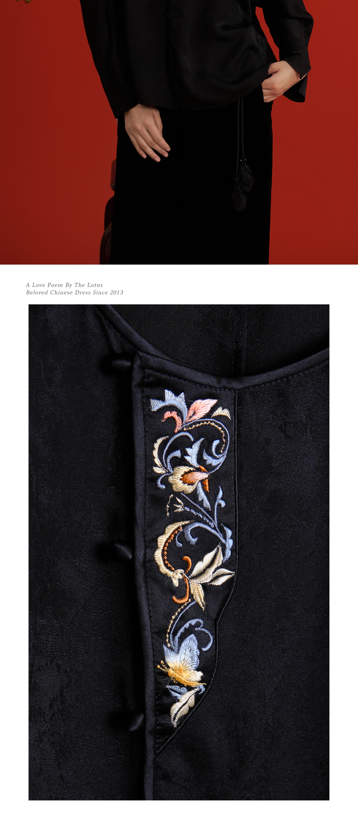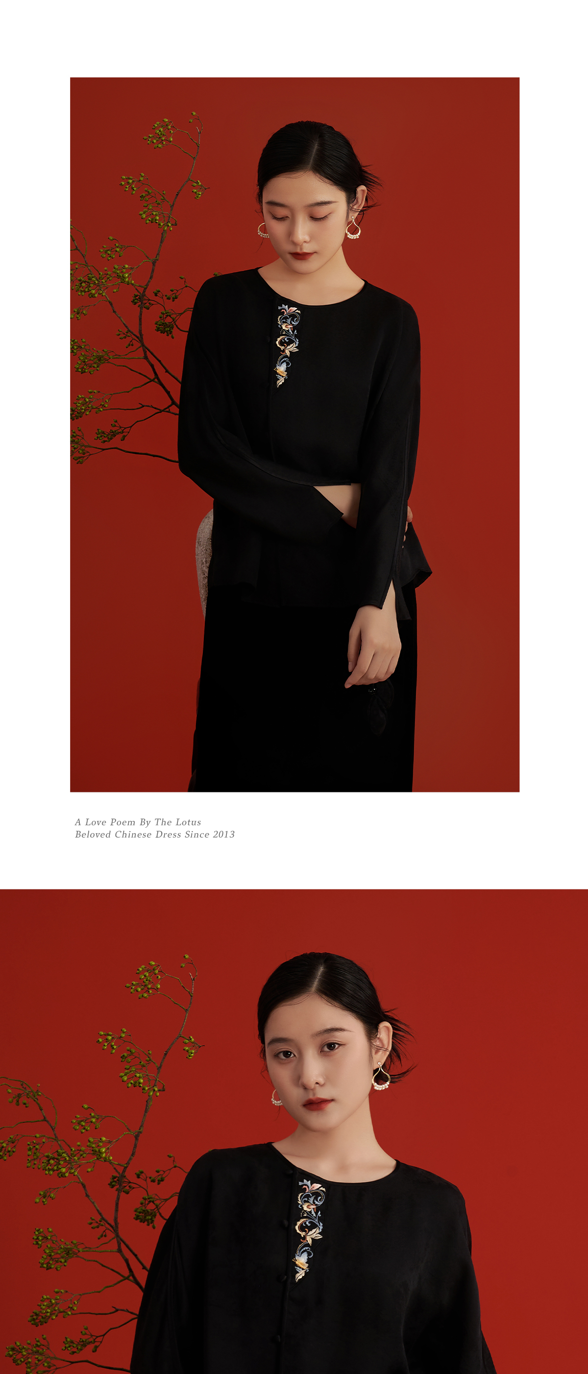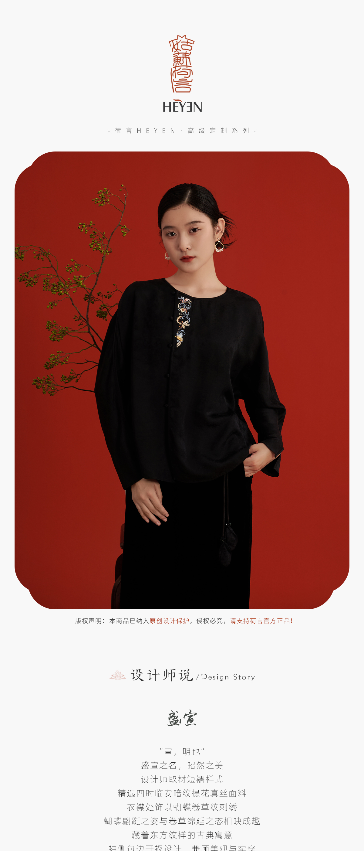荷言HEYEN 盛宣 四时临安暗纹真丝混纺黑色上衣蝴蝶卷草纹刺绣开叉设计