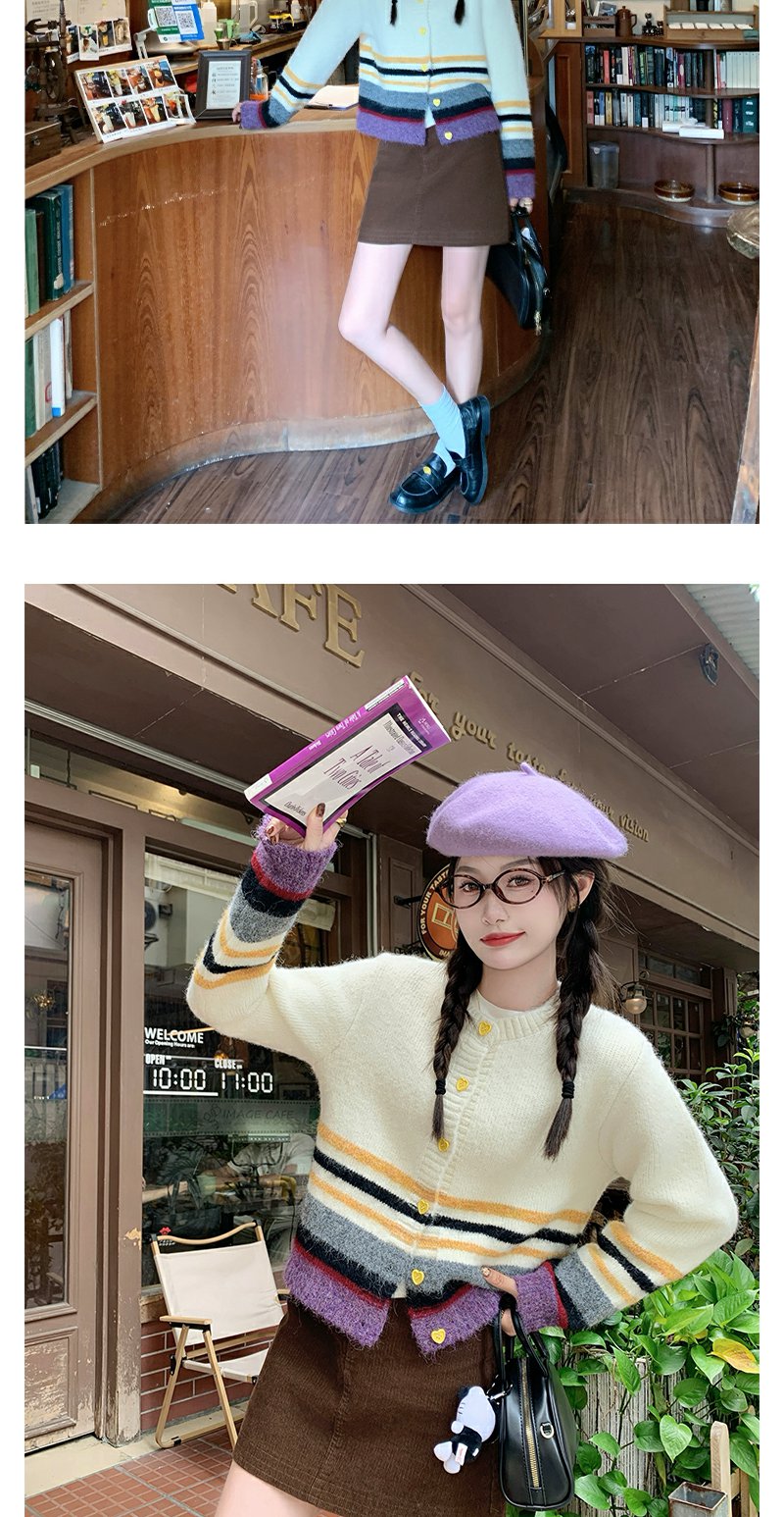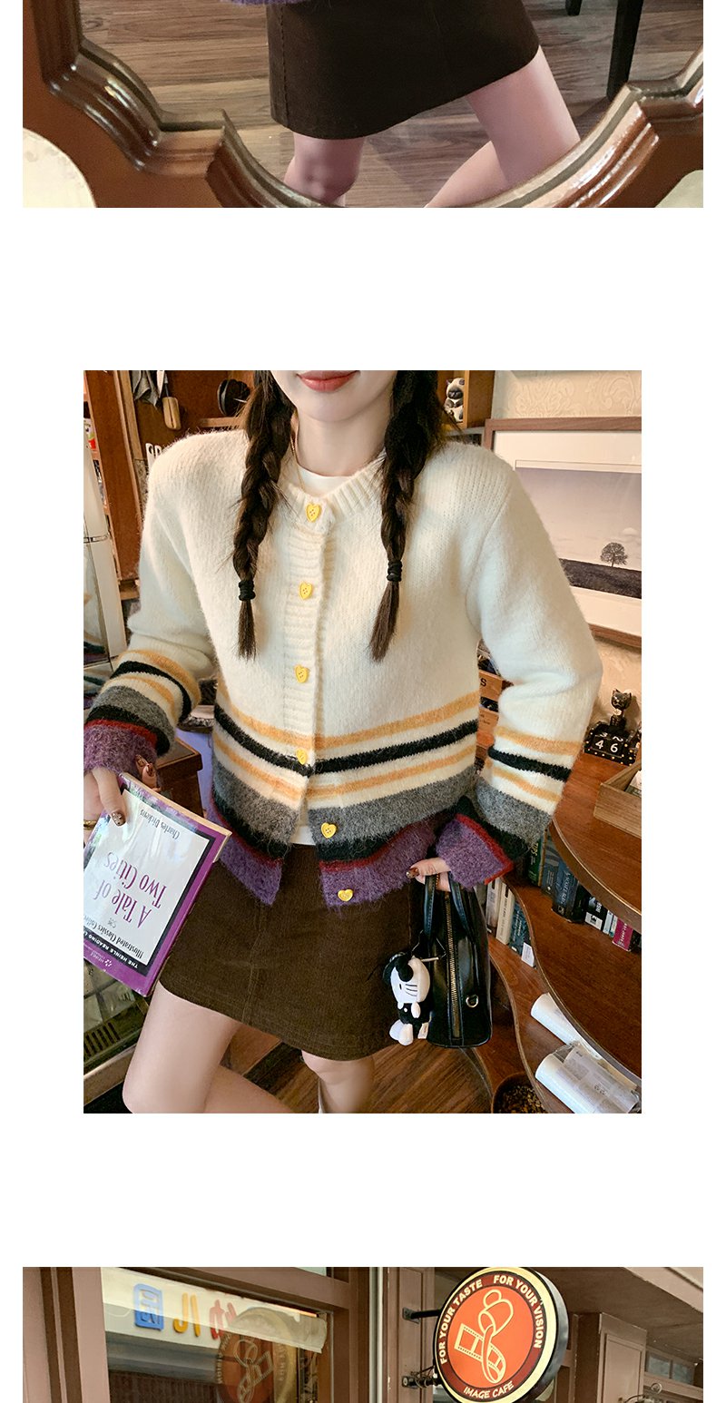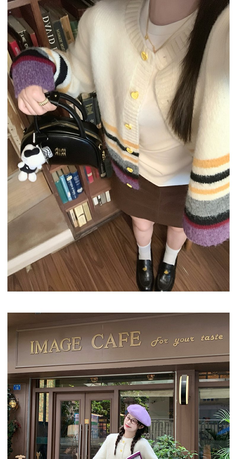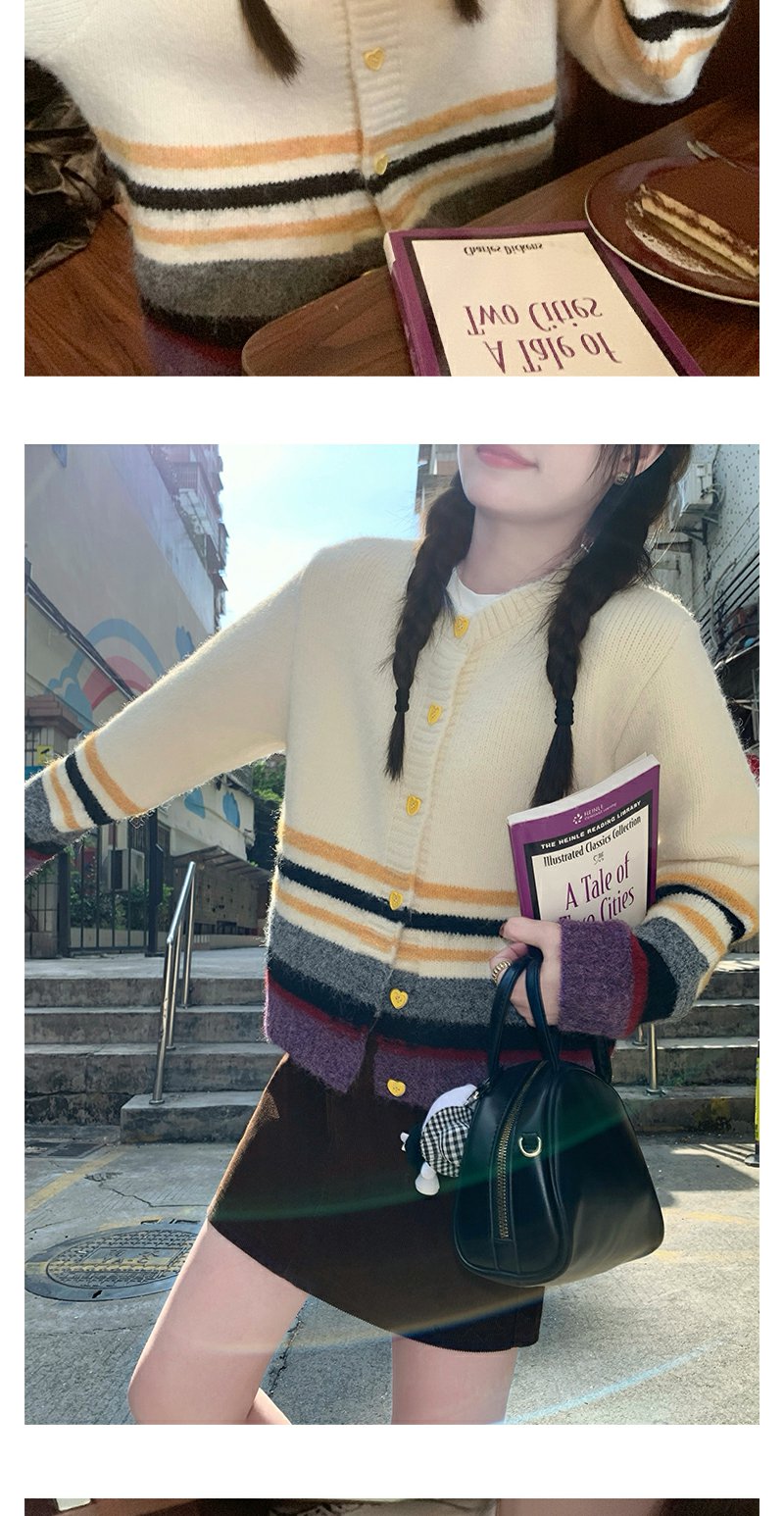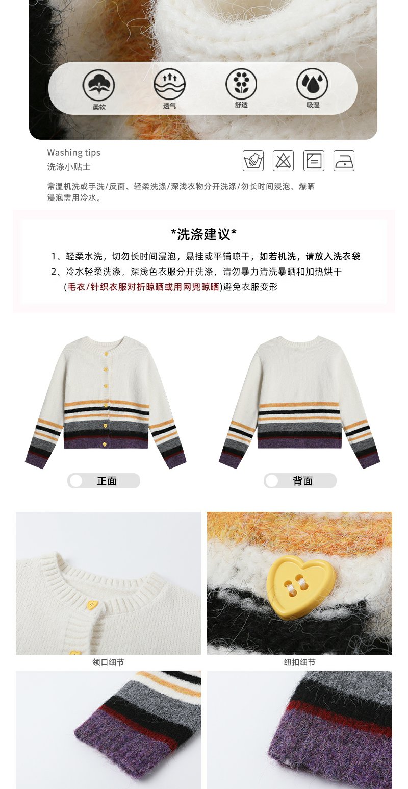 【169元任选2件】现货!杏色下摆撞色条纹系扣毛衣