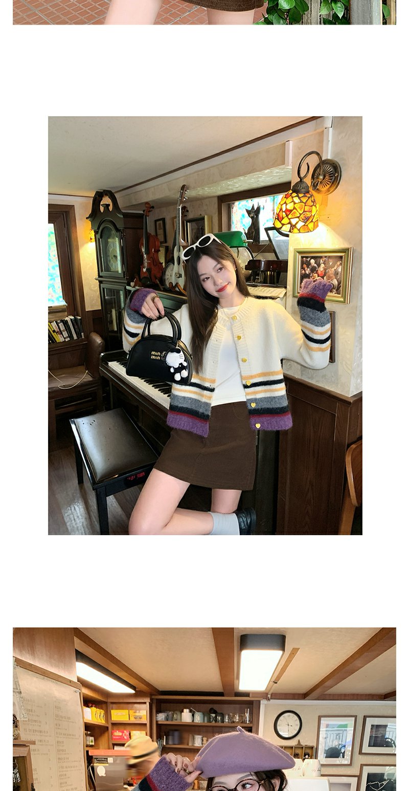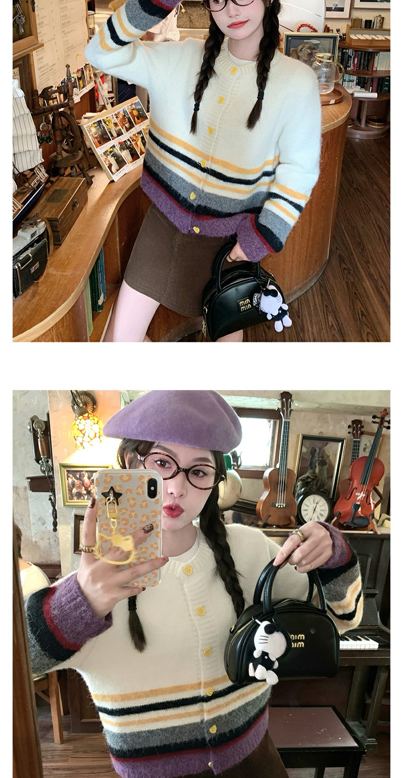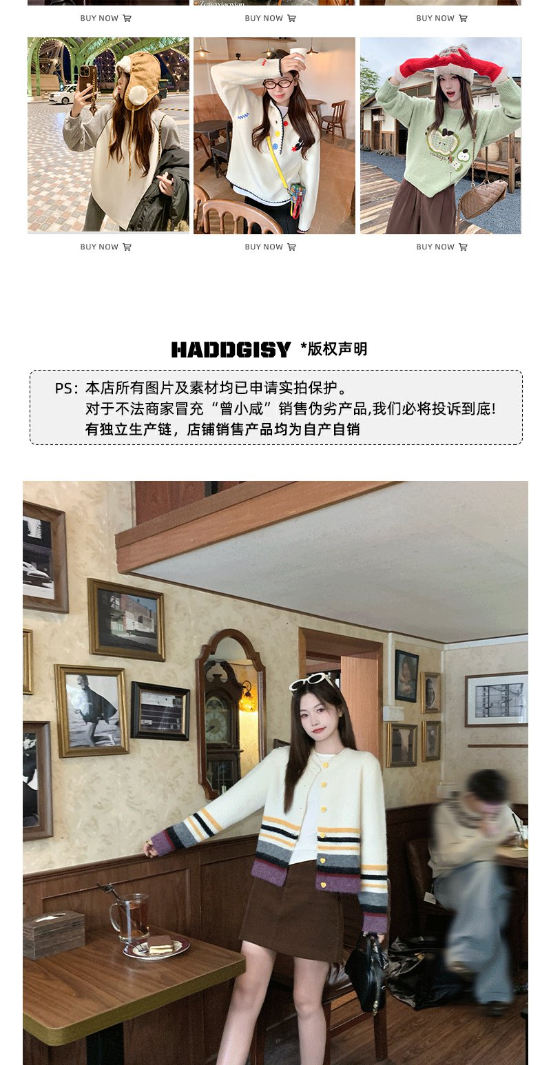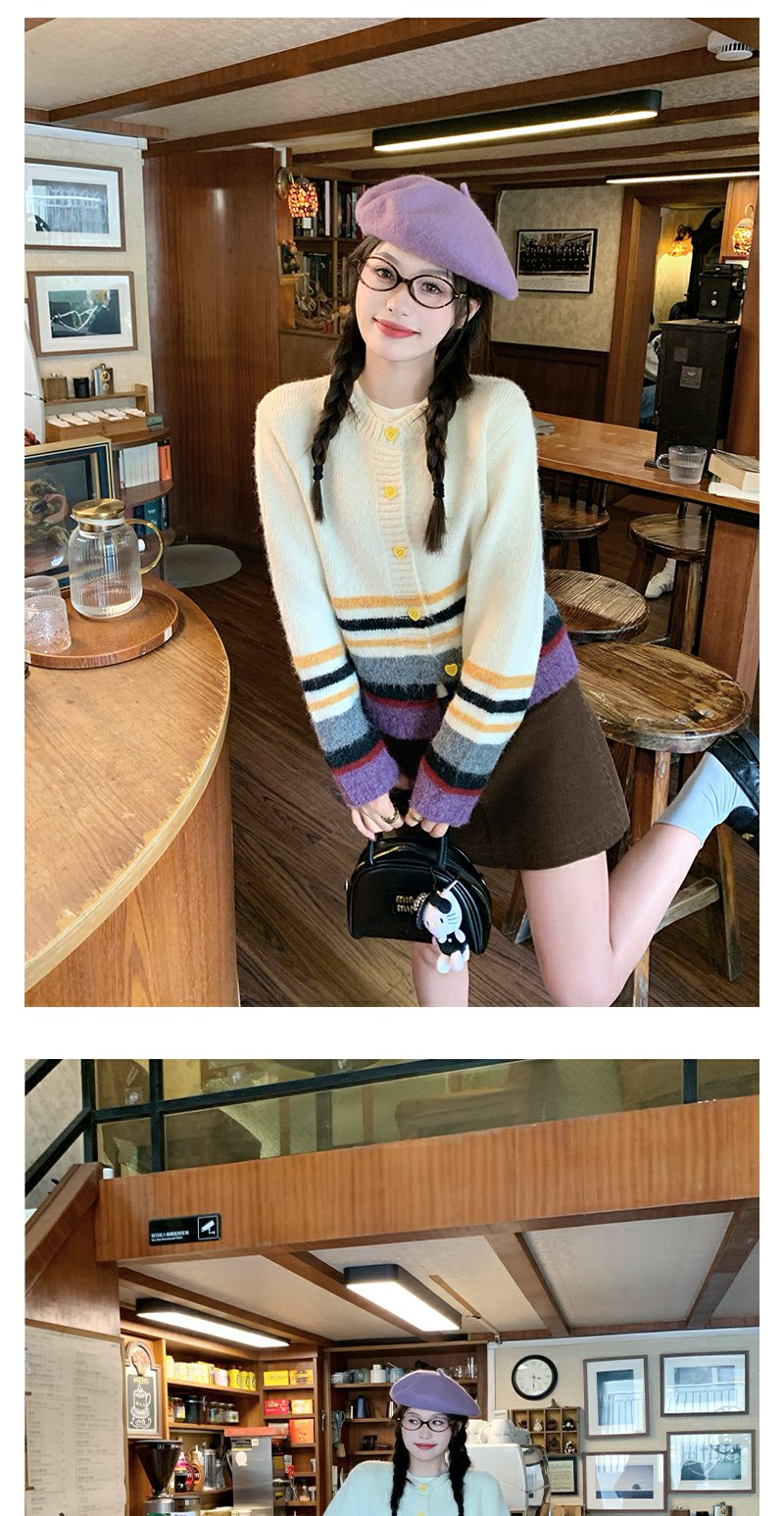 【169元任选2件】现货!杏色下摆撞色条纹系扣毛衣