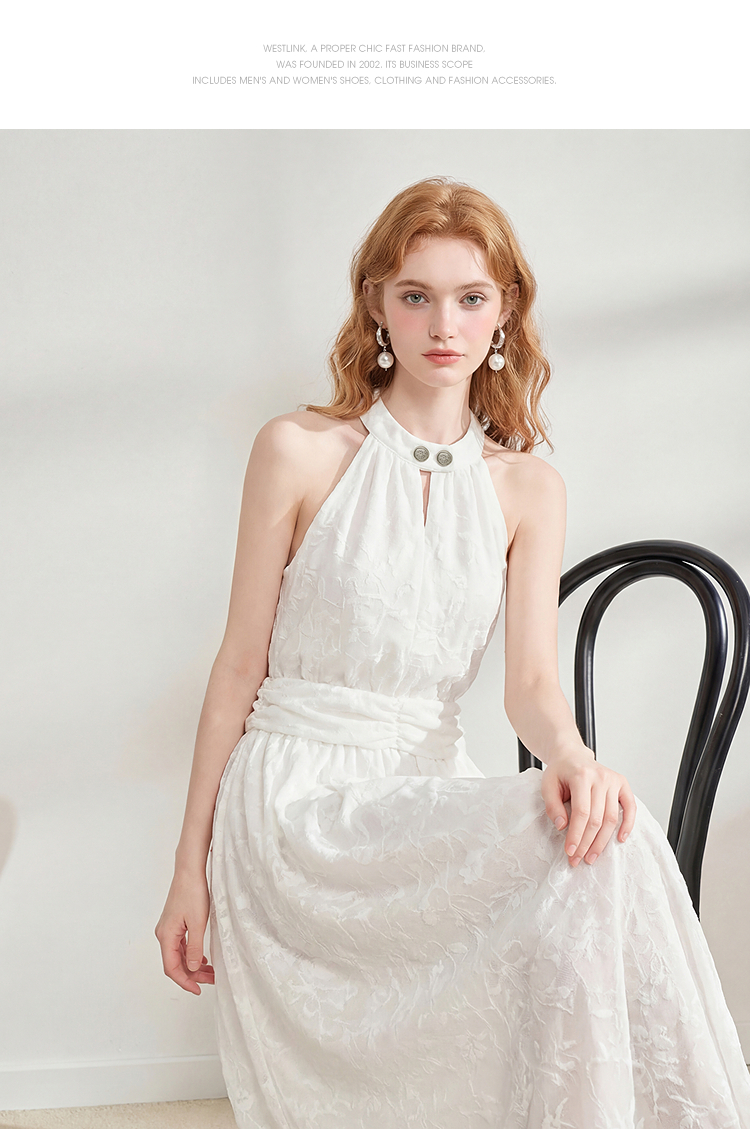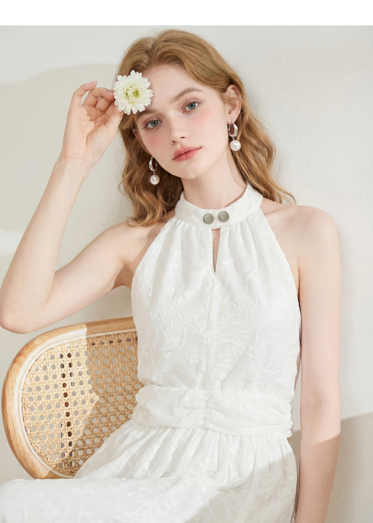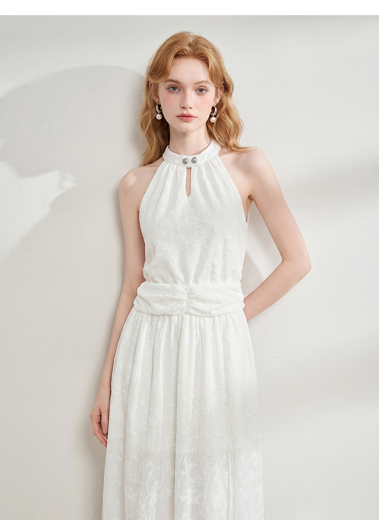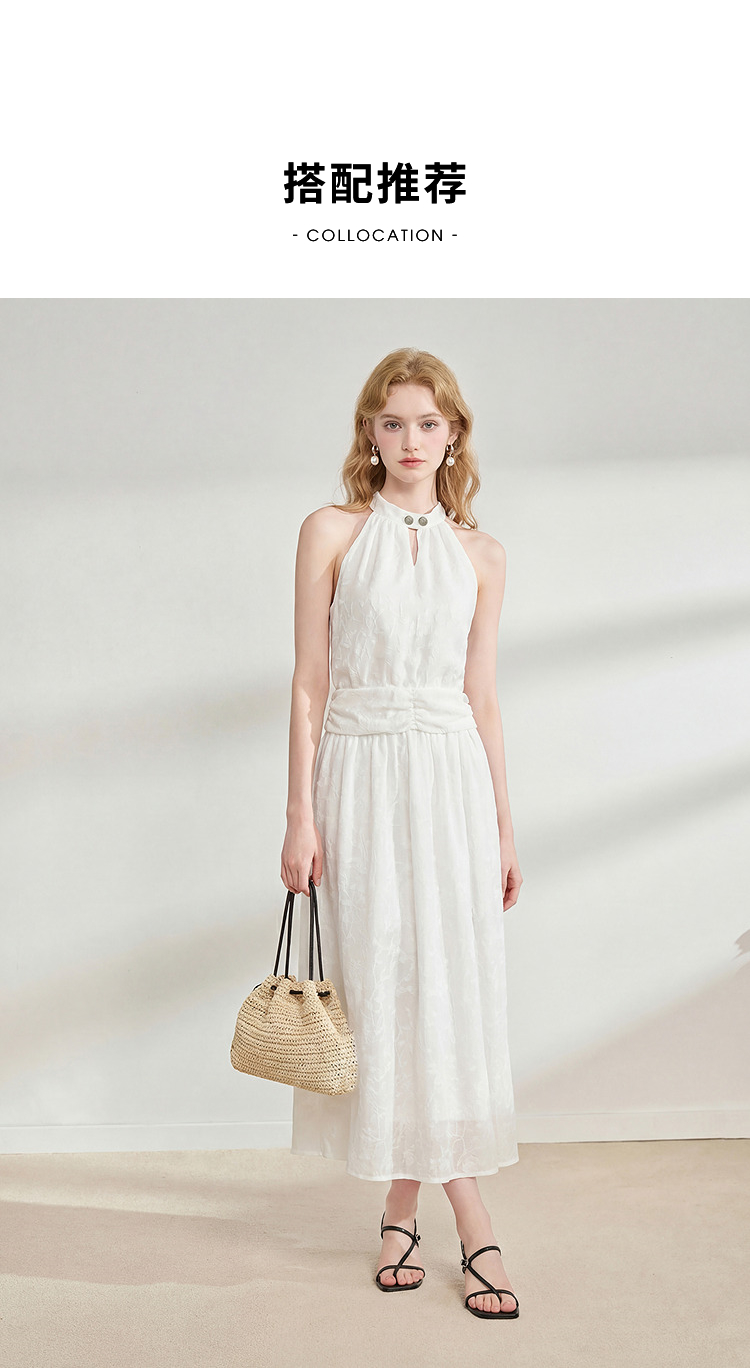 西遇挂脖无袖连衣裙女2026夏新款水滴领镂空提花收腰显瘦开衩长裙E0060267