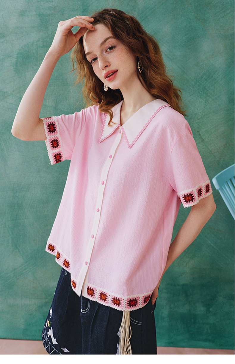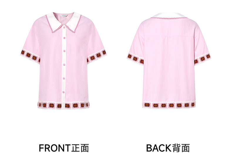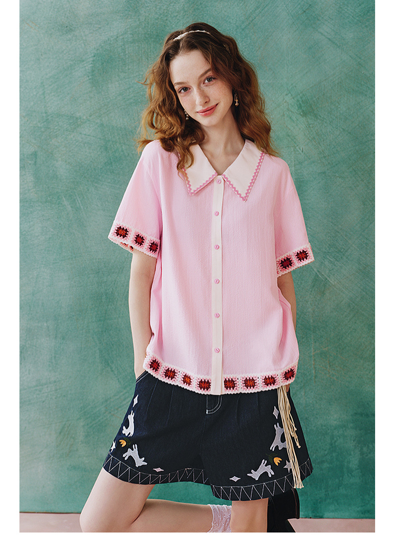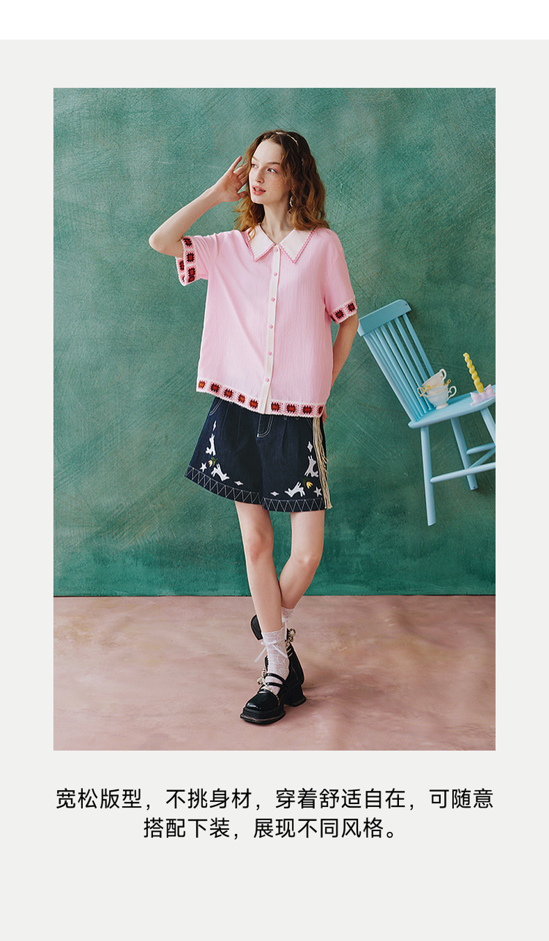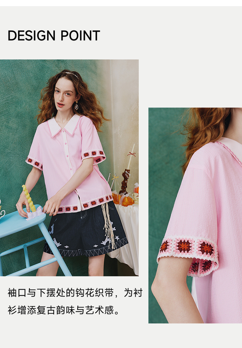 两三事草莓芝士2025夏新款森女风镂空勾花织带拼接短袖衬衫女宽松