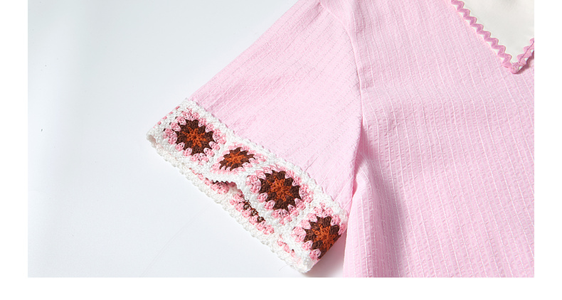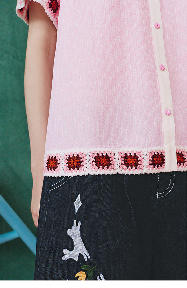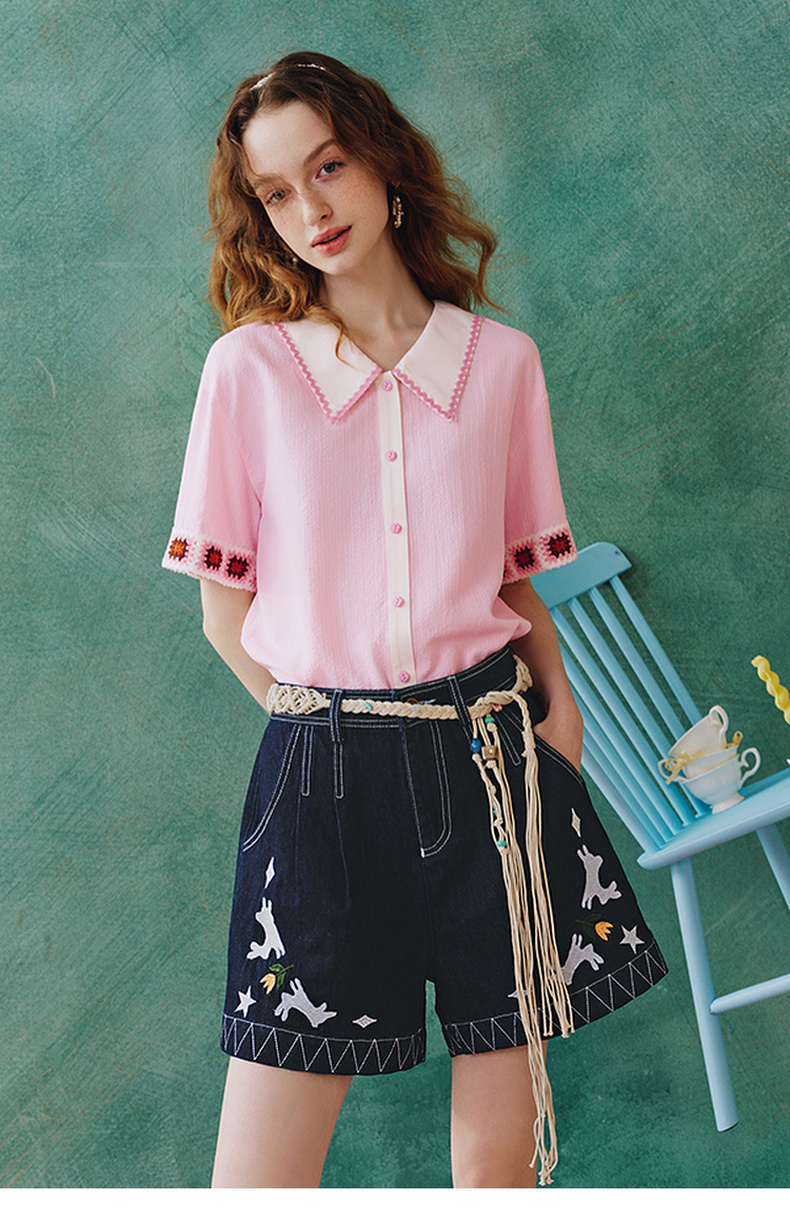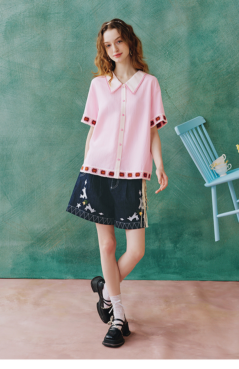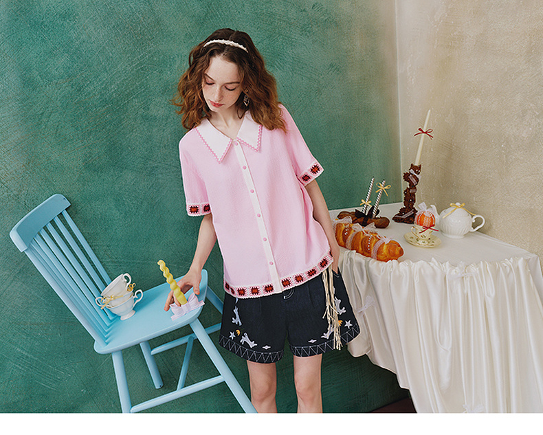 两三事草莓芝士2025夏新款森女风镂空勾花织带拼接短袖衬衫女宽松