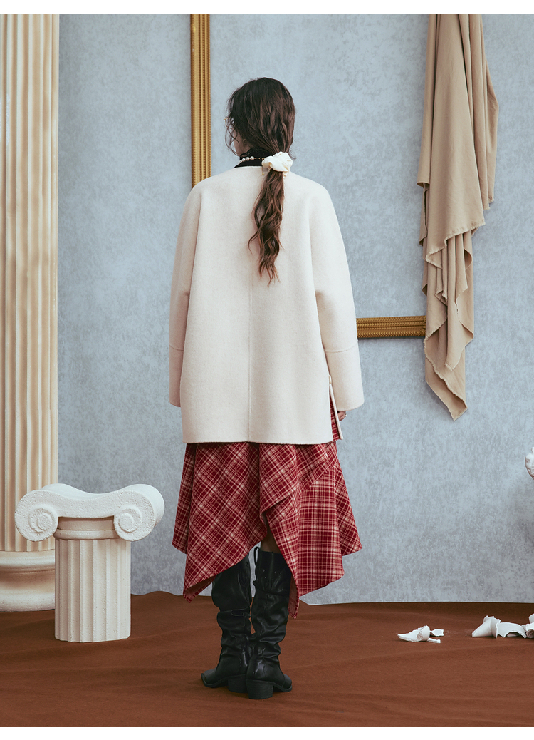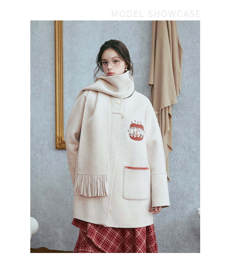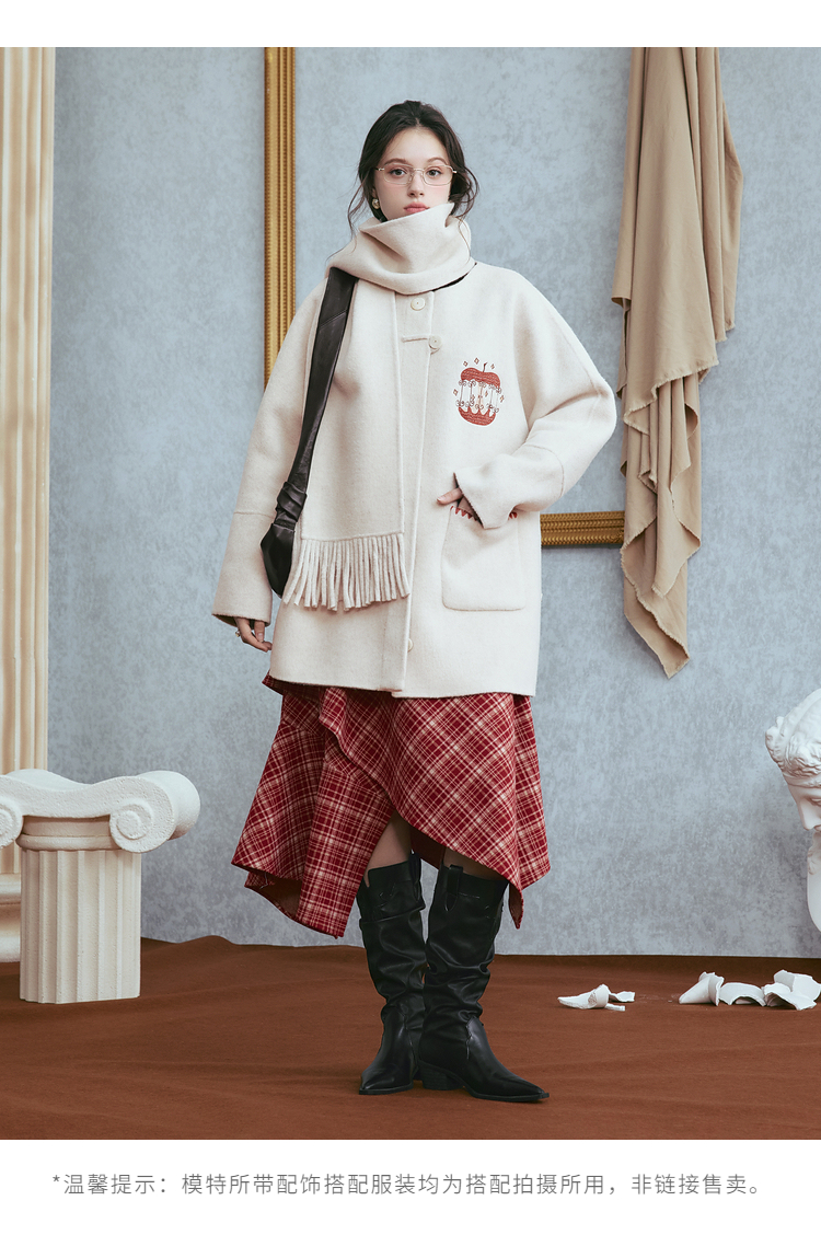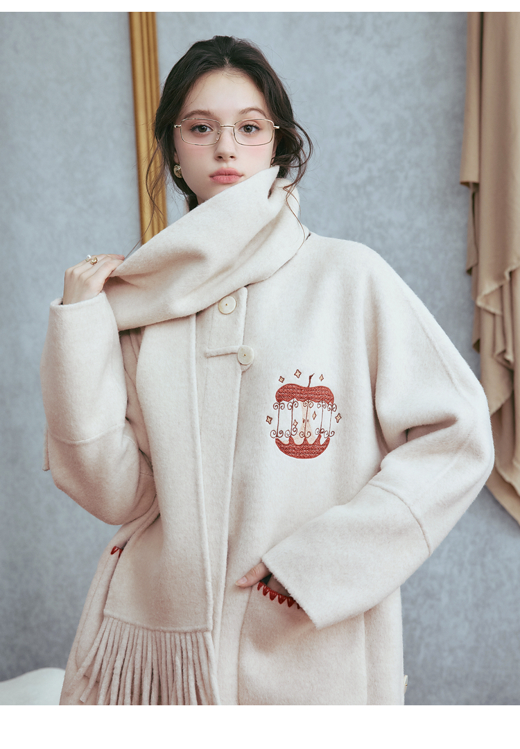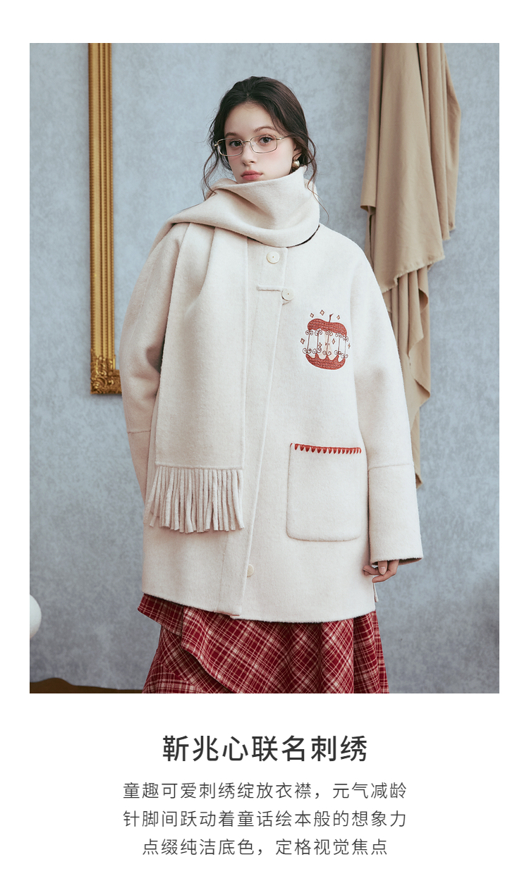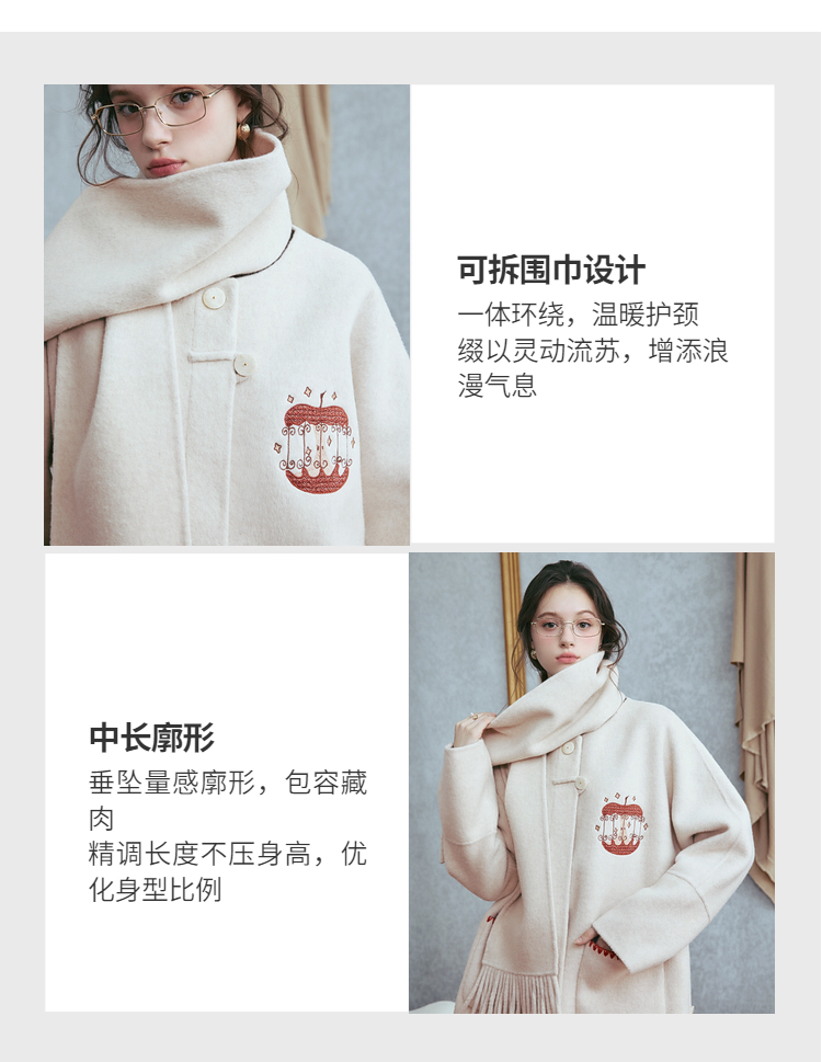 【暖冬内购】两三事 云间告白 2025冬季新款甜美刺绣可拆围巾双面羊毛呢外套女