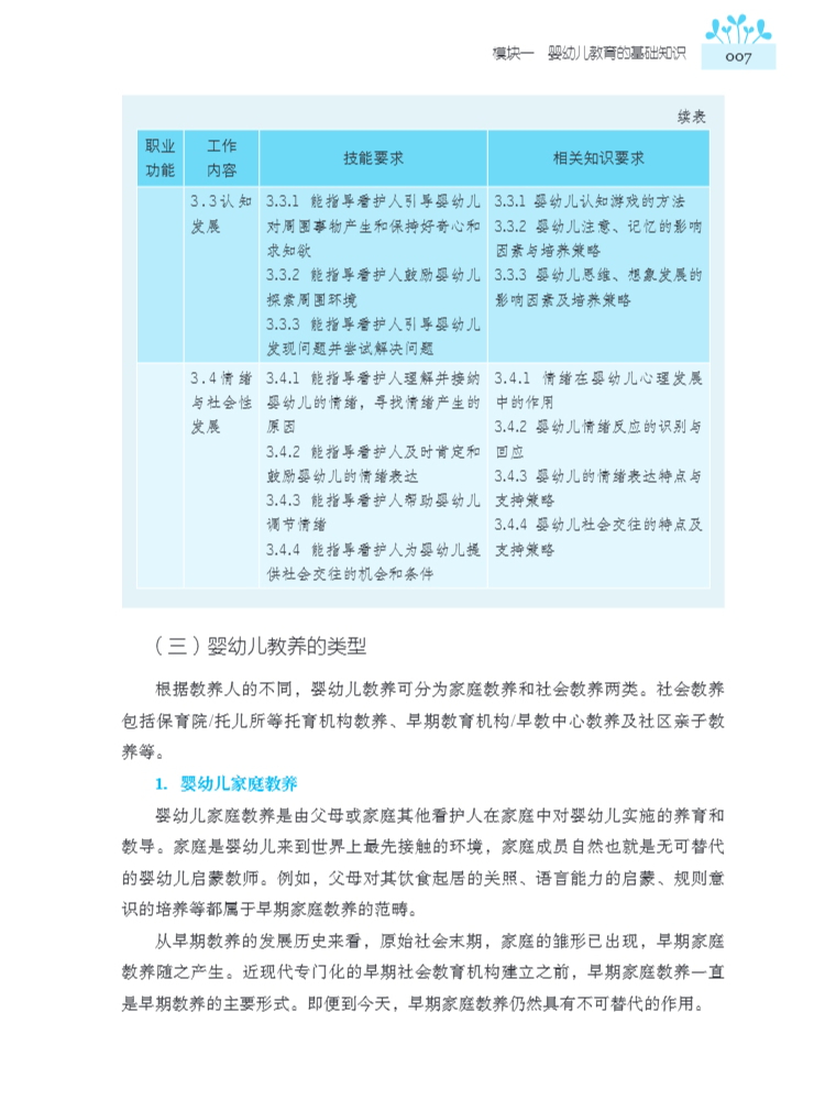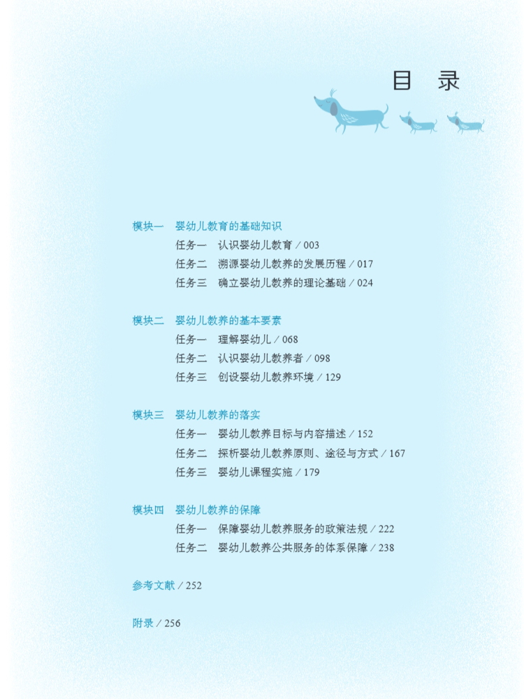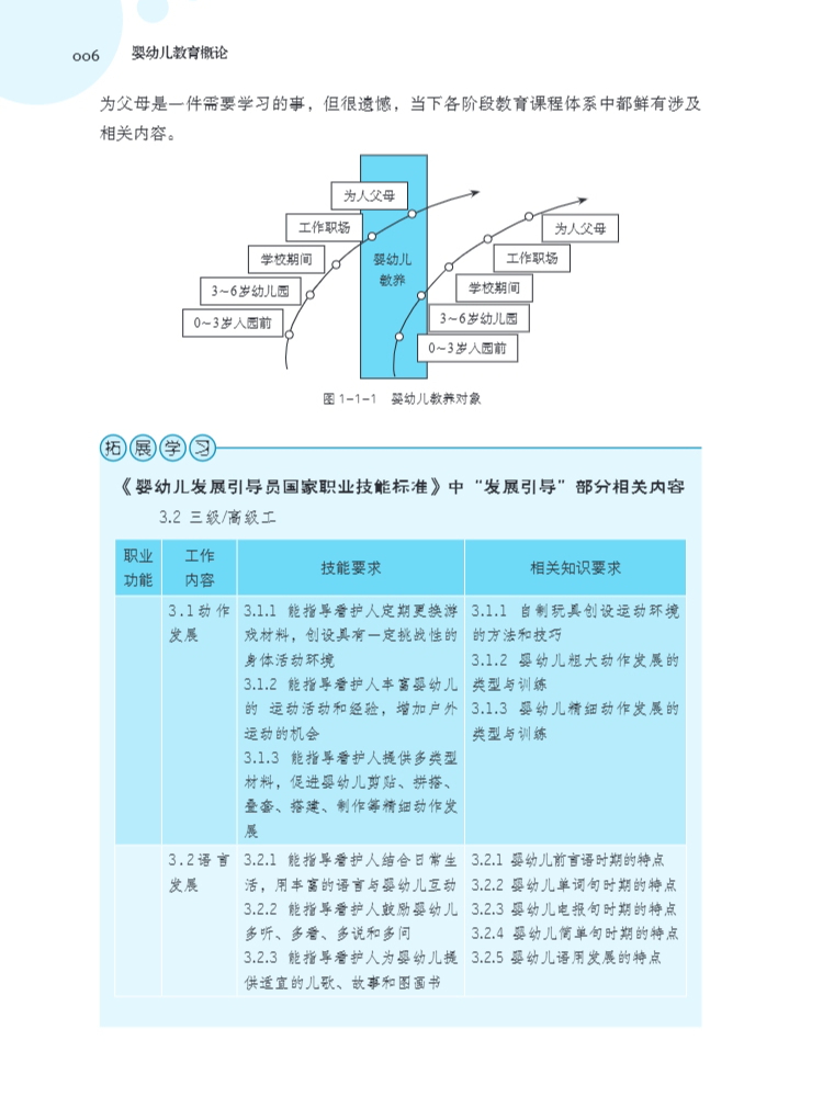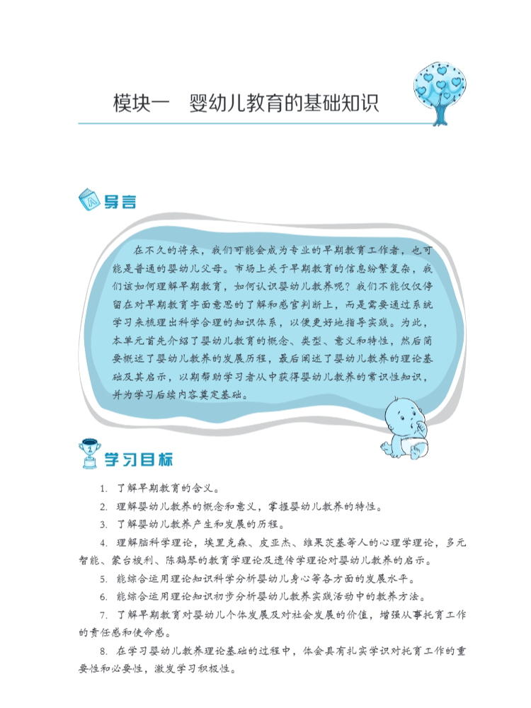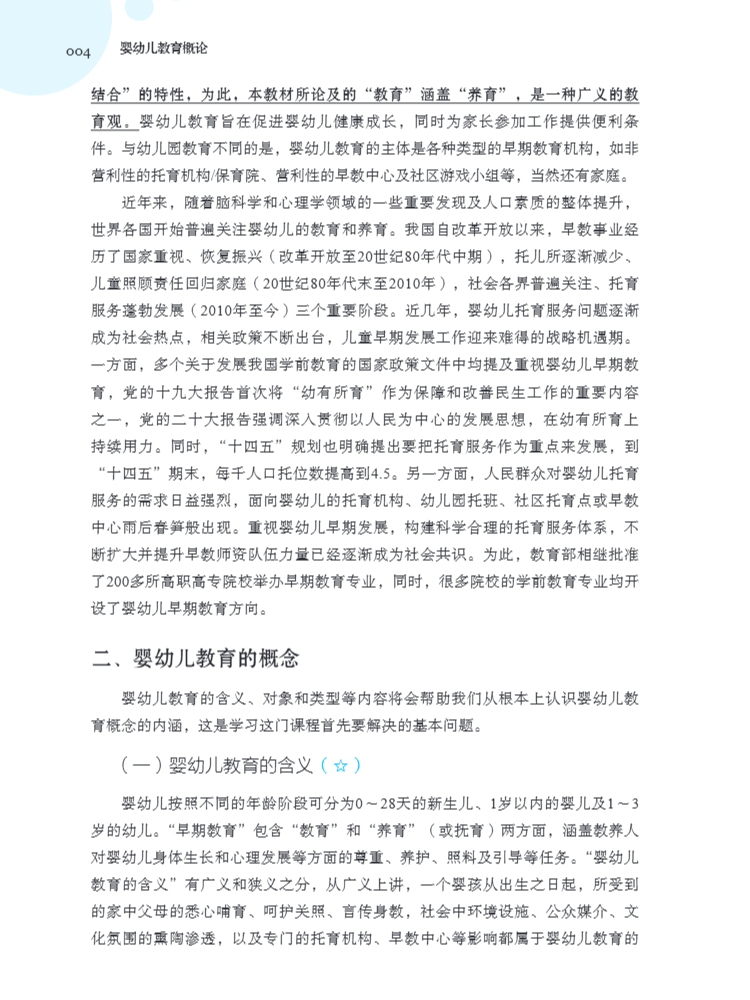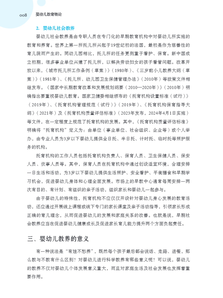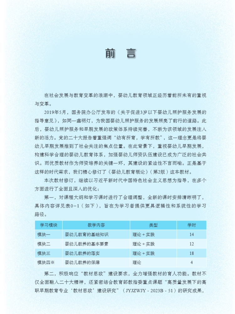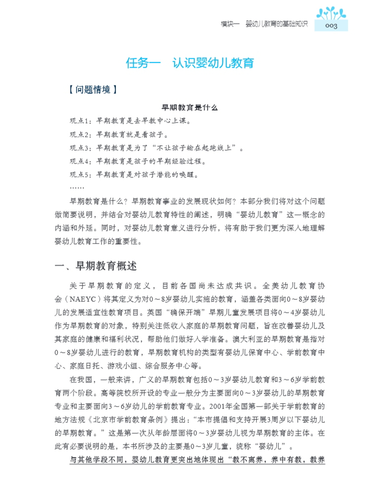 本教材深入贯彻《国务院办公厅关于促进3岁以下婴幼儿照护服务发展的指导意见》,联系早期教育一线实际,结合专业教学需求,系统介绍了0~3岁婴幼儿养育与教育中最基本、最核心的规律性问题,主要内容包括0~3岁婴幼儿教育的基础知识、基本要素、组织与落实以及保障体系四部分。教材注重“理实一体”,随文提供形式多样的数字资源,学习者可扫描二维码观看或收听,便于其巩固和拓展所学内容。本书可作为早期教育相关专业教材,还可供早期教育机构(含托育机构)的工作者及广大0~3岁婴幼儿父母参考使用。