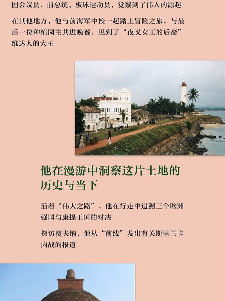※他拥有多数旅行者无法获得的访问权限:在科伦坡,他深度体验僧伽罗族精英的社交生活,采访国会议员、前总统、板球运动员,觉察到了伟人的源起;在其他地方,他与前海军中校一起踏上冒险之旅,与最后一位种植园主共进晚餐,见到了“夜叉女王的后裔”维达人的大王