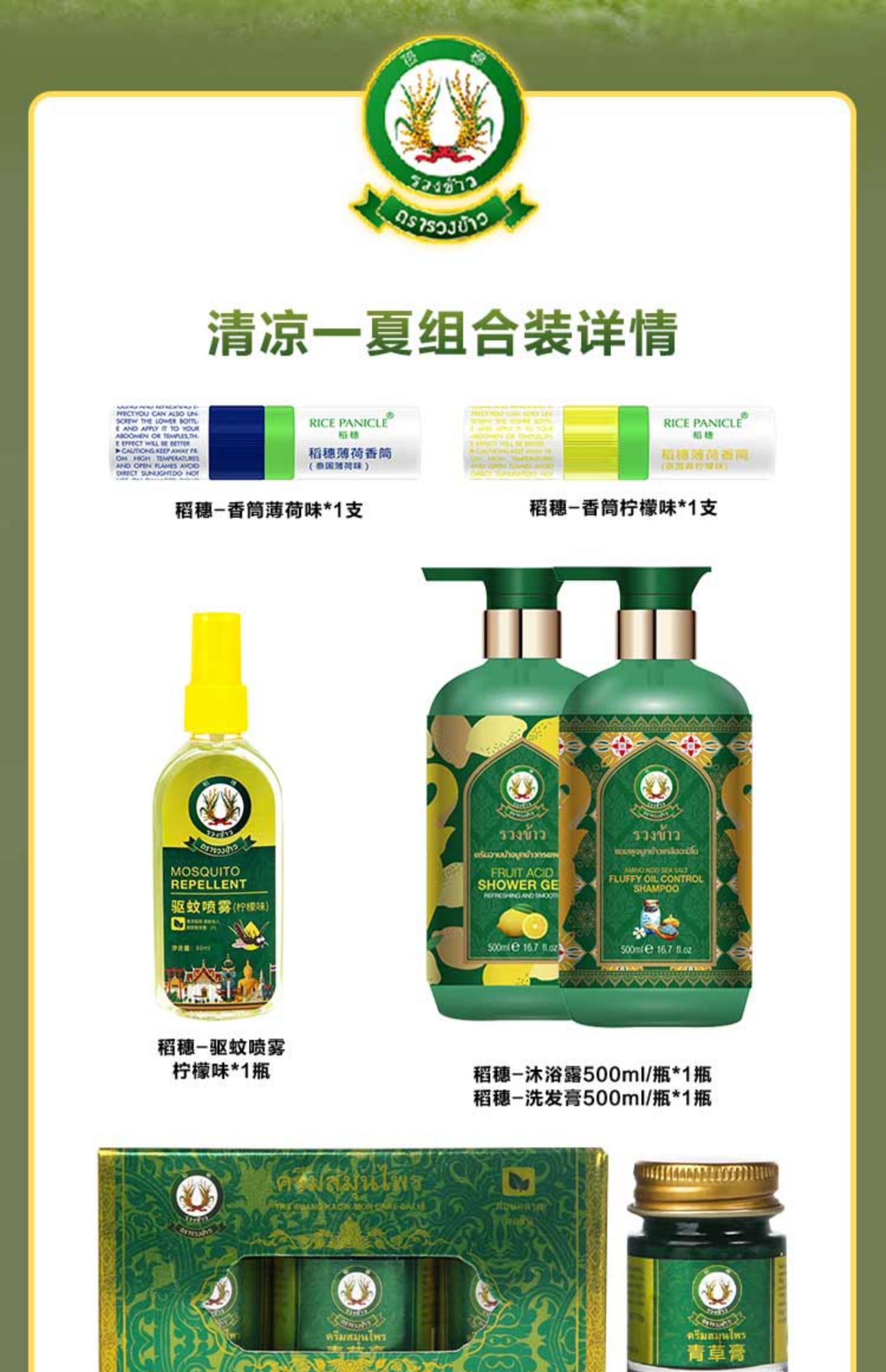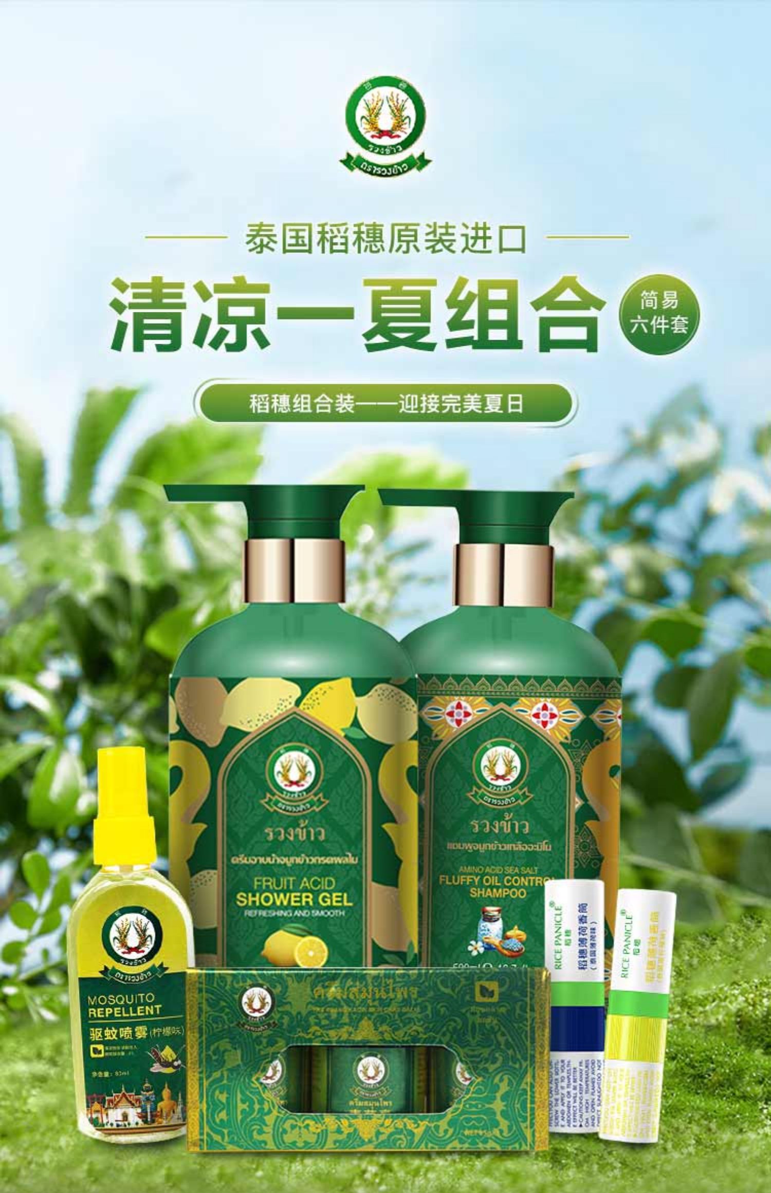 泰国稻穗清凉一夏组合 简易6件套(沐浴露500ml+洗发膏500ml+驱蚊喷雾80ml+青草膏15g*3+香筒2ml*2)