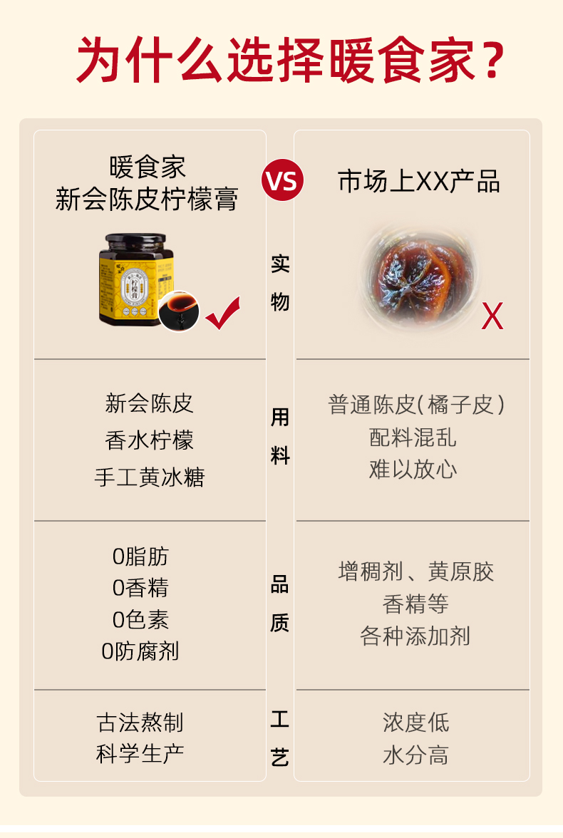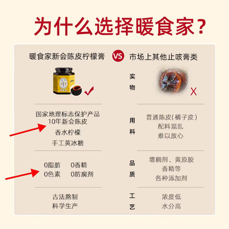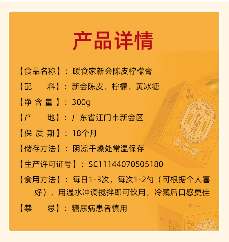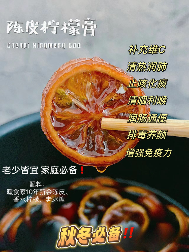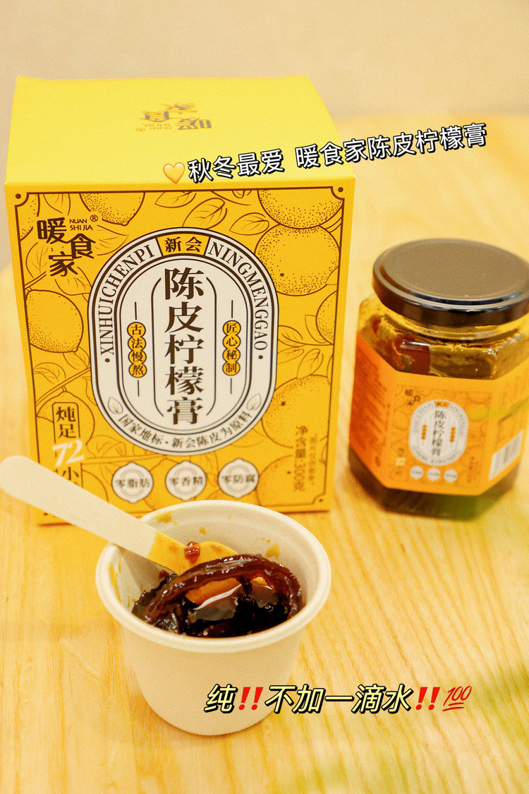 暖食家新会陈皮柠檬膏选用国家地理标志保护产品-新会10年陈皮为原料,辅以优选香水柠檬、手工黄冰糖,72小时隔水古法熬制而成❗️