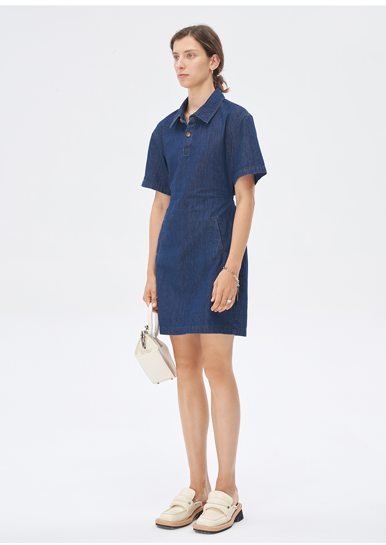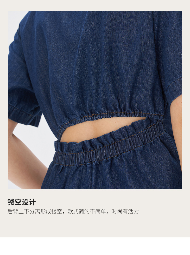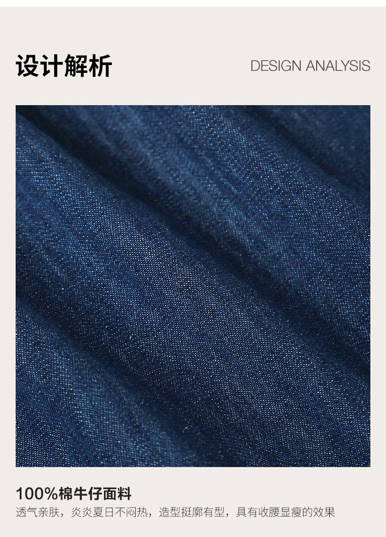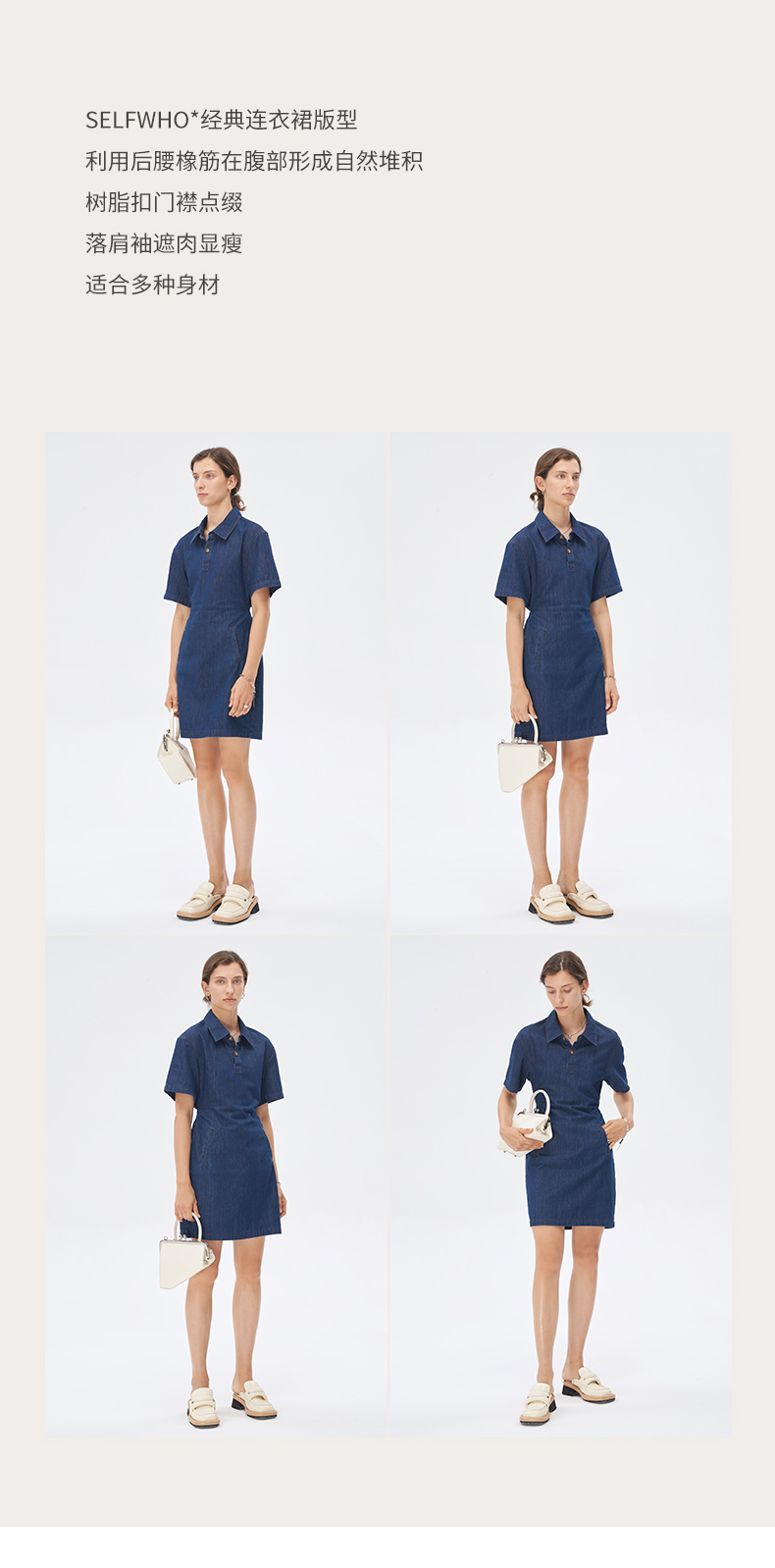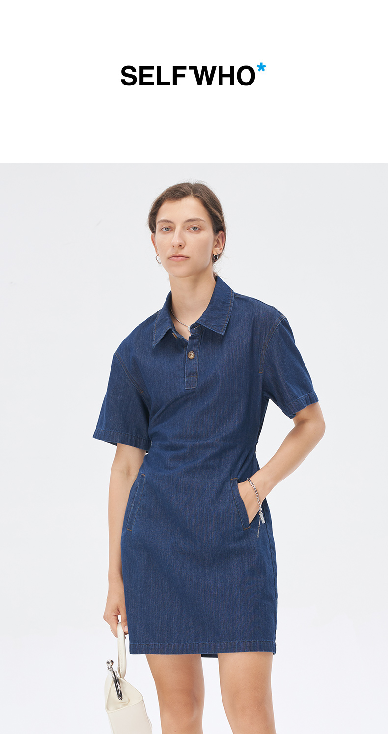 Self Who深海蓝纯棉牛仔连衣裙2023新款夏高级感落肩袖小个子裙子