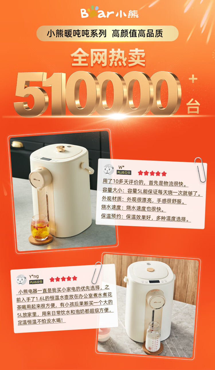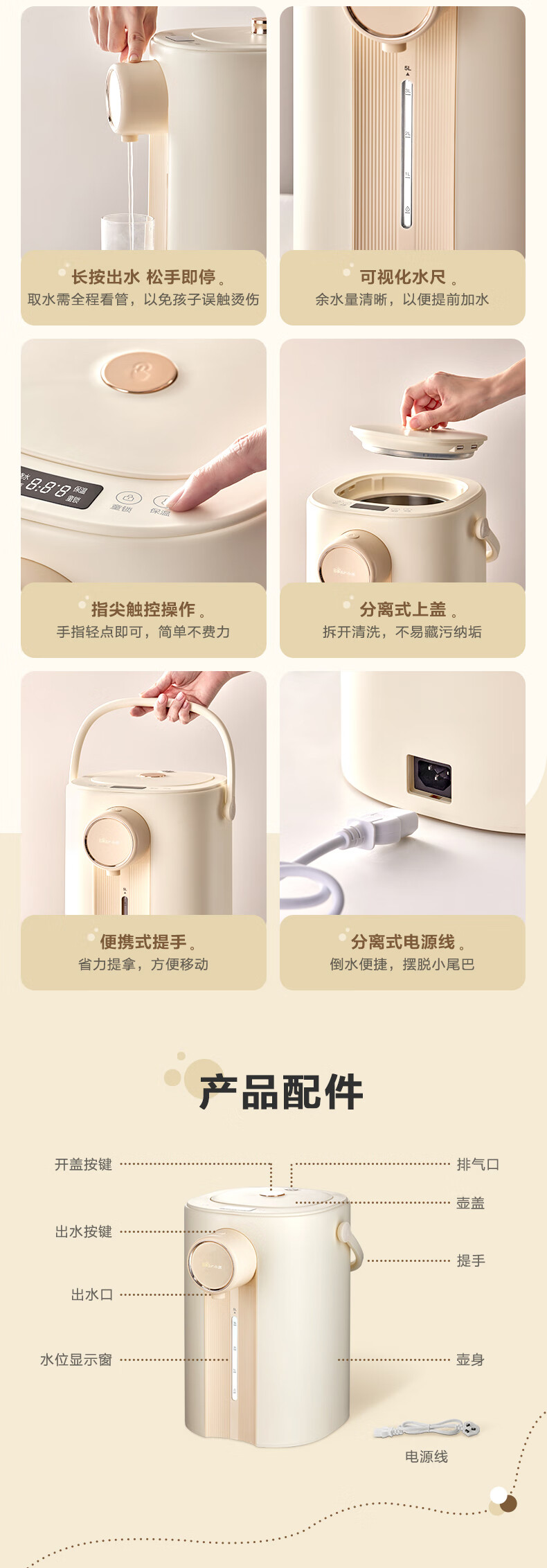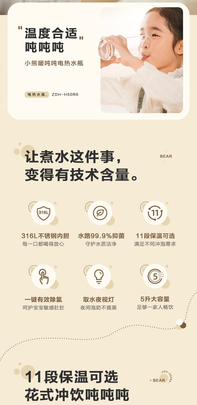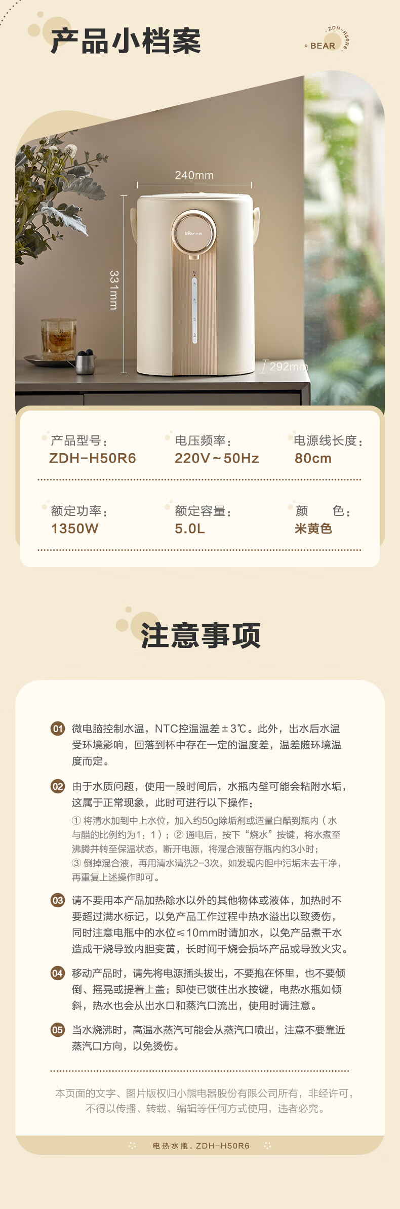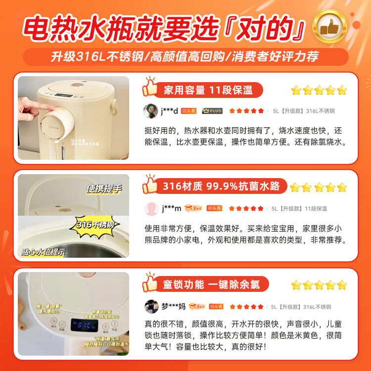 积分免费兑:小熊(Bear)恒温水壶 电热水瓶5L防烫除氯电水瓶316L不锈钢电热水壶烧水壶 多段保温恒温电水壶 ZDH-H50R6