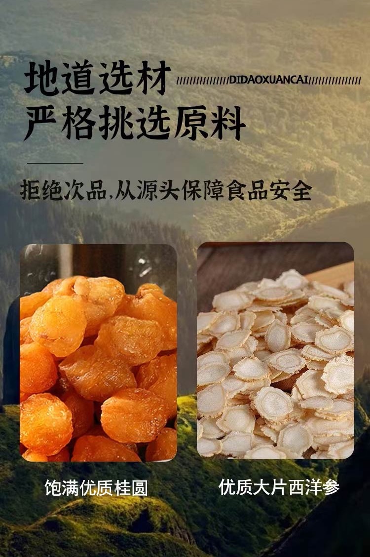 甄选地道原材料,广西大颗桂圆肉,长白山大片西洋参,从源头保障食品安全。