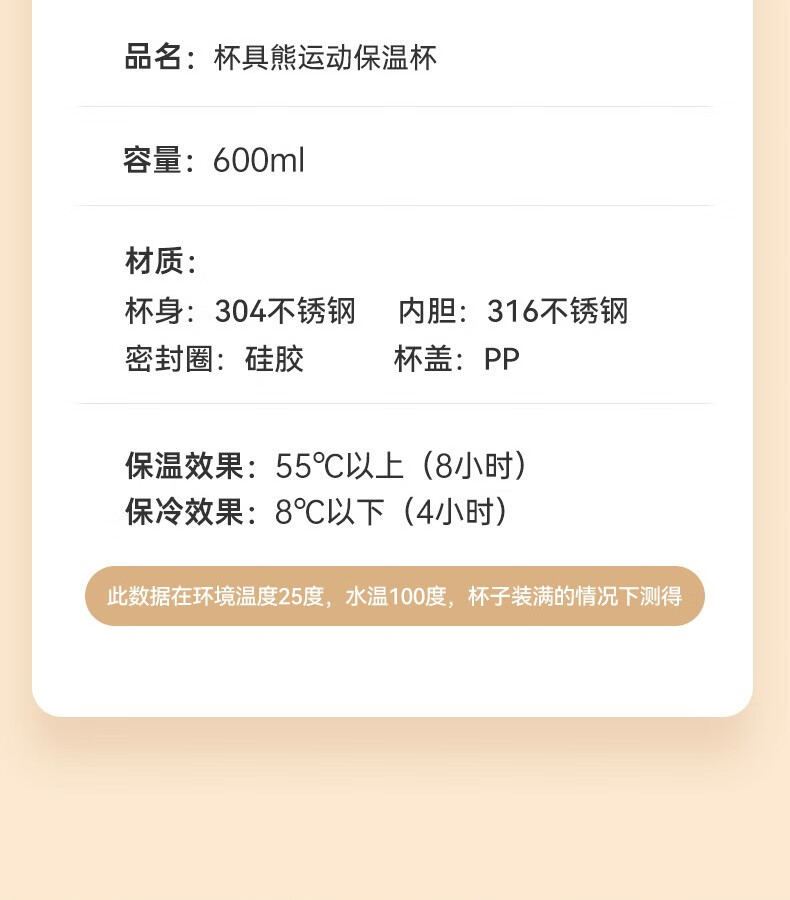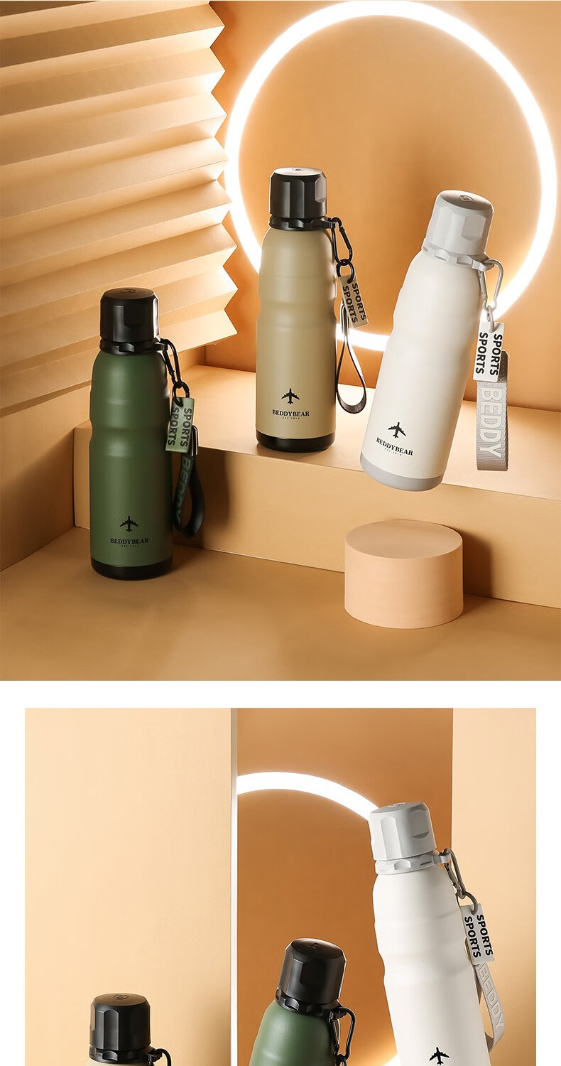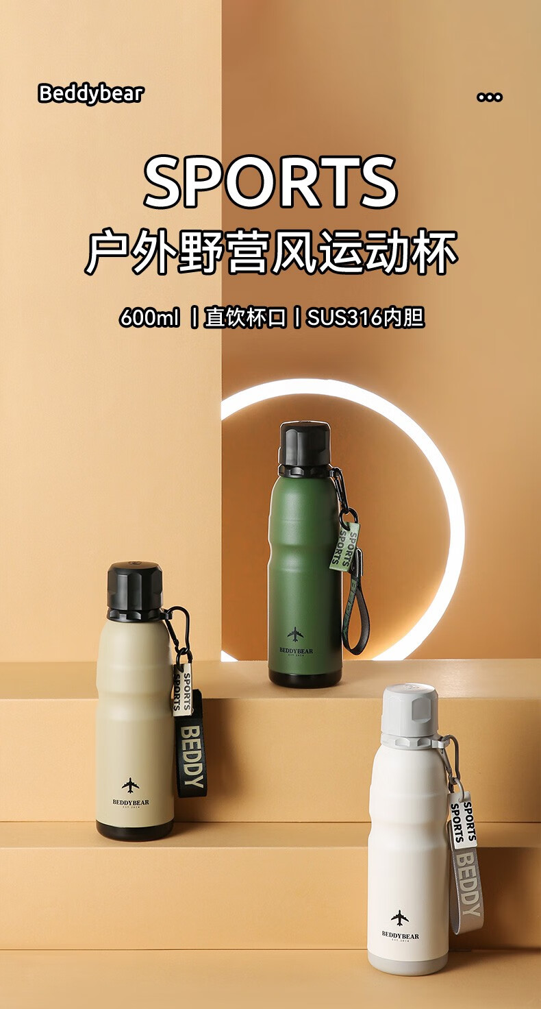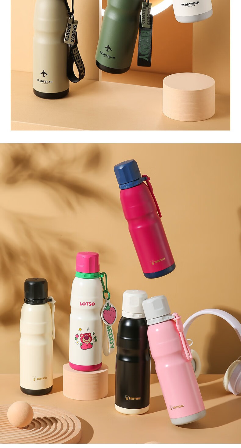 BEDDYBEAR杯具熊 户外运动水杯男女士保温杯保冷大容量上学用水杯便携送礼物316不锈钢卡通杯子 600ml