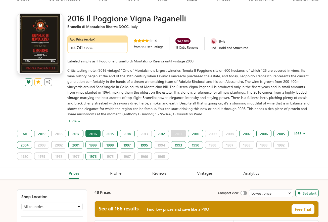 2016 Il Poggione Vigna Paganelli, Brunello di Montalcino Riserva DOCG宝娇酒庄布鲁奈罗珍藏帕戛纳里单一园干红