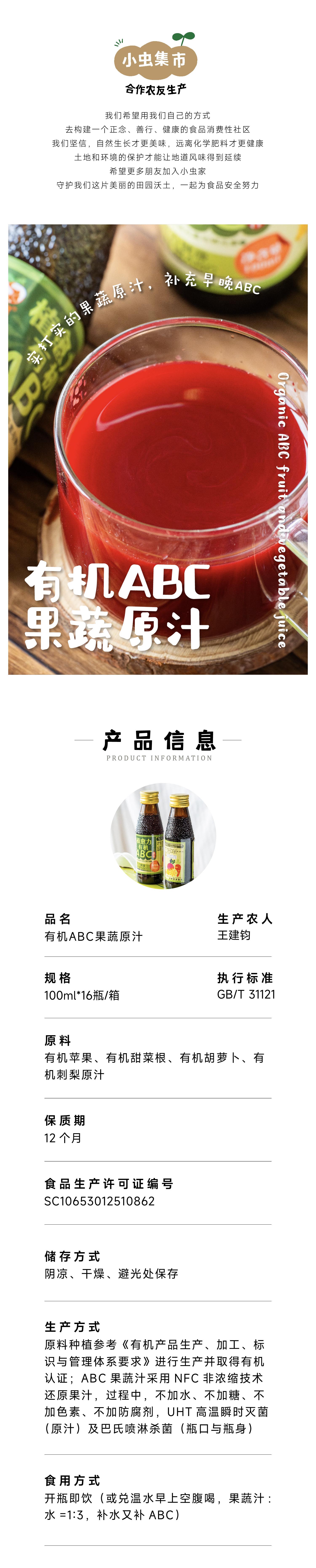 有机ABC果蔬原汁100ml*16瓶/箱 | 合作农友生产,来自云南昆明,生产者:王建钧 *【公平贸易农人定价】