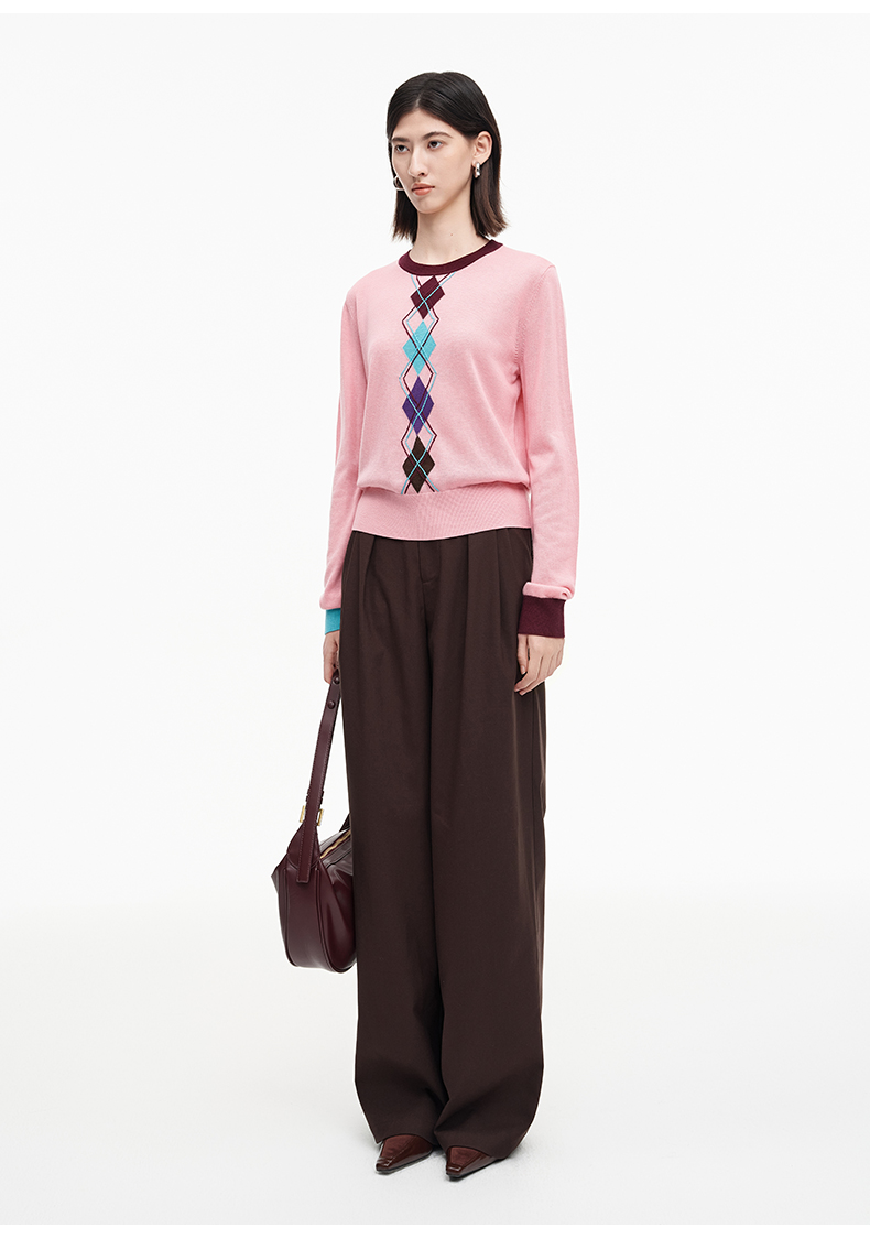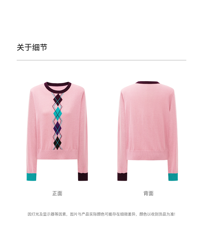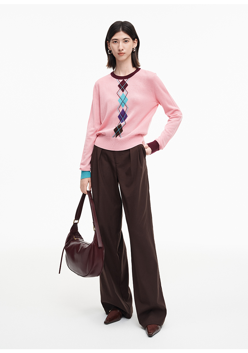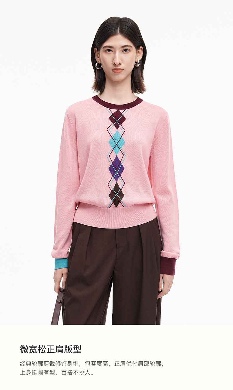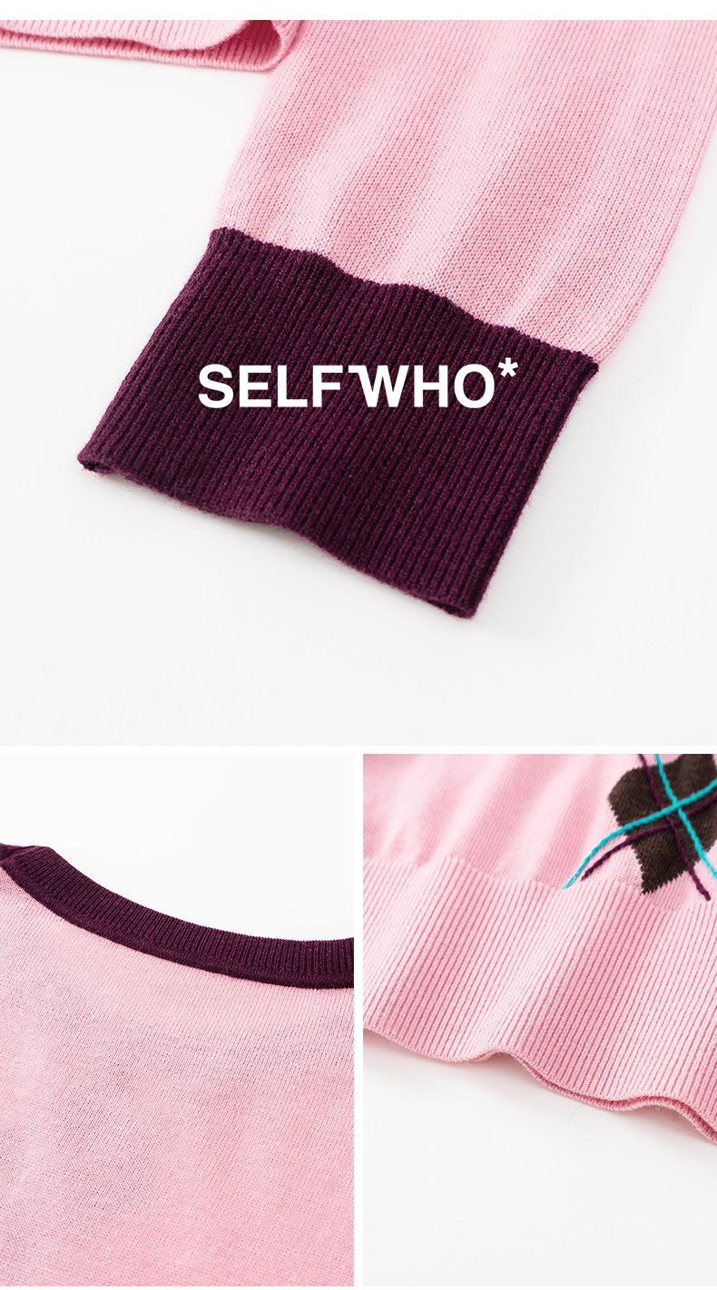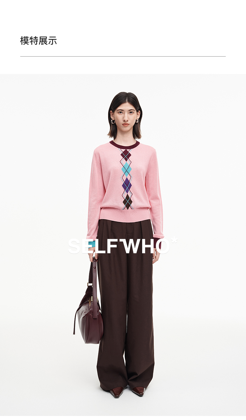 SELFWHO绵羊毛混纺多色菱形格毛衣女2025秋季新款撞色袖圆领上衣