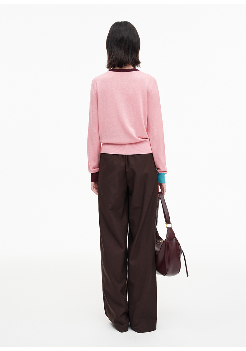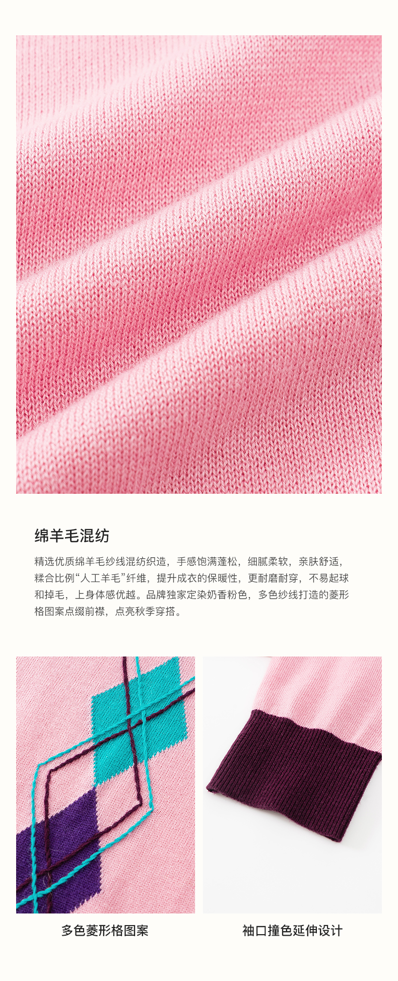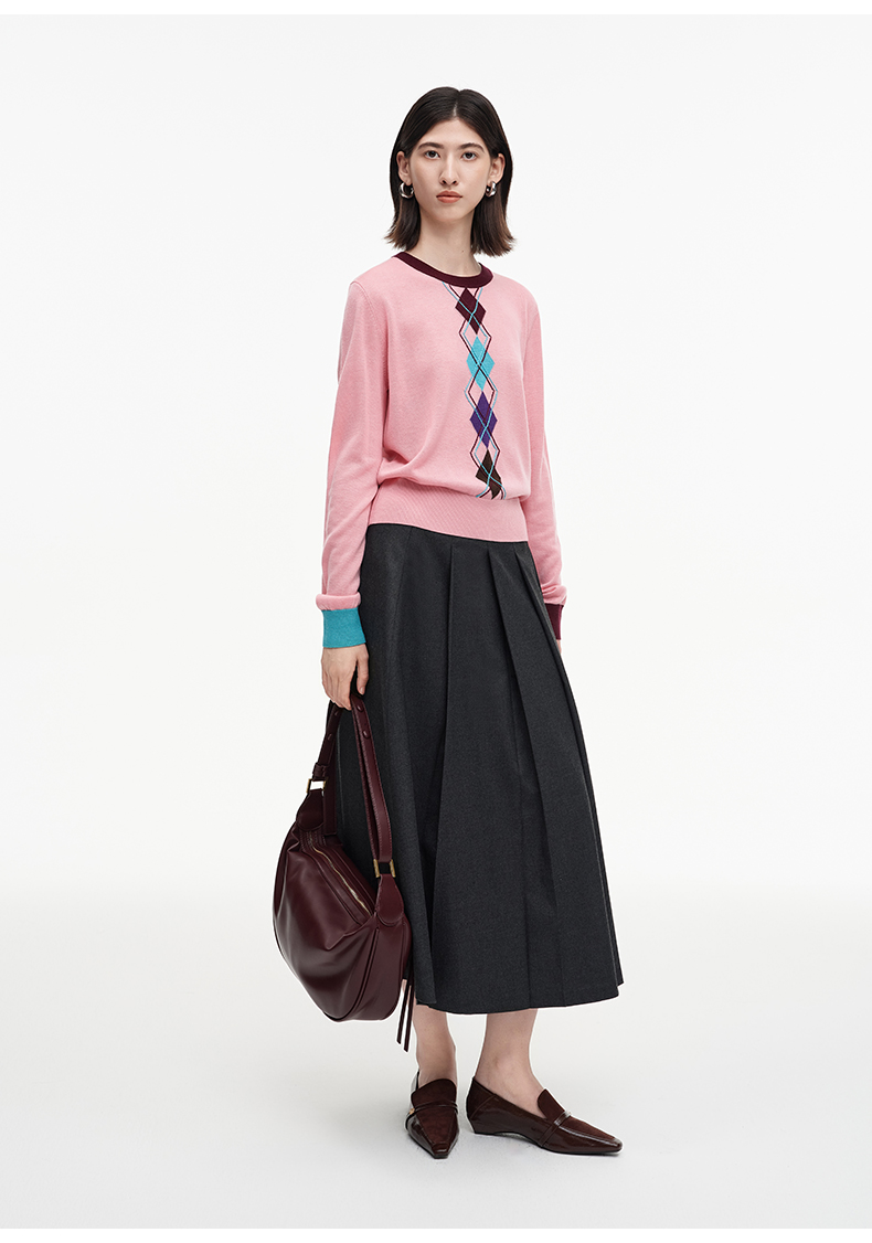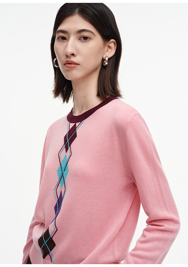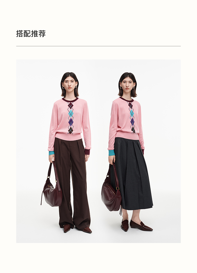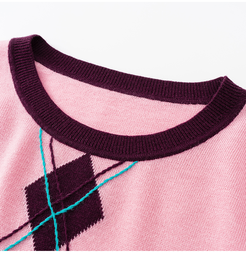 SELFWHO绵羊毛混纺多色菱形格毛衣女2025秋季新款撞色袖圆领上衣