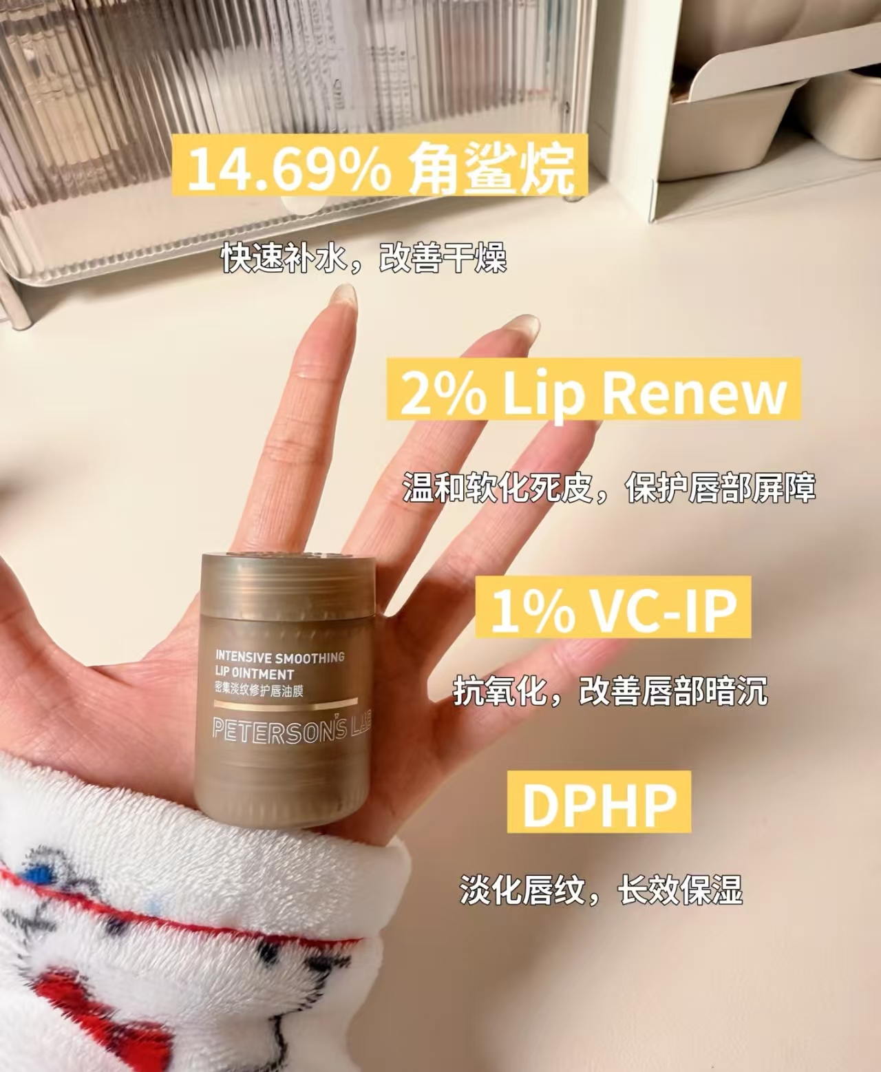 里面添加了多种高效的淡纹成分,像植物甾醇油酸酯和角鲨,不仅能深层滋润唇部肌肤,