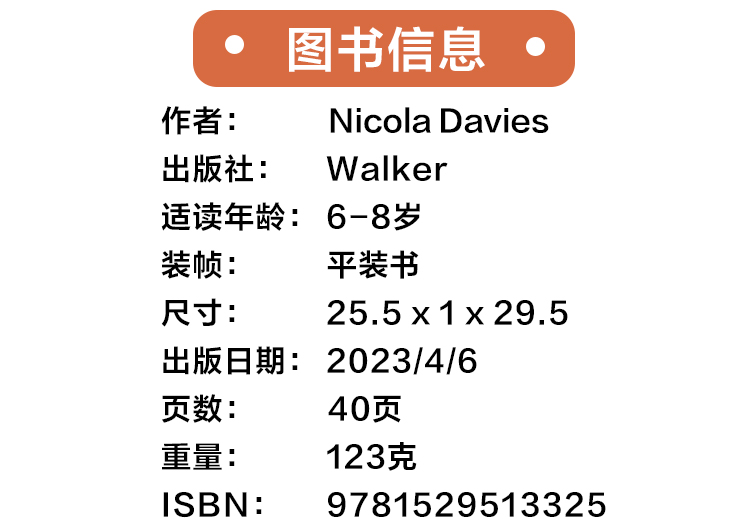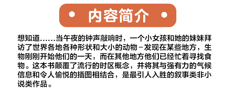 Nicola Davies 和 Jenni Desmond 的首次合作:壮观的地球之旅和强大的战斗口号。 你现在在地球上的什么地方?我所在的地方已经很晚了,几乎每个人都睡着了,但我醒着,望着夜色。想知道......当午夜的钟声敲响时,一个小女孩和她的妹妹拜访了世界各地各种形状和大小的动物 - 发现在某些地方,生物刚刚开始他们的一天,而在其他地方他们已经忙着寻找食物。这本书颠覆了流行的时区概念,并将其与强有力的气候信息和令人愉悦的插图相结合,是最引人入胜的叙事类非小说类作品。 “尼古拉戴维斯是业内最优秀的儿童作家之一。” 赫芬顿邮报 “珍妮·德斯蒙德知道如何让孩子们宝贵的想象力飞翔。” 监护人
