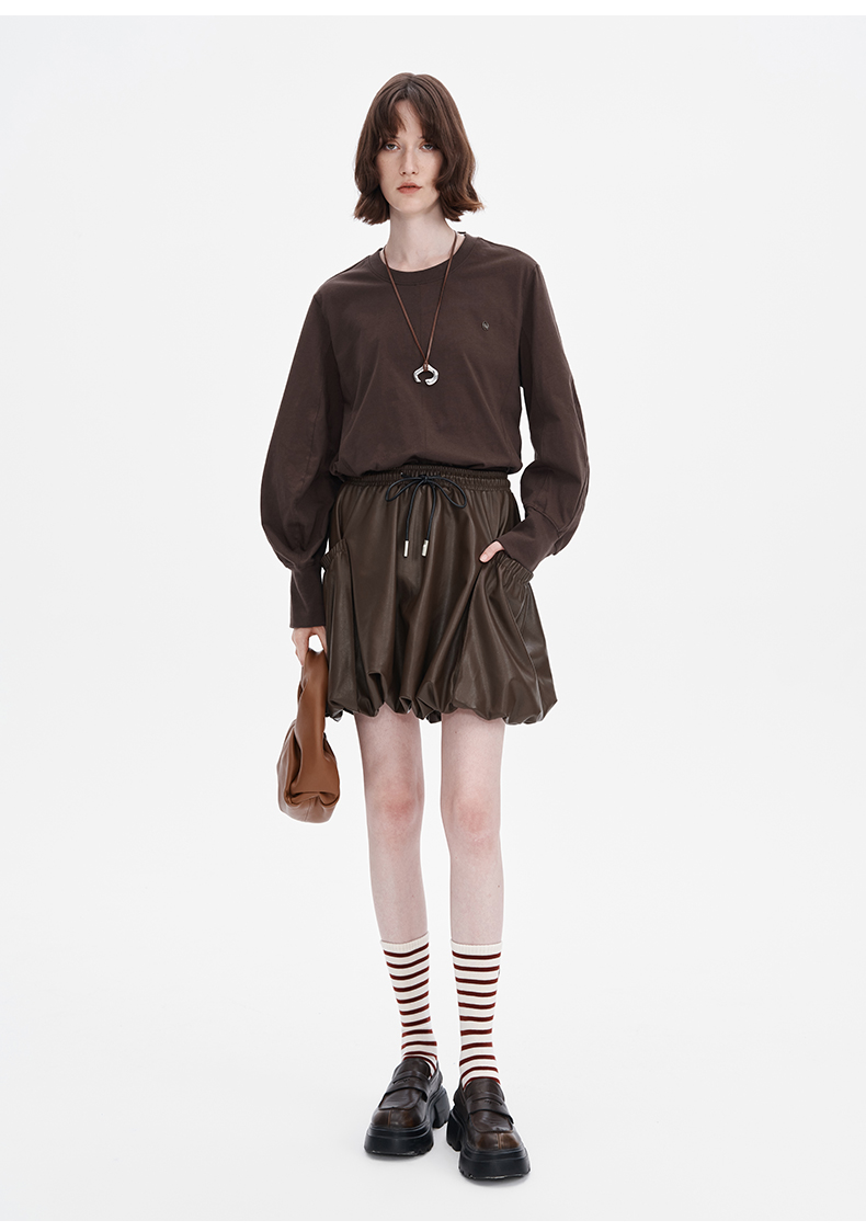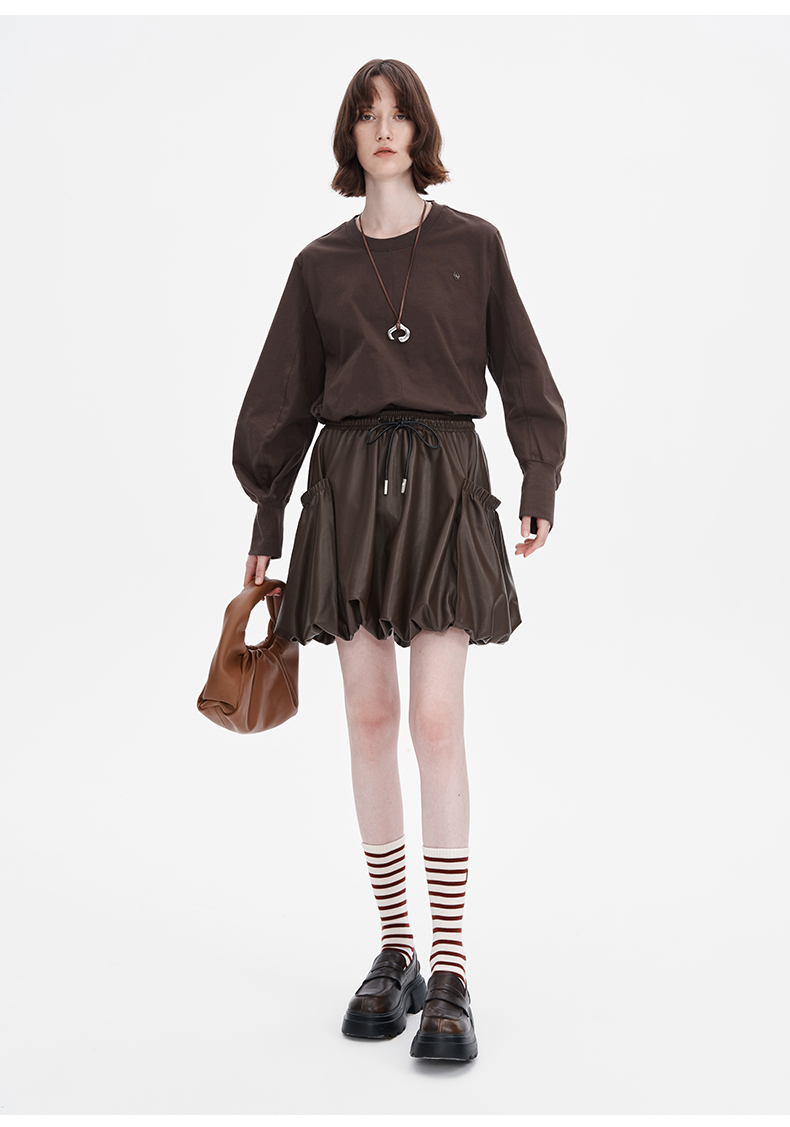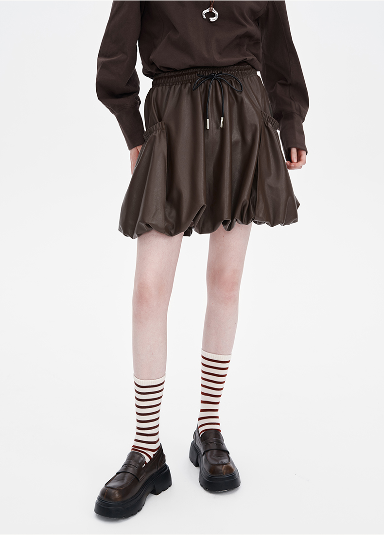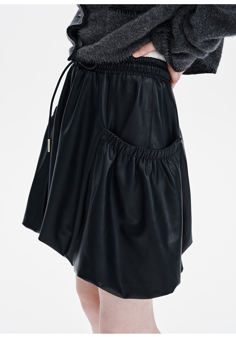 SELFWHO美式复古pu皮短裙女2024秋新款高腰包臀a字抽绳花苞半身裙