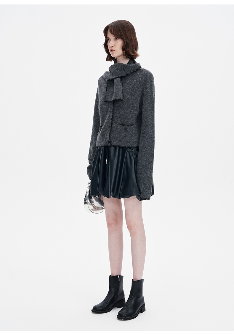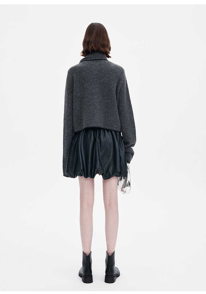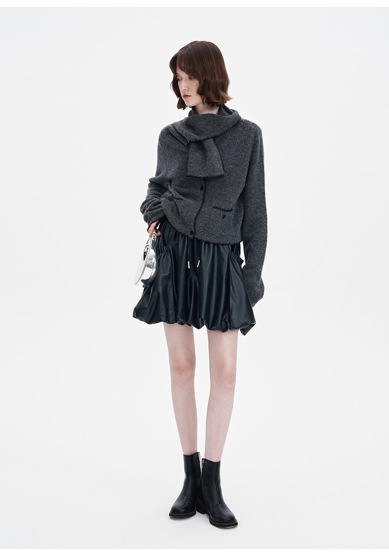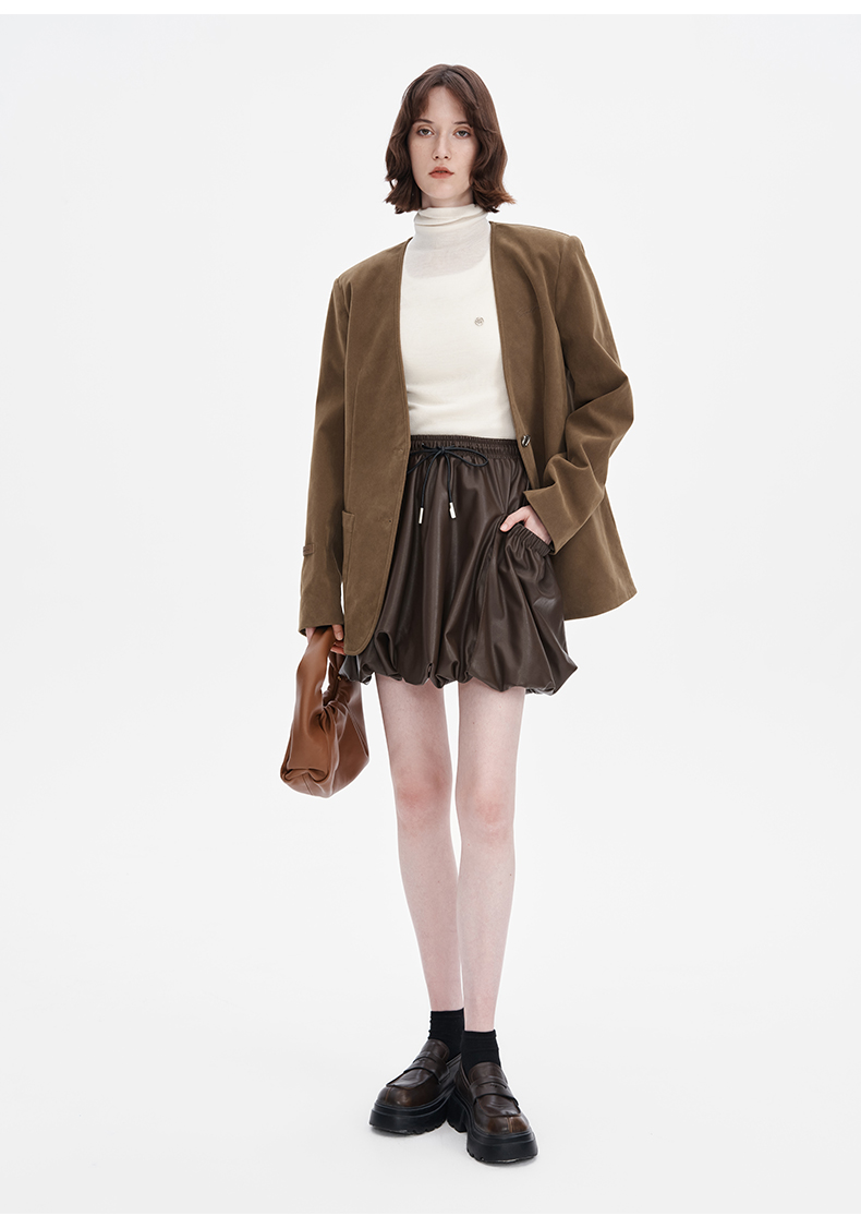 SELFWHO美式复古pu皮短裙女2024秋新款高腰包臀a字抽绳花苞半身裙