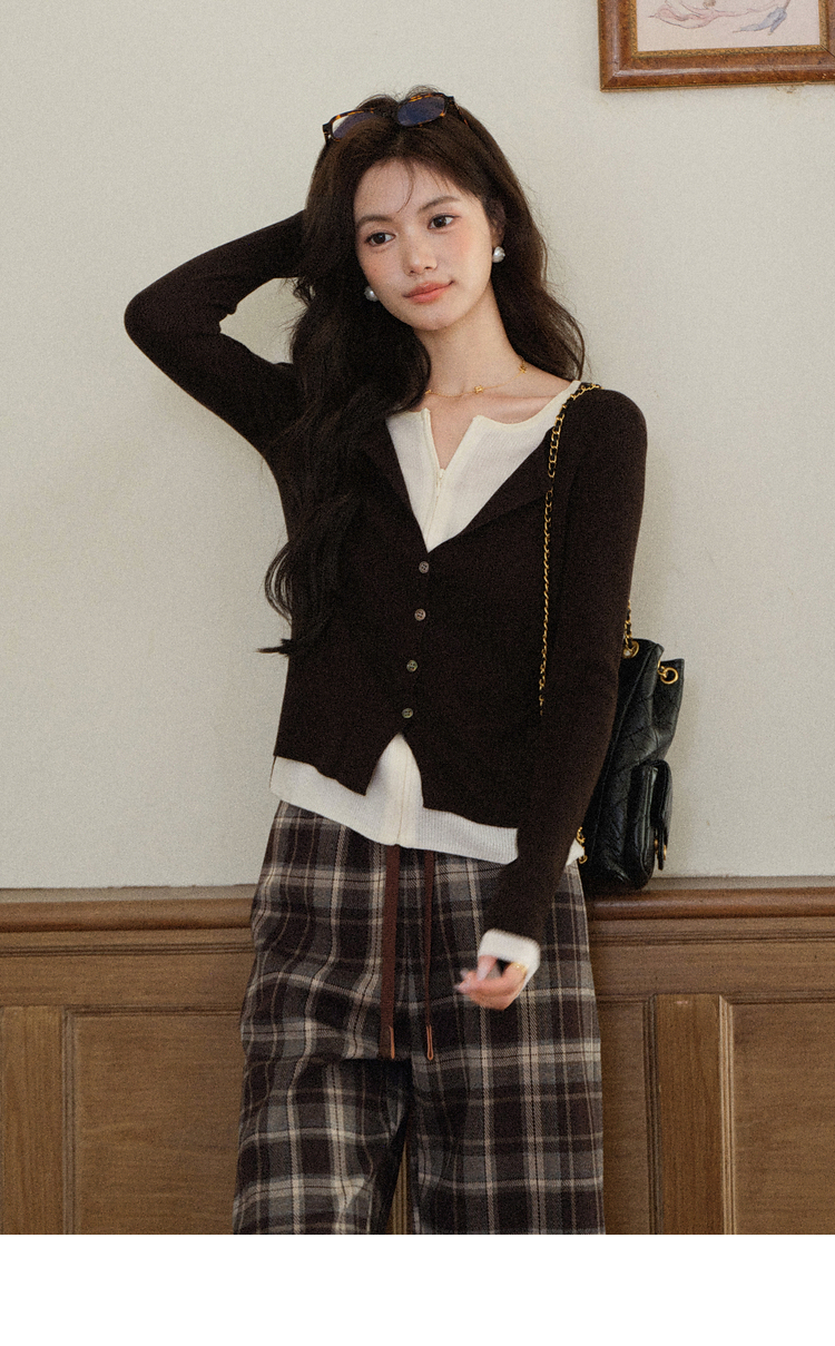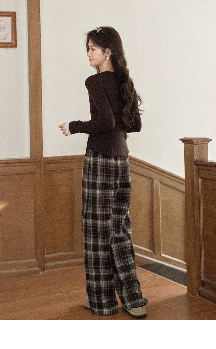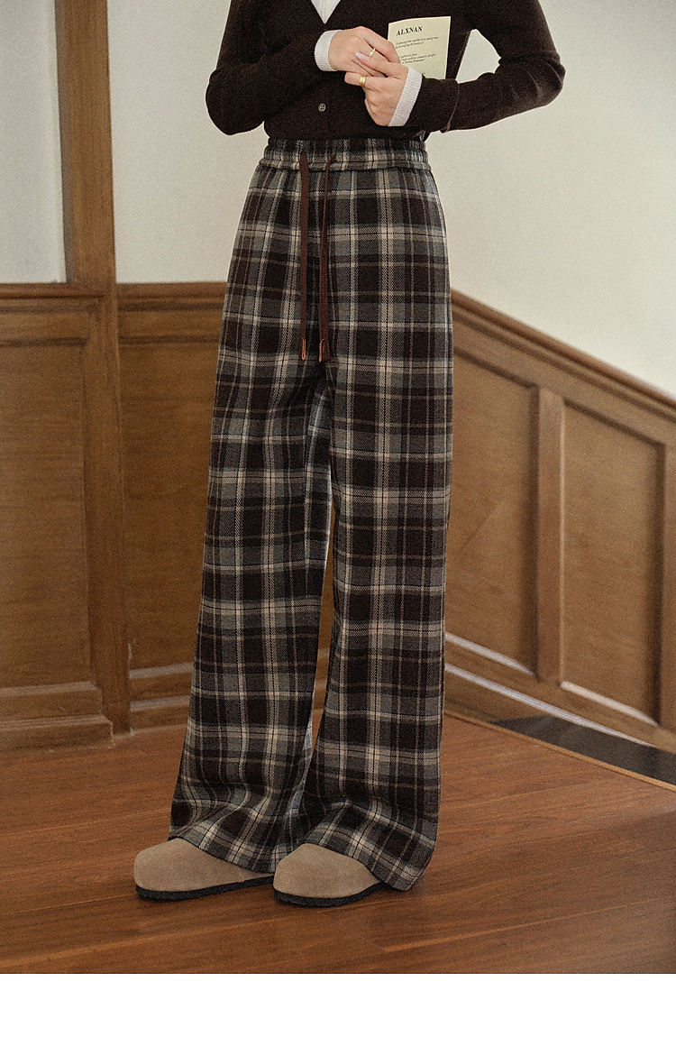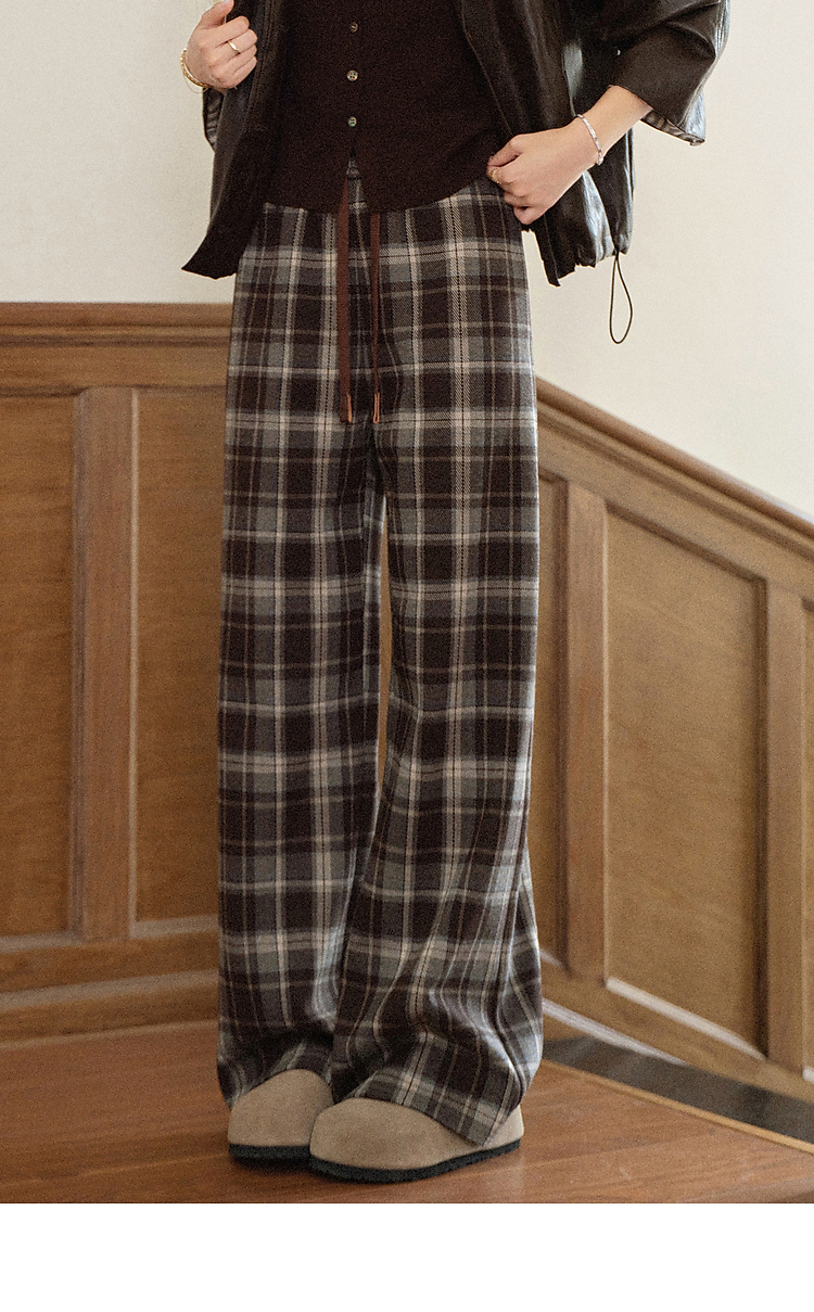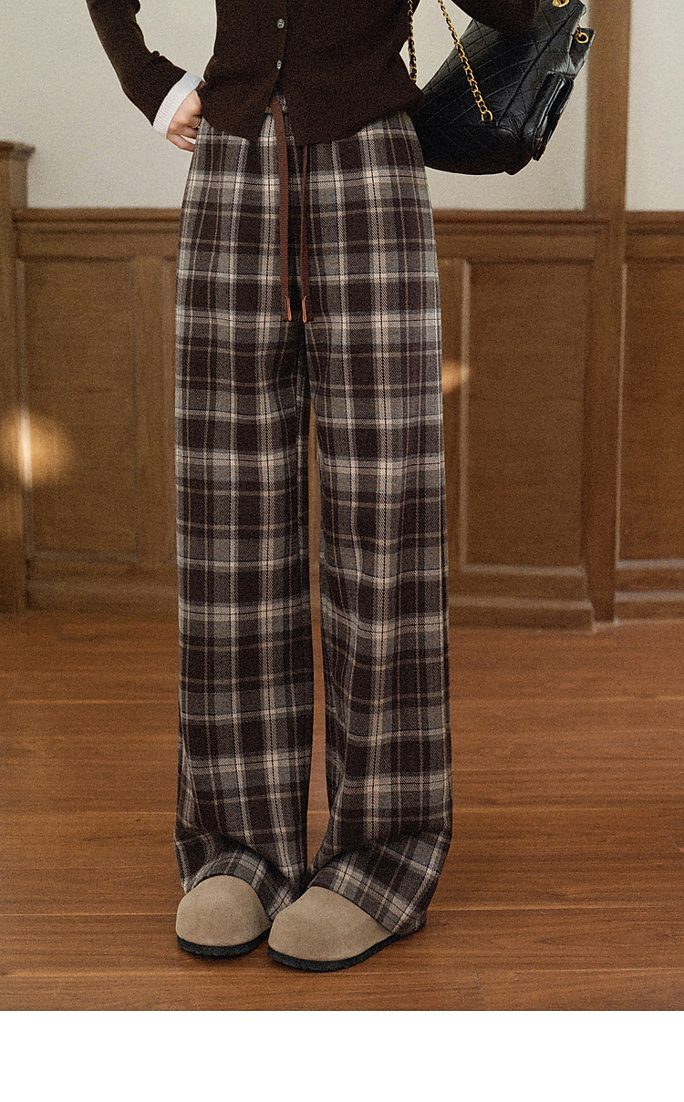 鹿向南「巧克栗」咖色格子高腰休闲裤女秋季新款宽松慵懒直筒长裤