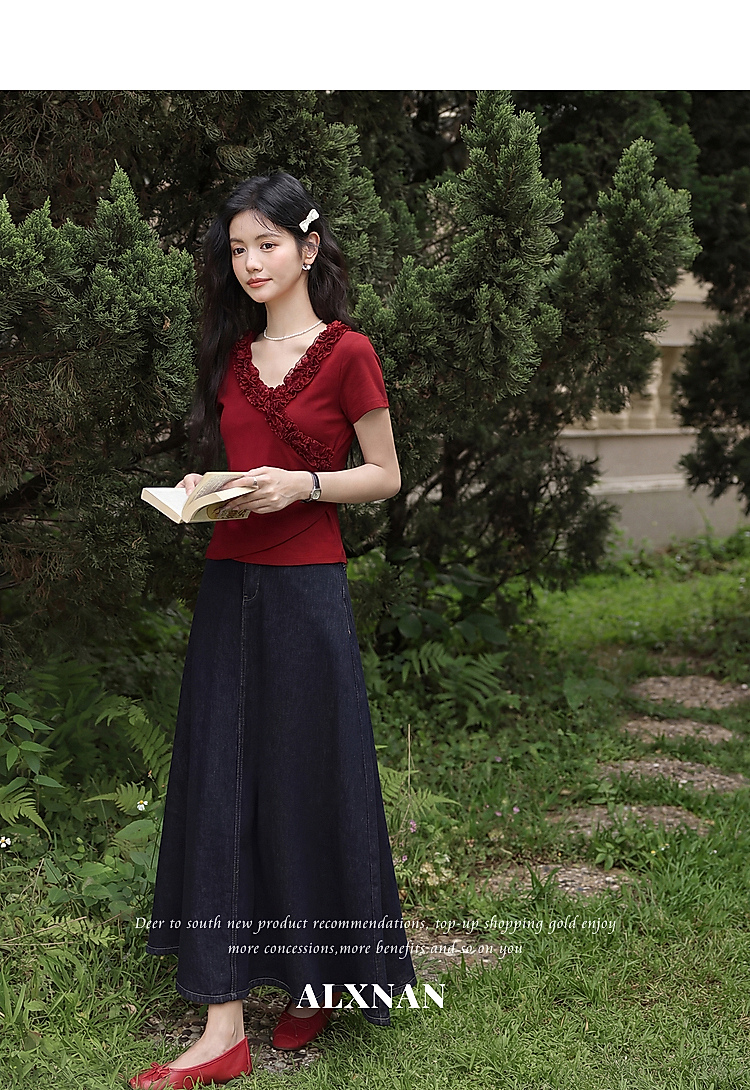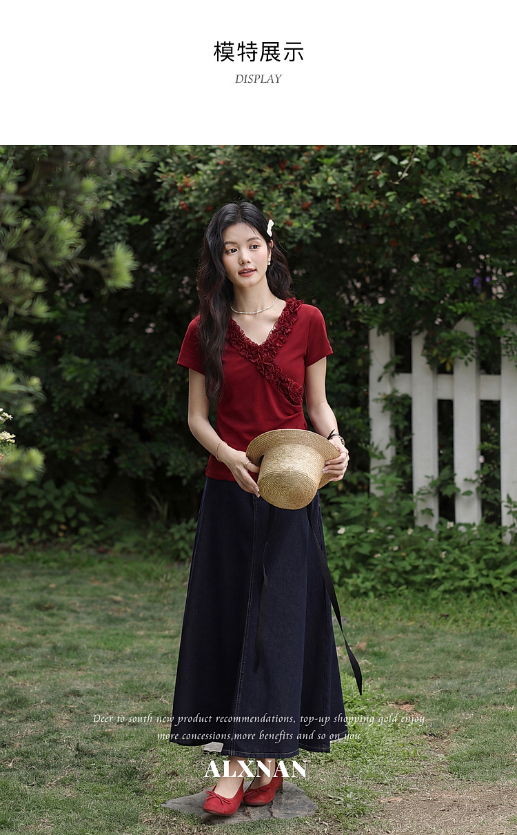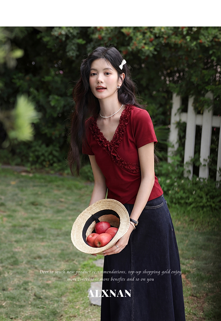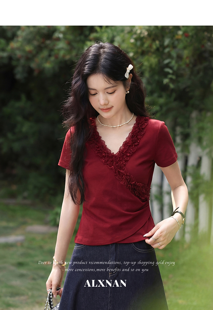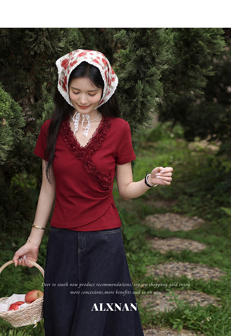 鹿向南「樱桃信笺」酒红色短袖T恤春季新款时尚设计感百搭上衣女