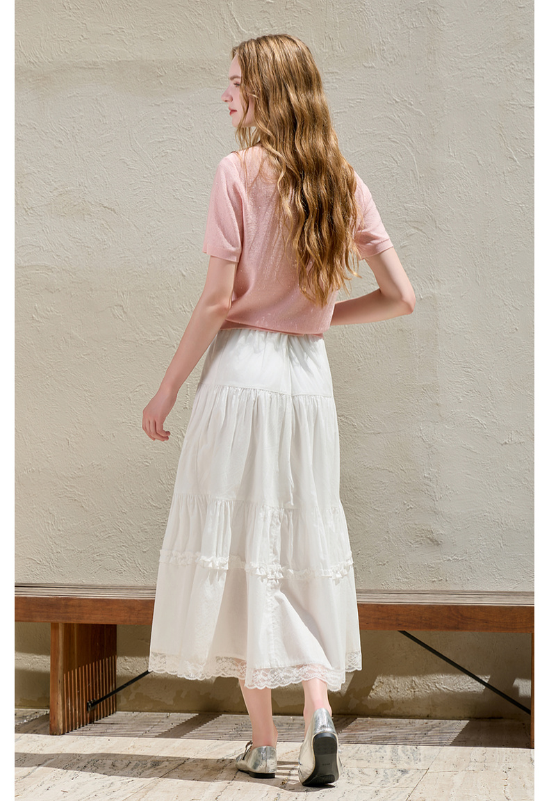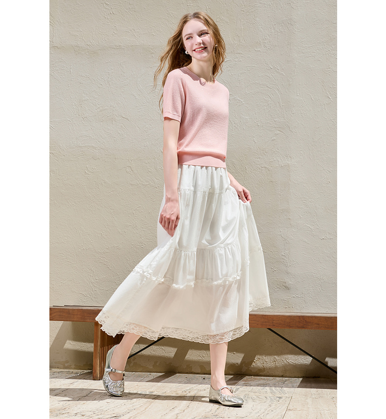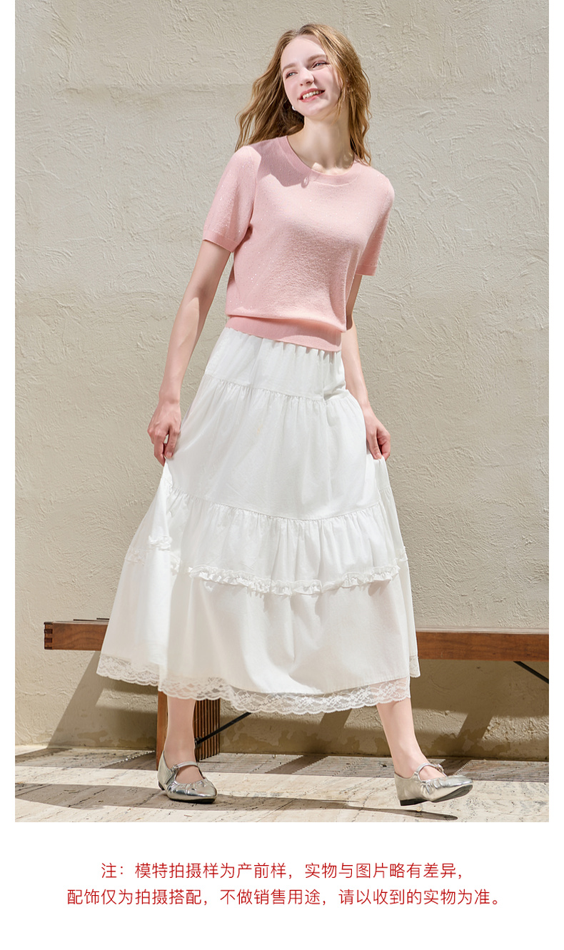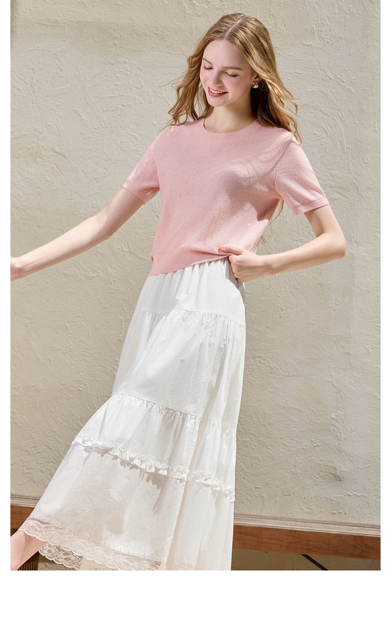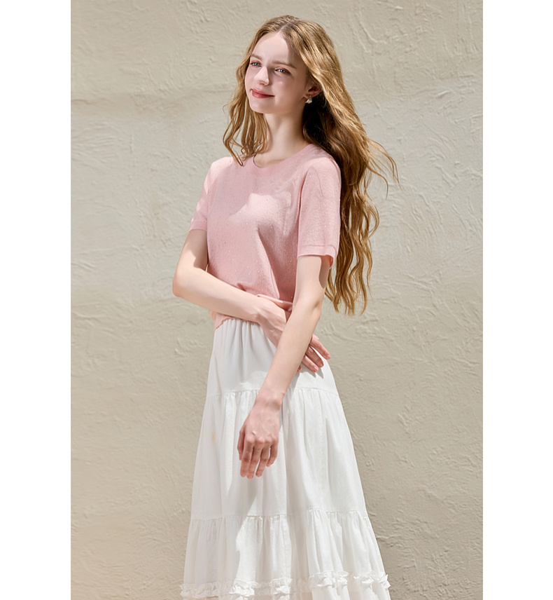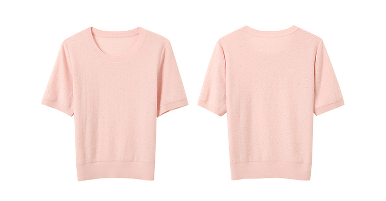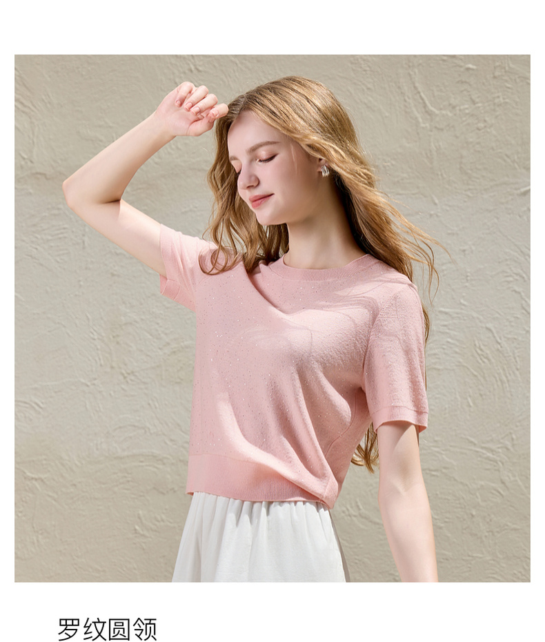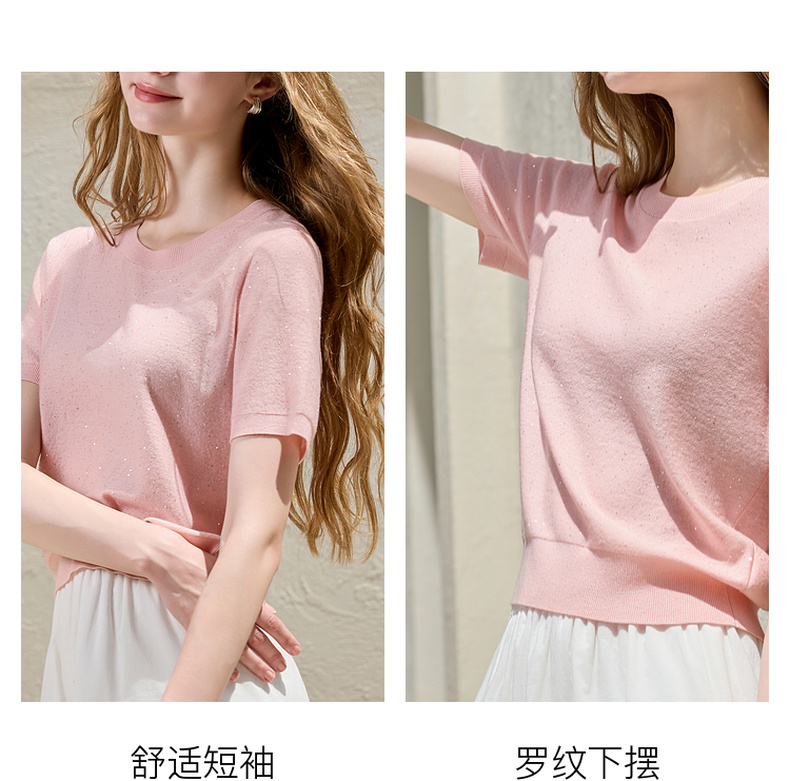 三彩2025秋季新款亮片针织衫圆领毛衫短袖套头衫简约M