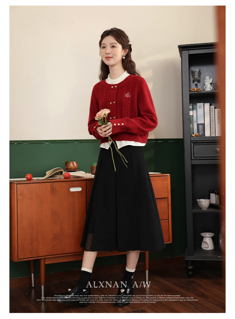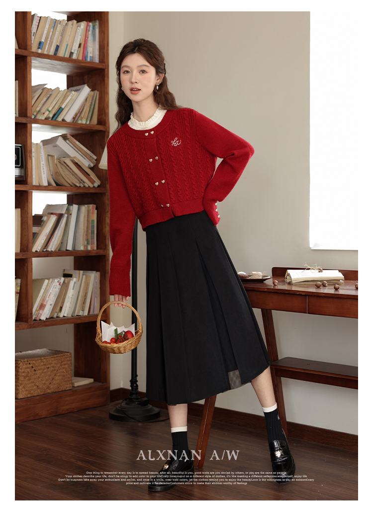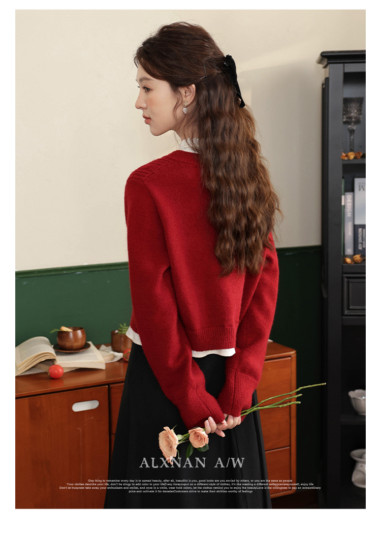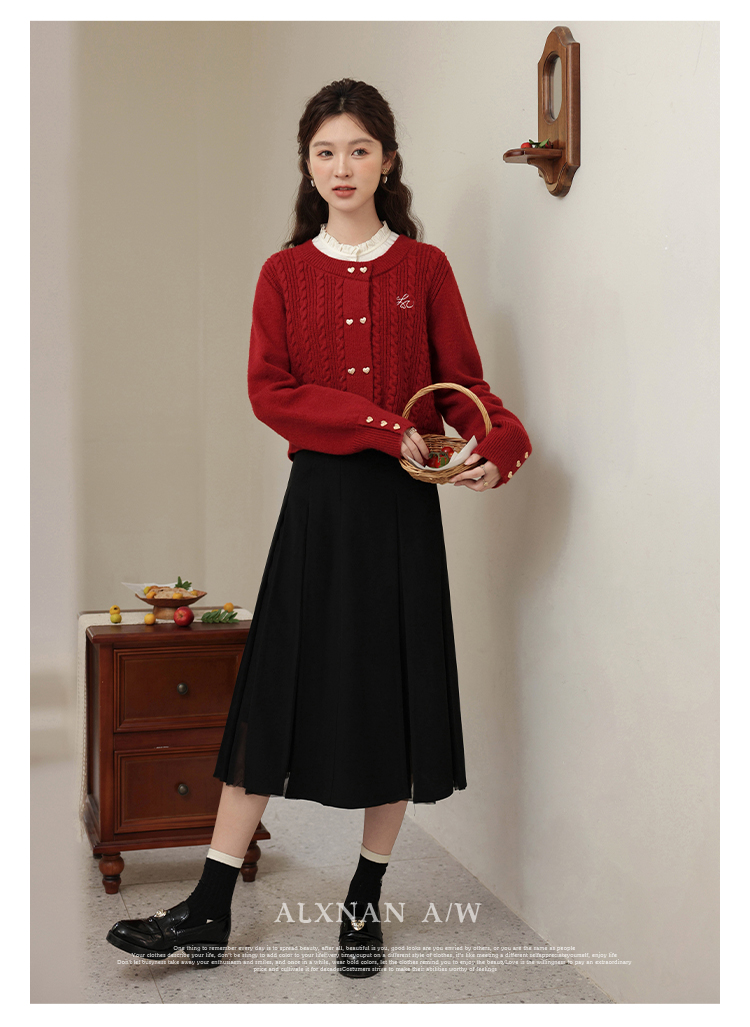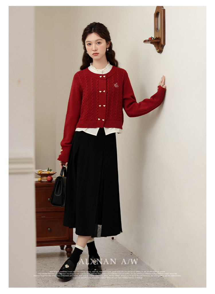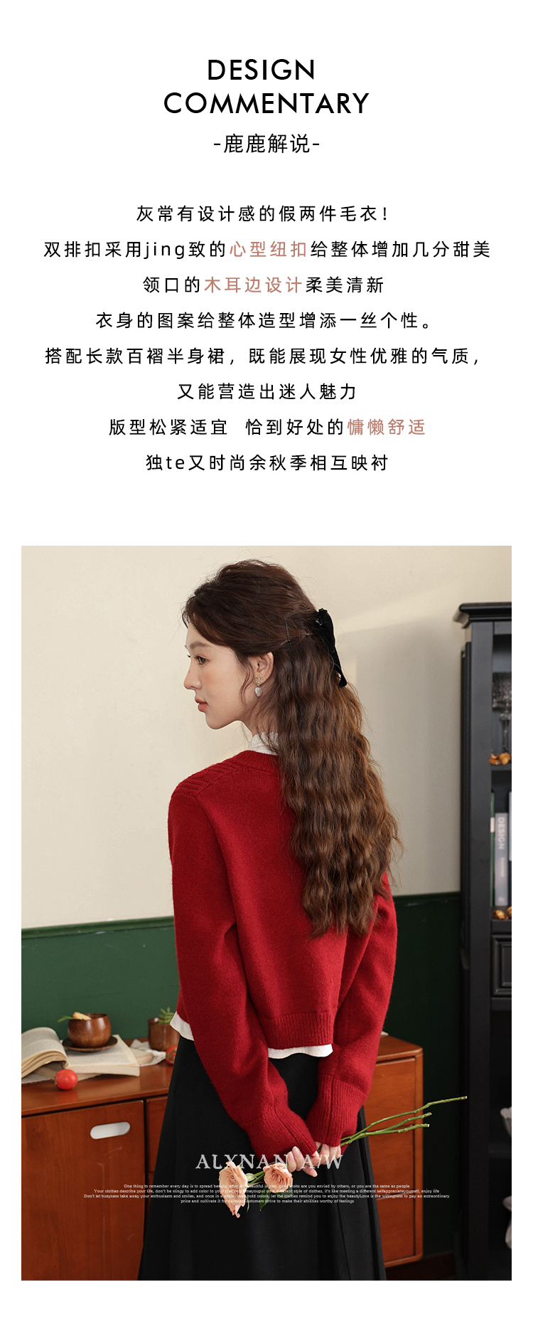 鹿向南「樱桃日记」安可雷红色毛衣秋季立领假两件上衣女&气质时尚高腰半身裙