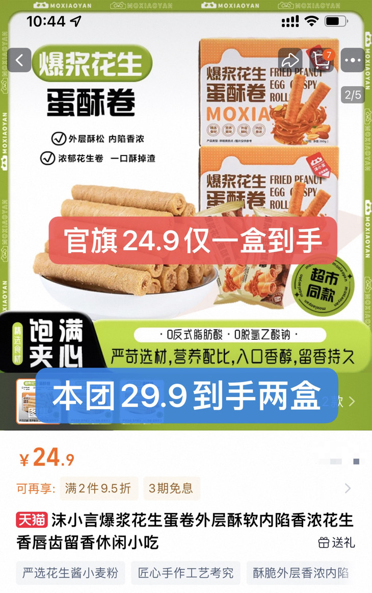 📣📣注意注意‼️中秋大促来咯~ 旗舰店一盒24.9才能到手一盒的 ——沫小言爆浆花生蛋酥卷 开团两盒29.9‼️ 超级实惠,性价比巨高 用来送礼真的超合适呀~ 拿来送朋友,包被夸的!! 一箱不够吃,强烈建议多囤!!!