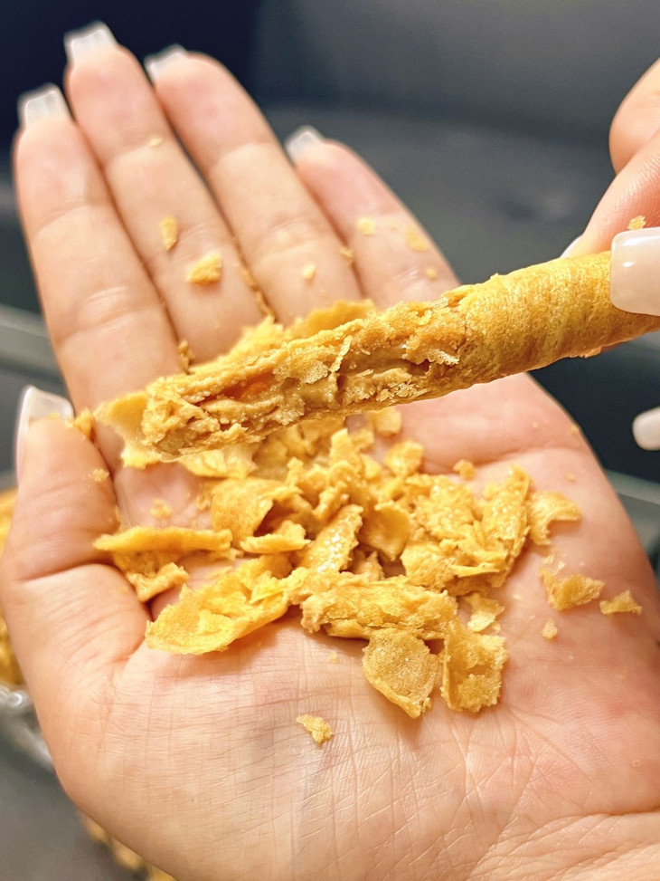 纯手工蛋卷!!! 制作时一不小心就会簌簌簌地掉碎屑 每天大约会耗损几十斤蛋卷碎 为了口感酥脆,从长度、重量到蛋卷孔大小, 都是反复测试过的zui佳口感✅ 蛋卷的空气感与蓬松度恰到好处 准确计算的机制工艺,无法达到这种效果