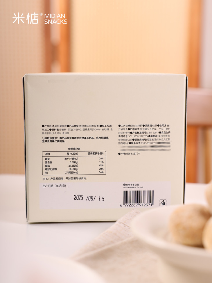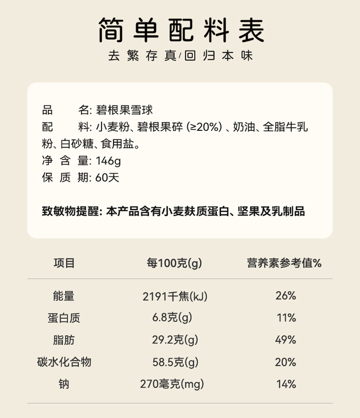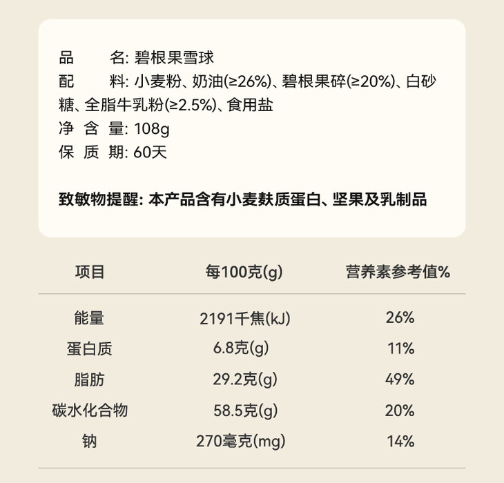 【品名】:米惦碧根果雪球 【产品规格】:108g/146g 【保质期】:60天 【配料表】小麦粉、碧根果碎(≥20%)、奶油、全脂牛乳粉、白砂糖、食用盐 【致敏物提醒】:本产品含有小麦麸质蛋白、坚果及乳制品 【储存方式】:阴凉避光处贮存,产品开封后应立刻食用 【发货地】:福建漳州 【发货时效】:72小时内发出,中午12点前给订单 【发货快递】:中通、申通随机发不指定 【补运费地区】:北京,上海➕一元,甘肃、内蒙古、宁夏运费两件内➕14元,青海、新疆、西藏运费两件内➕16元。 【售后说明】: 1、食品无质量问题不支持 7 天无理由退换。 2、产品少发、漏发,质量问题,请提供产品连同快递单(需看见单号)一起拍照24 小时内发给客服核实处理。 3、如包裹破损、挤压严重请(拍照外箱图片)拒绝签收,签单破损签收,请在签收48小时内拍照联系客服处理。 4、产品已经发出的情况下,不建议更改地址、不退货,下单前,请仔细核对信息!货物产生物流单号,无法拦截,如需改地址、拦截须支付快递费用。 5、订单产生单号后,拦截需收费4元,改地址3元,偏远六省(新疆、西藏、内蒙古、宁夏、青海、甘肃)按实际产生运费收取。