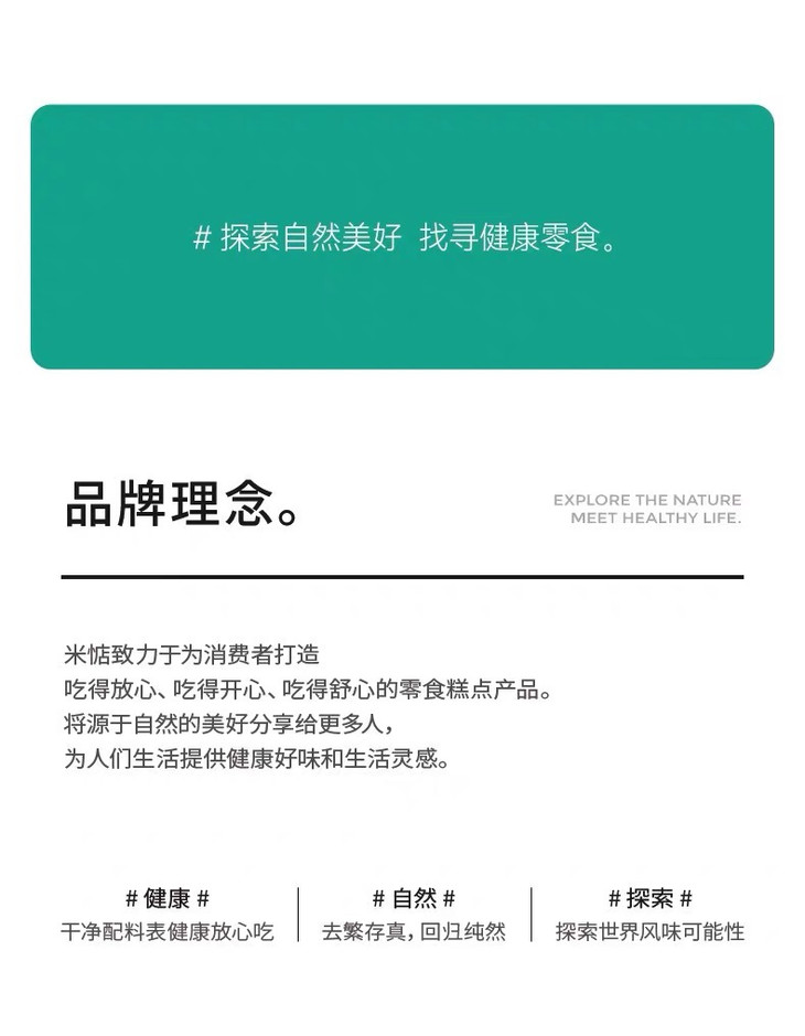 🏷品牌故事 ✔米惦,以找寻和分享健康零食而来,秉持着低添加甚至无添加的产品理念,致力于为每个人提供更安心的美味。 ✔我们为打破“零食是不健康的”固有认知而来,成立至今,已销售8000万袋,深受年轻一代的喜欢和认可。 ✔在坚持健康零食上,我们不止步于好吃,而是研发更有趣好玩,更高品质高颜值的产品,为每个人带来好吃好玩的零食生活体验。