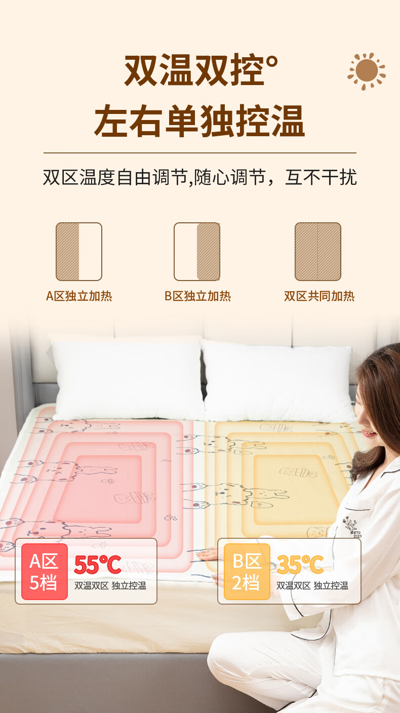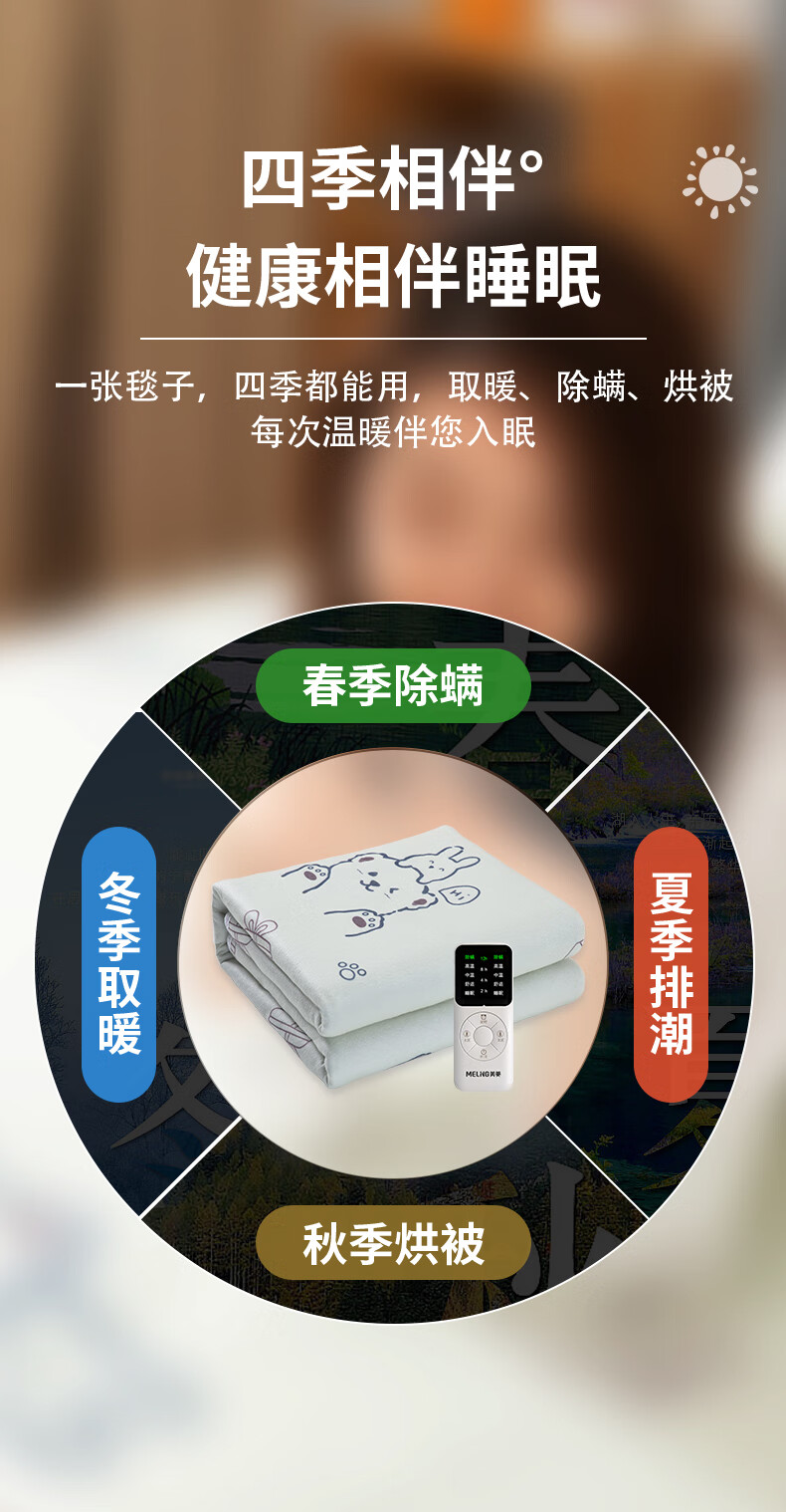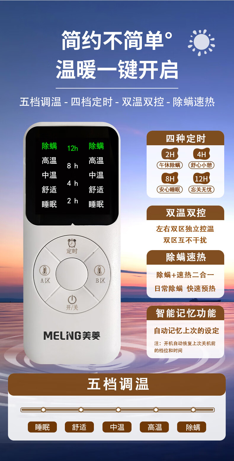 美菱(MeLng)双人五档定时除螨自动断电 双温双控无纺布电热毯电褥子 RSD-3522&3532