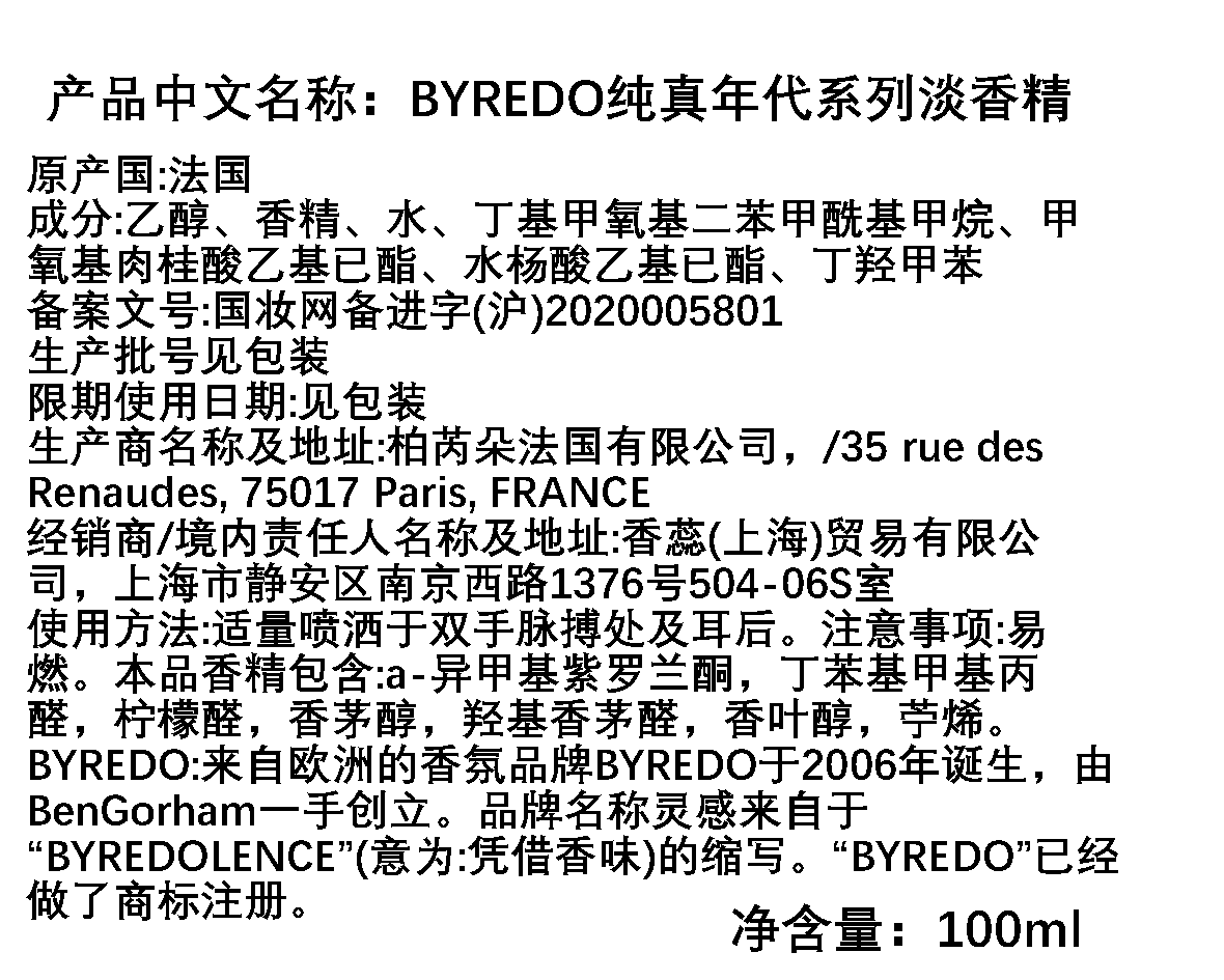 BYREDO百瑞德/柏芮朵 白色浪漫/纯真年代香水