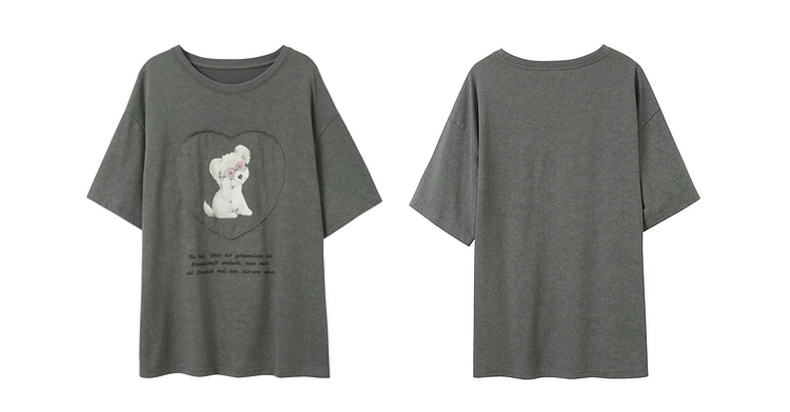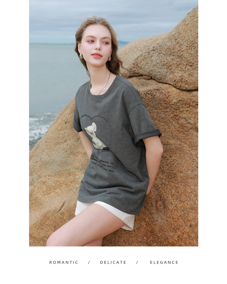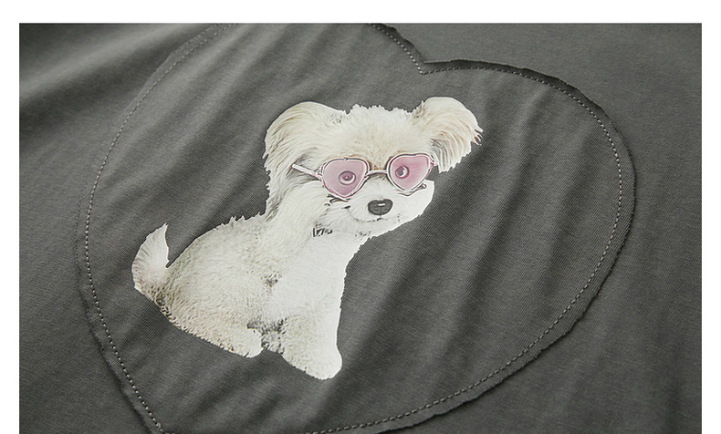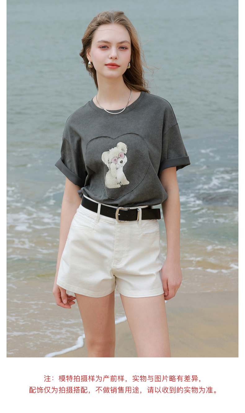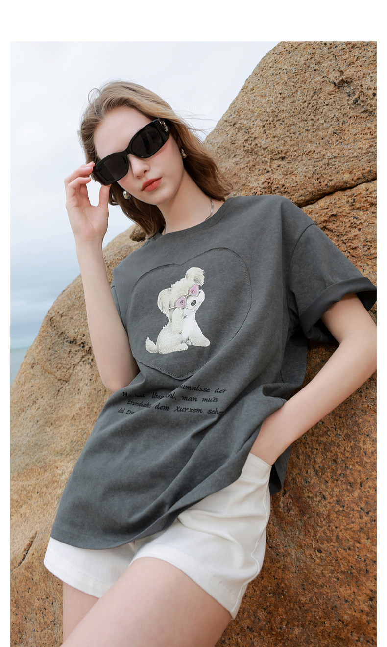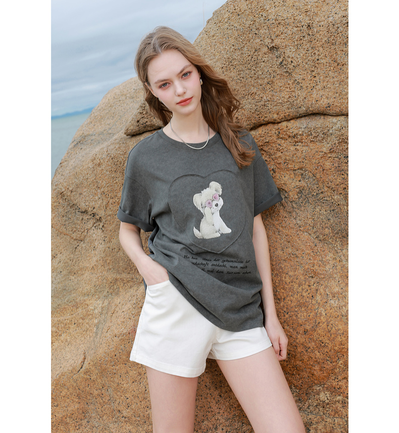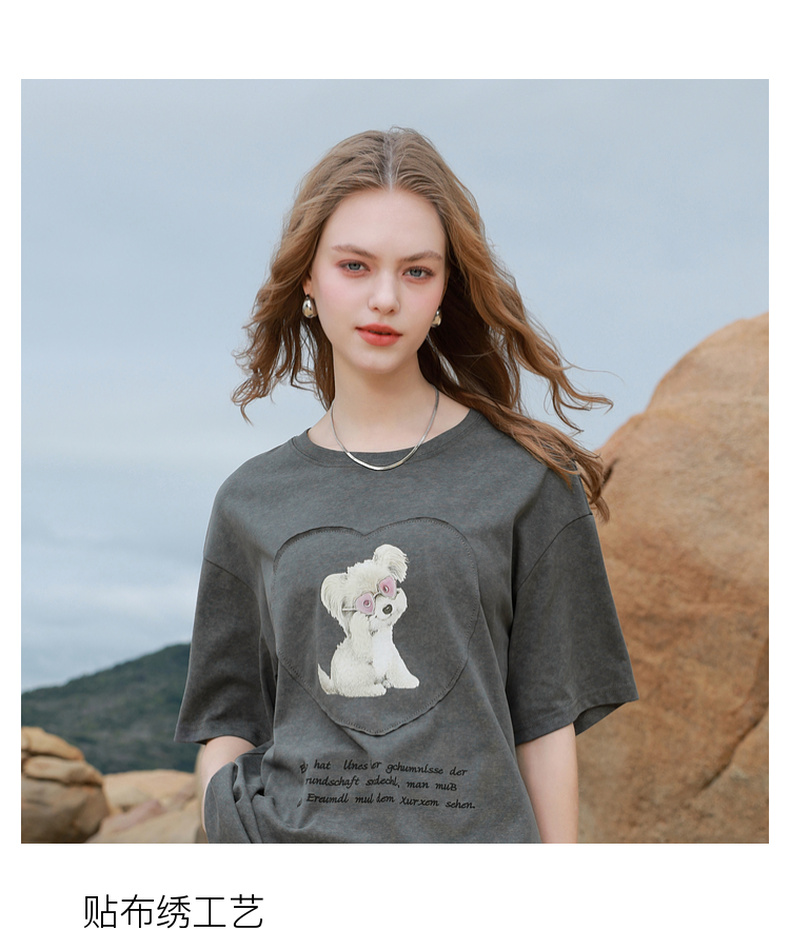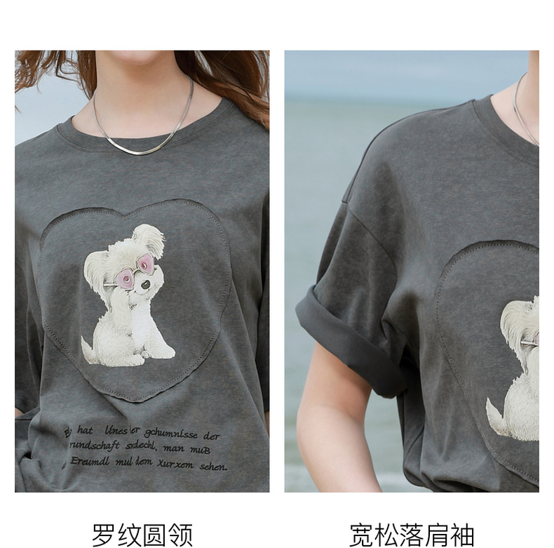 三彩2025夏季新款小狗印花T恤圆领宽松落肩袖套头美式休闲M