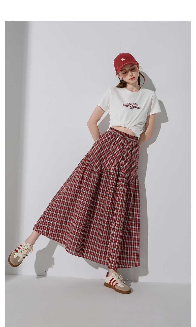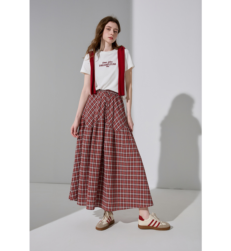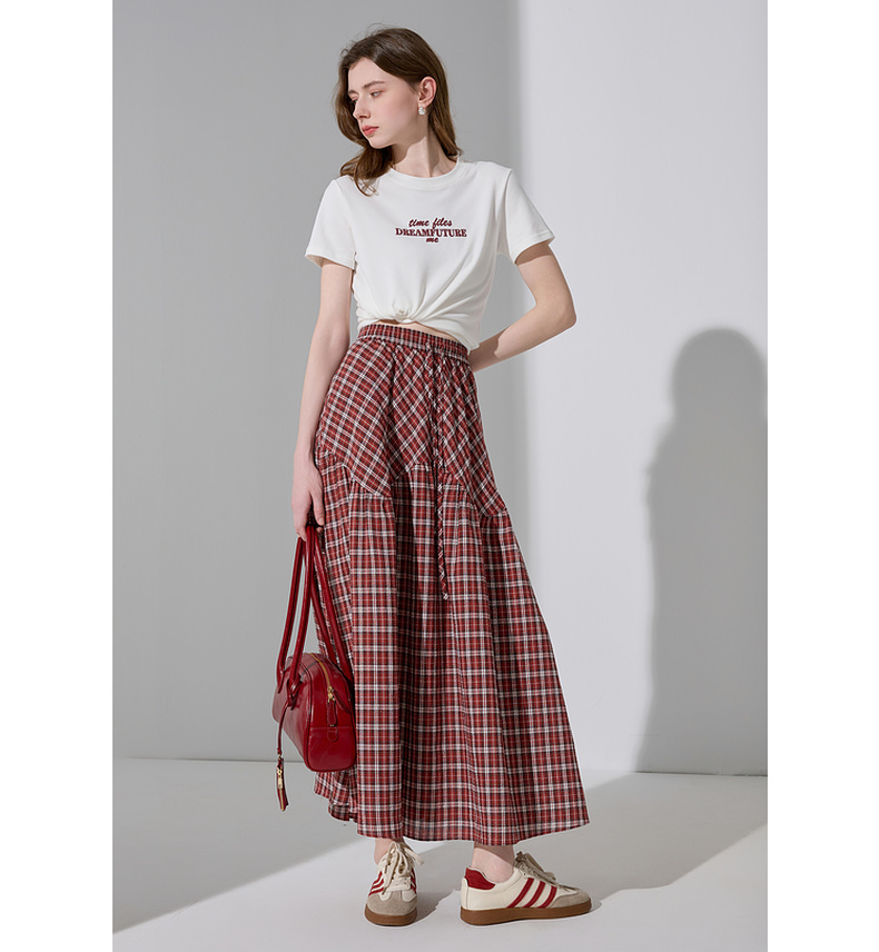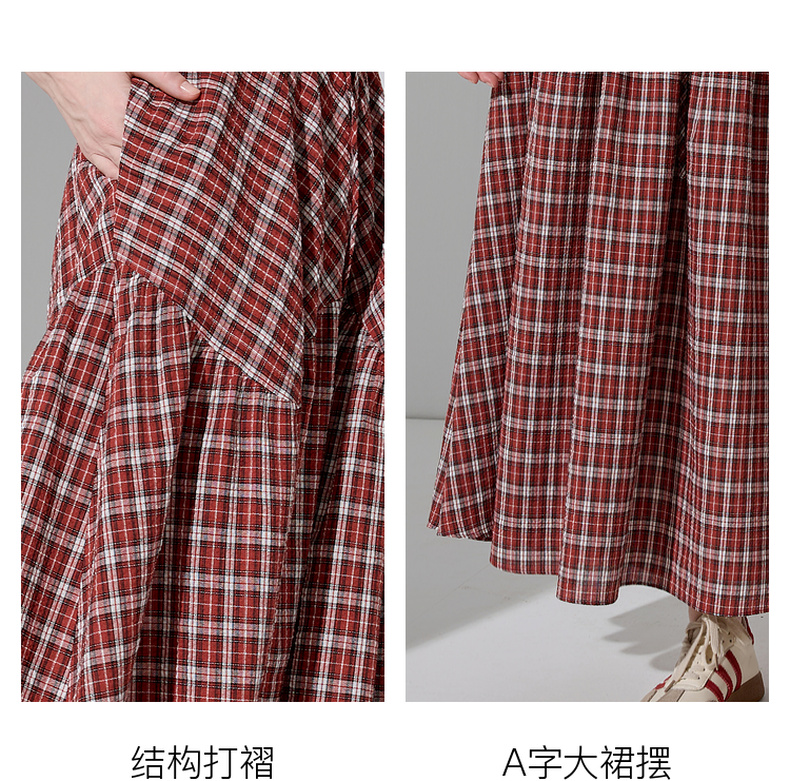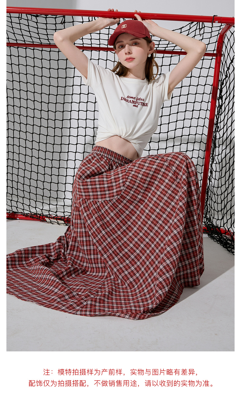 三彩2025夏季新款格纹半身裙高腰松紧A字裙结构拼接长裙M