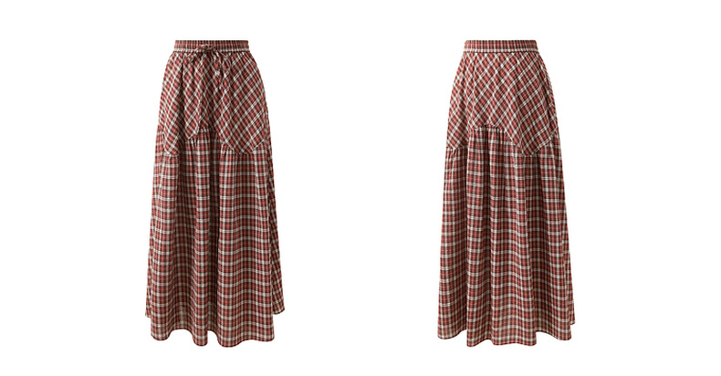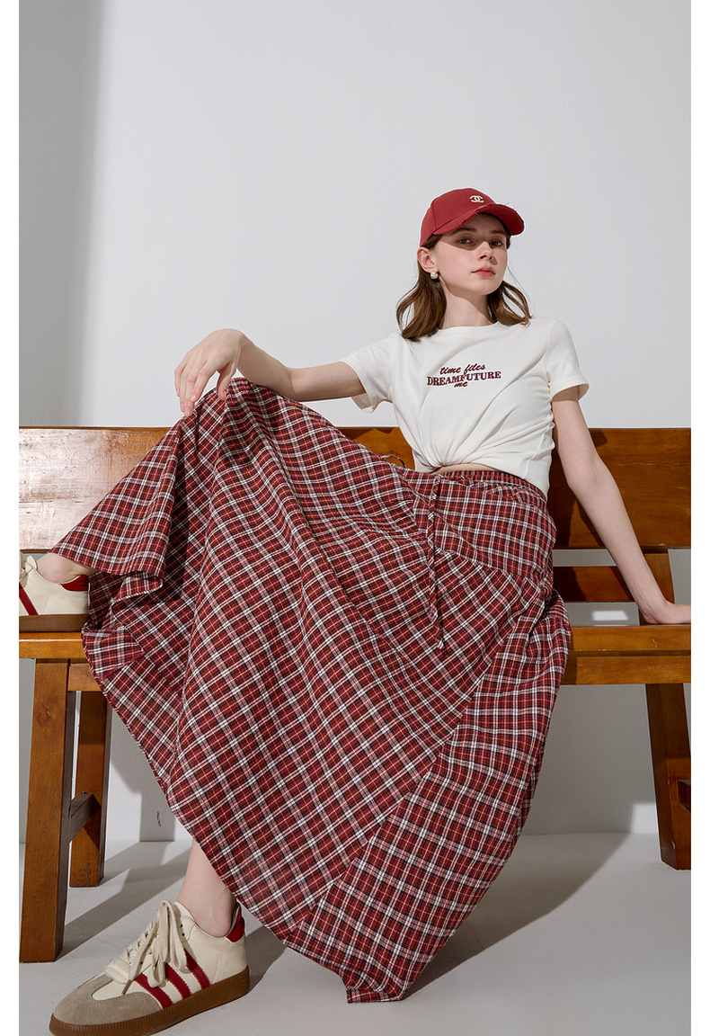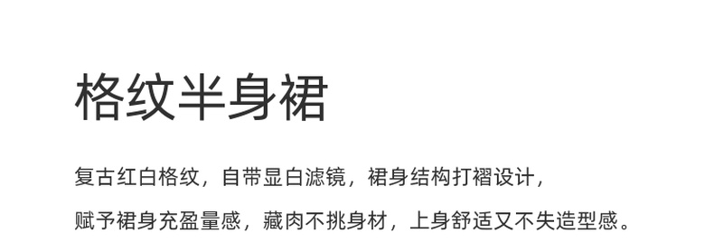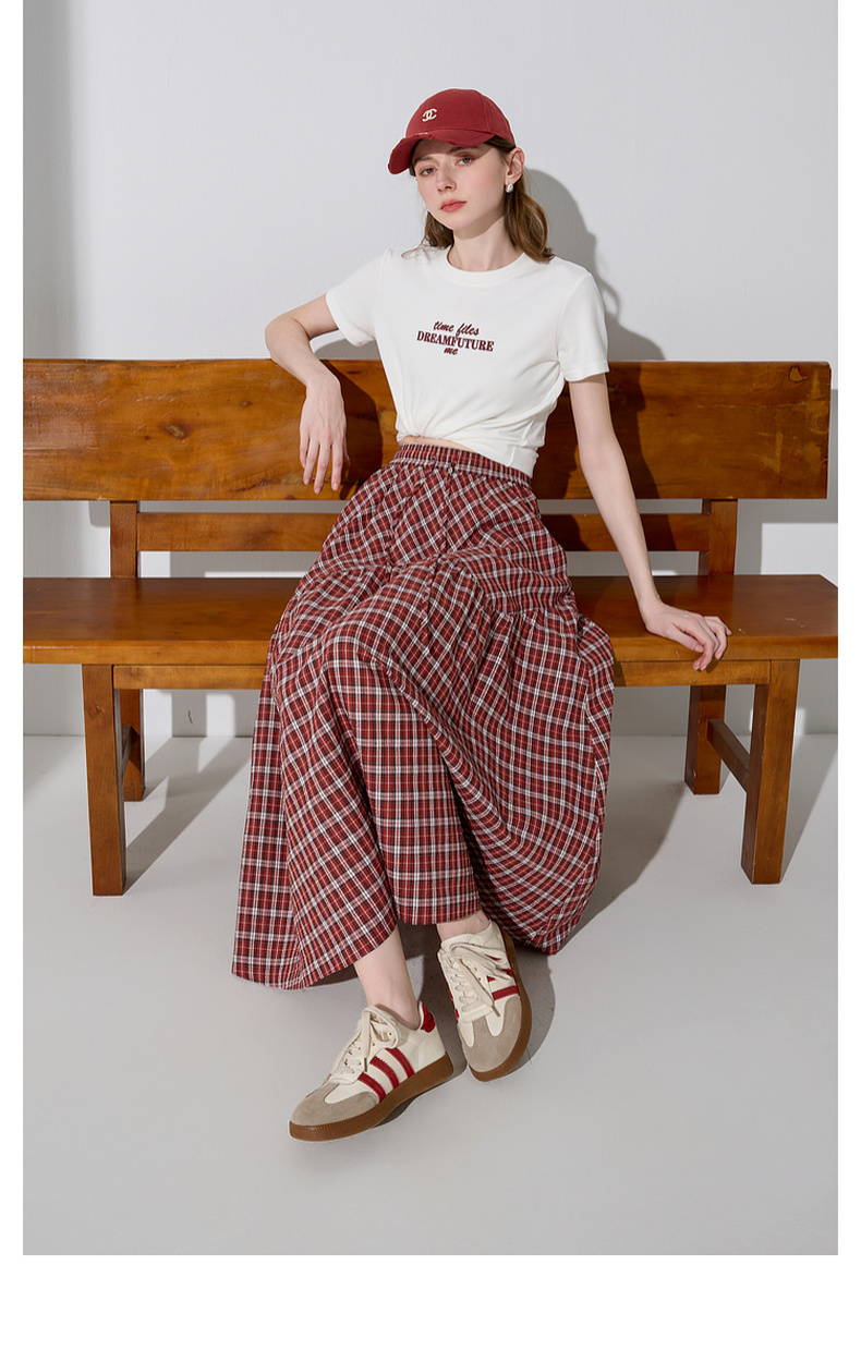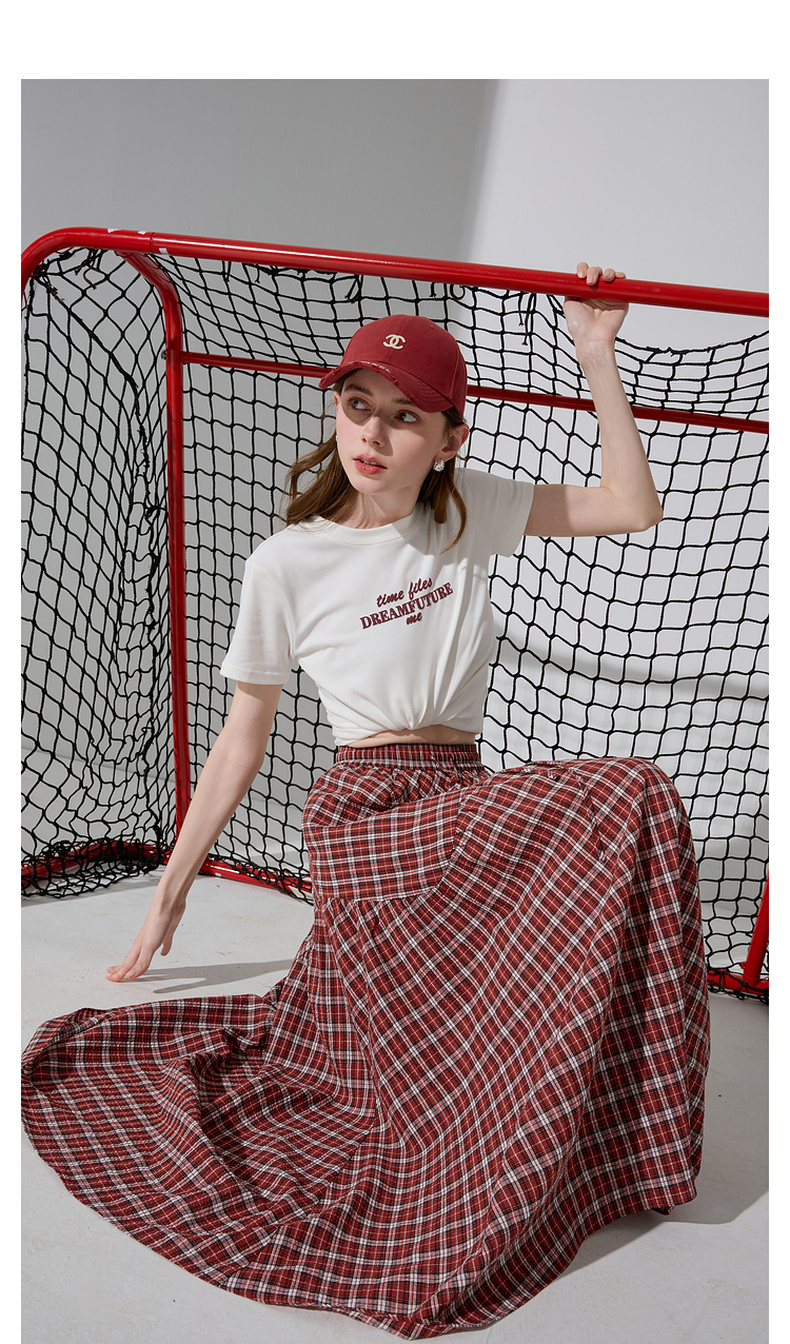 三彩2025夏季新款格纹半身裙高腰松紧A字裙结构拼接长裙M