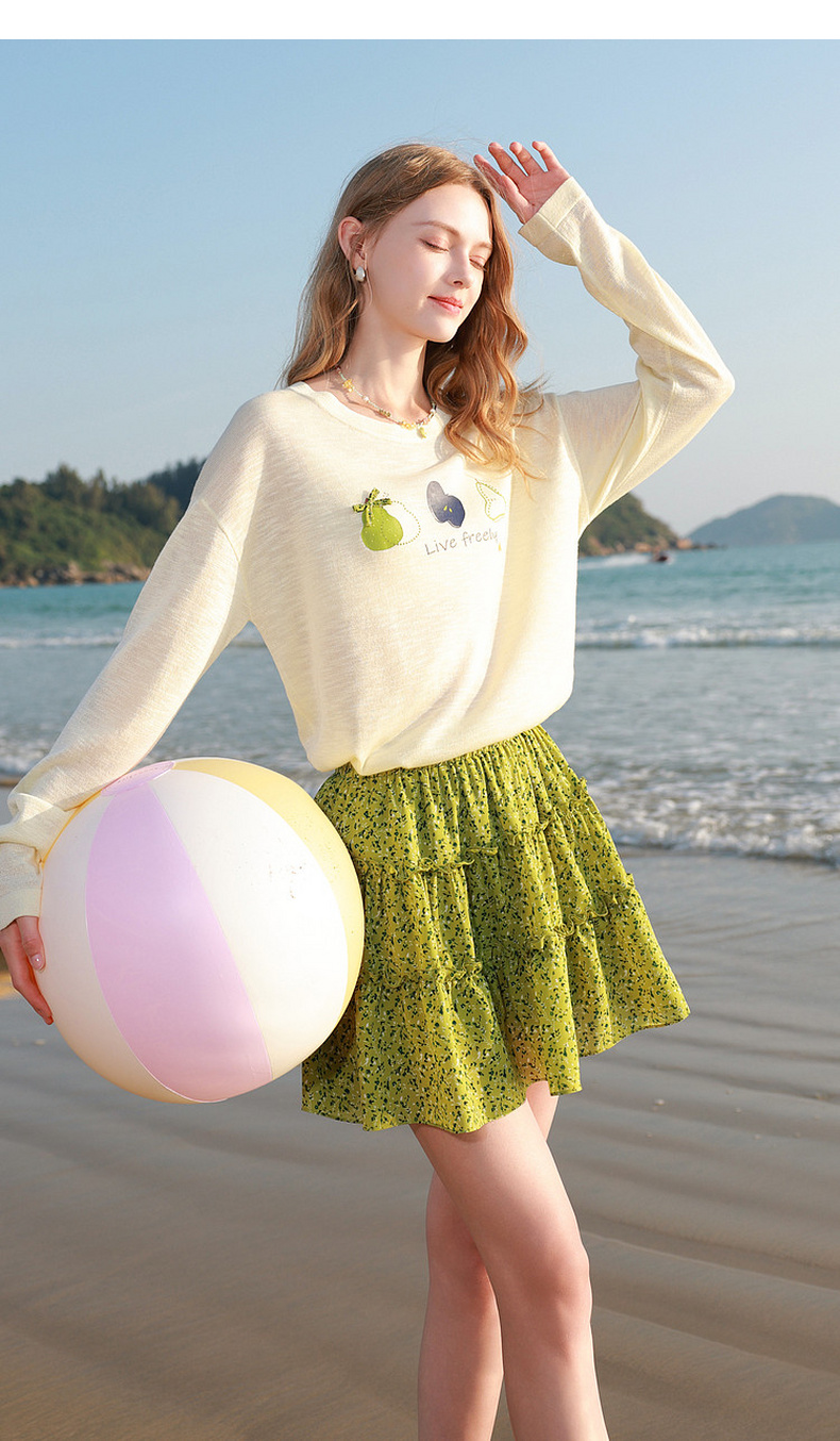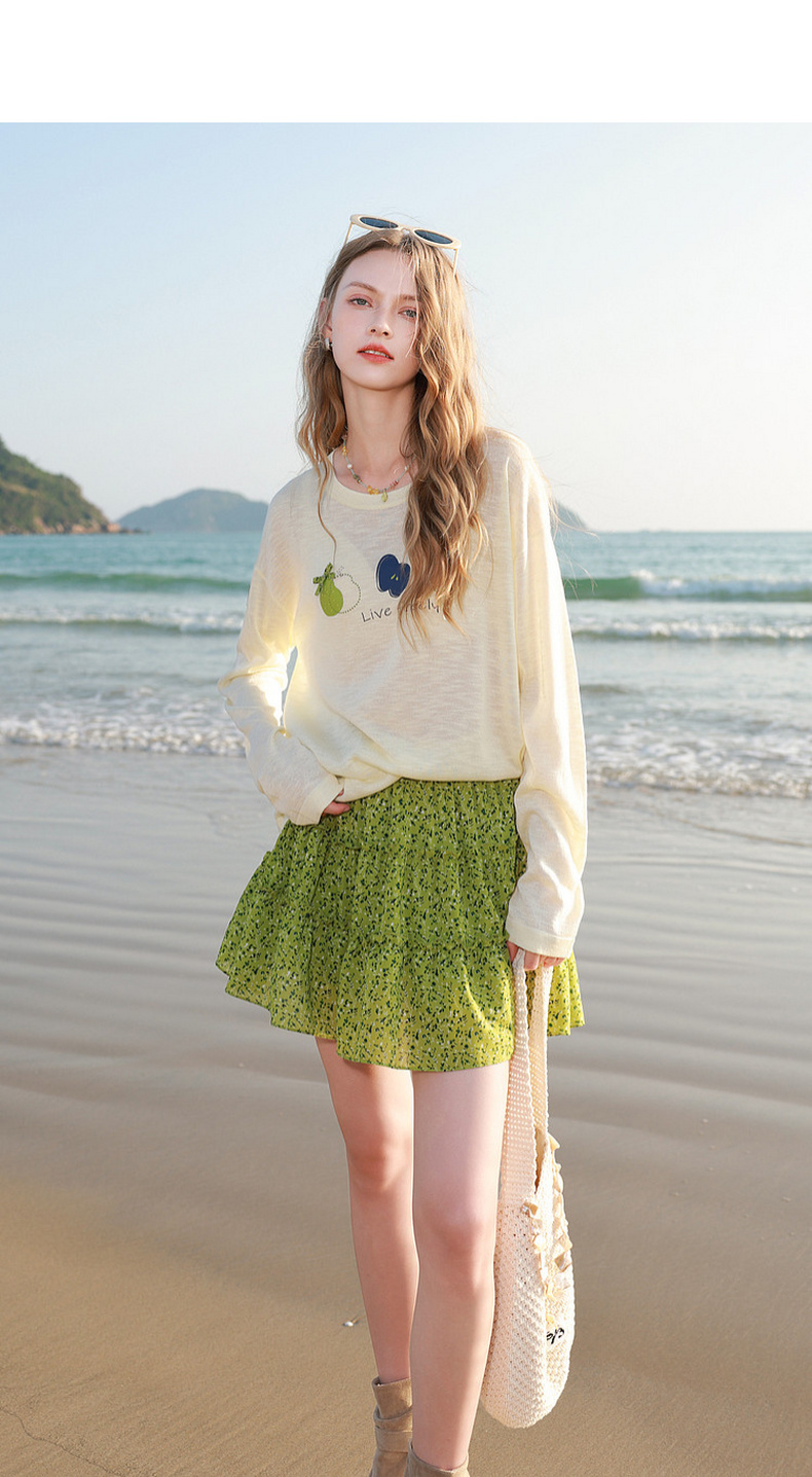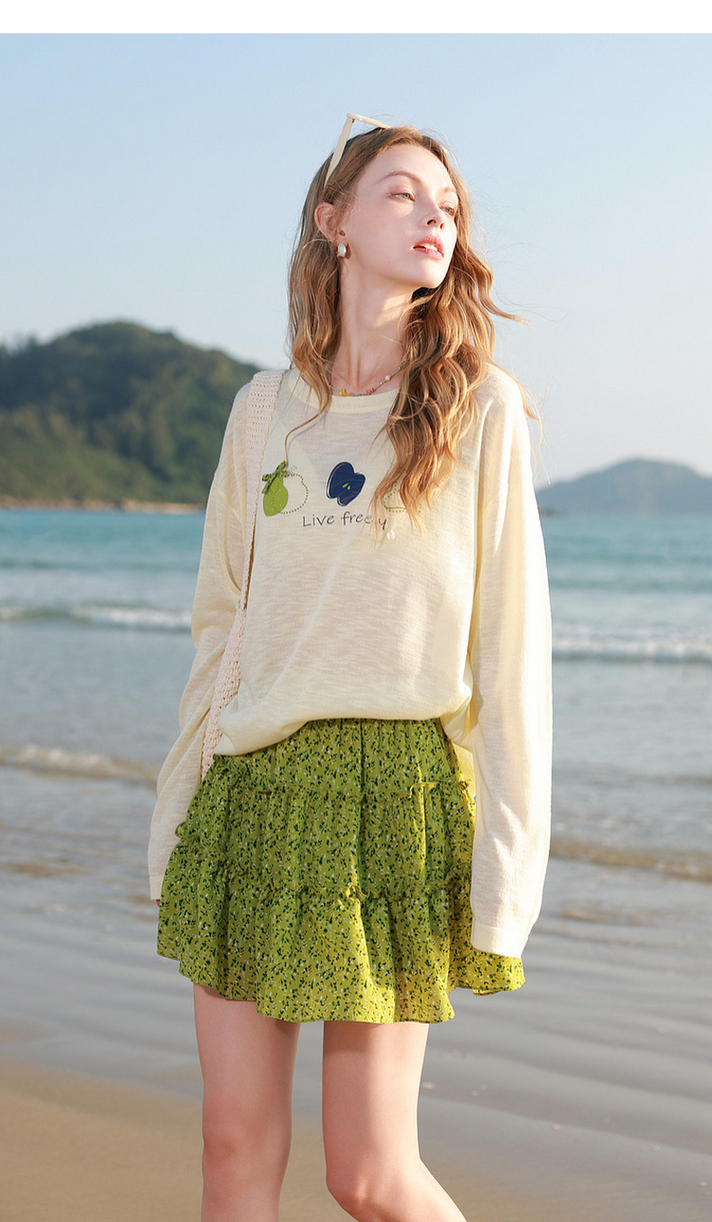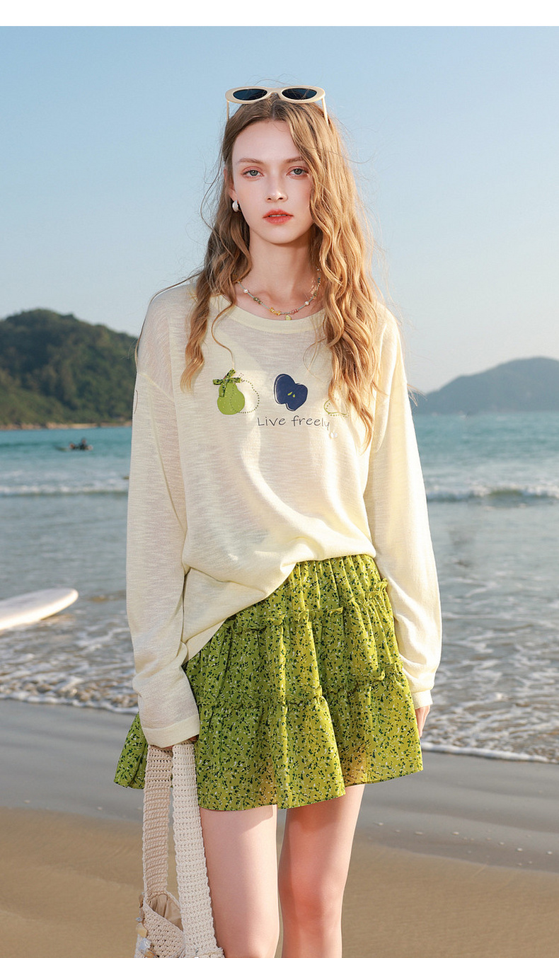 三彩2026夏季新款水果印花罩衫针织衫圆领套头落肩袖上衣简约M
