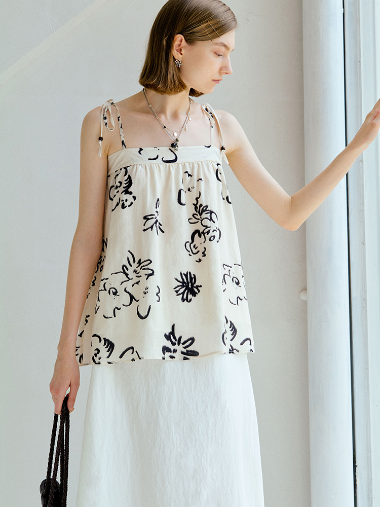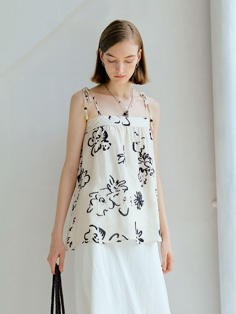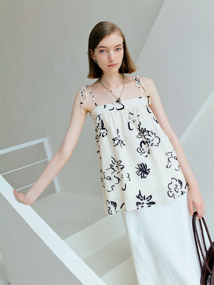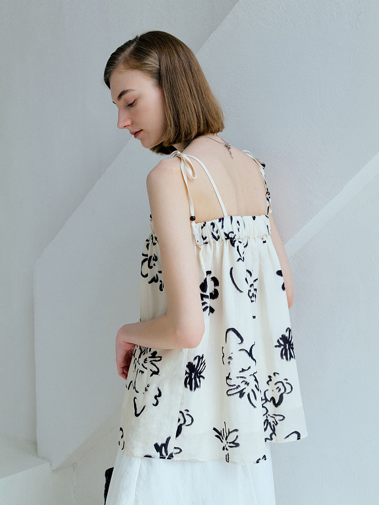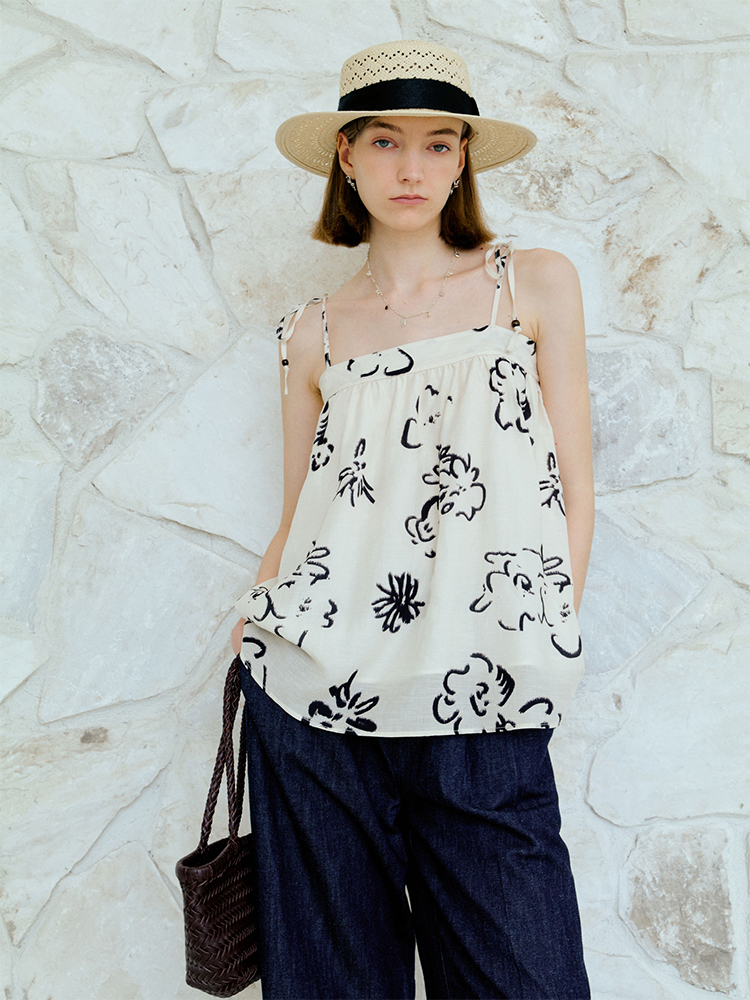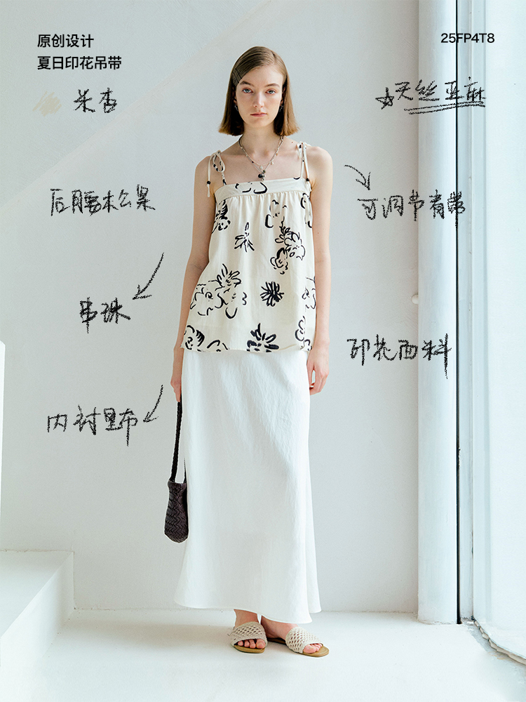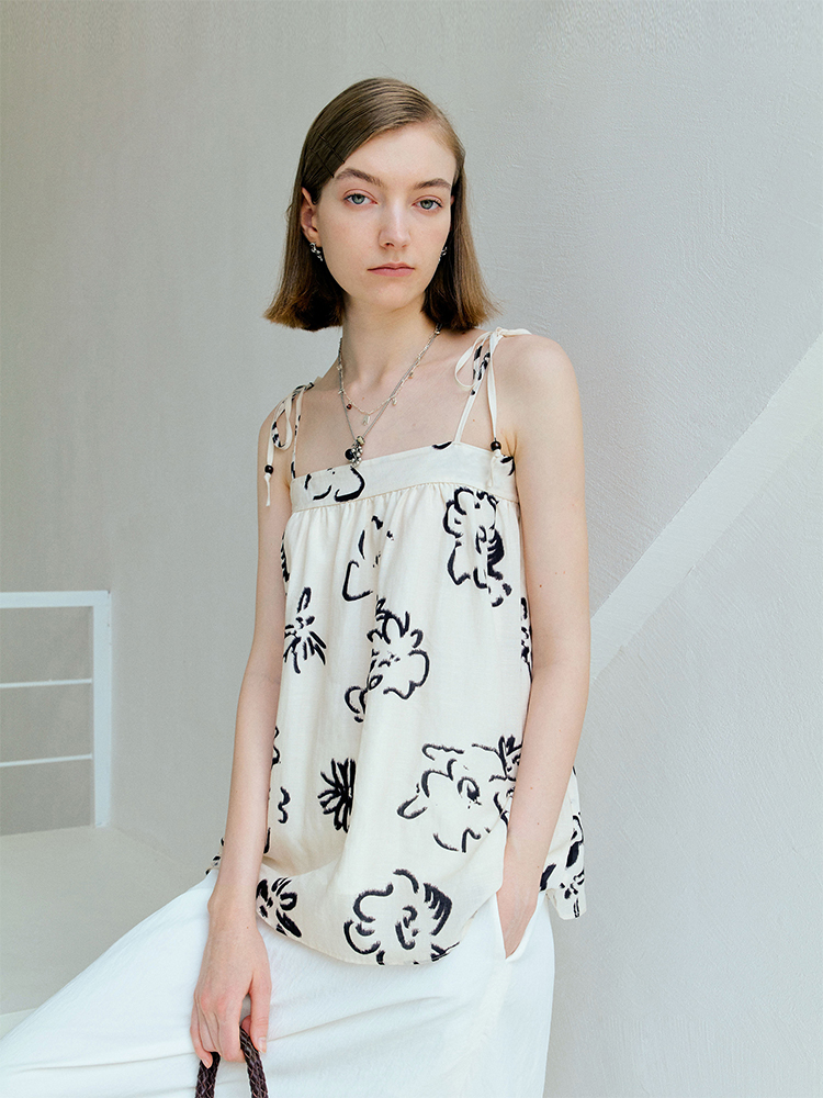 ForPoem 现货 25/SS原创设计亚麻夏日印花吊带上衣