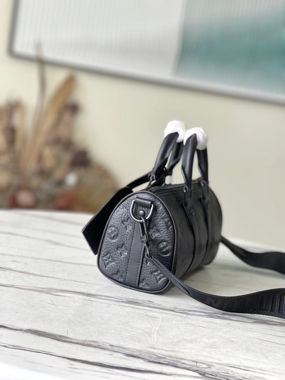 黑压花 本款手袋浓缩 Keepall 旅行袋的经典轮廓,由Monogram 压纹 Taurillon 皮革制成,紧凑构型适宜收纳手机和钱夹等随行小物。巧用皮革手柄和可拆卸肩带,潮流格调轻松随行。