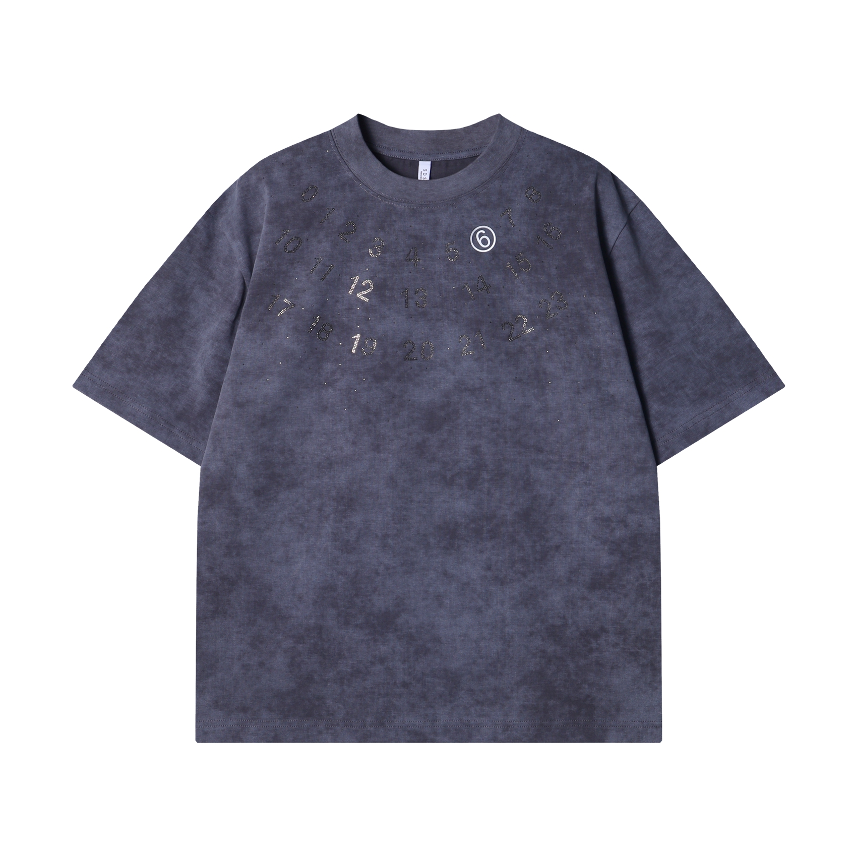 T2771夏季高级感新款潮牌扎染数字烫钻圆领短袖T恤复古宽松印花上衣