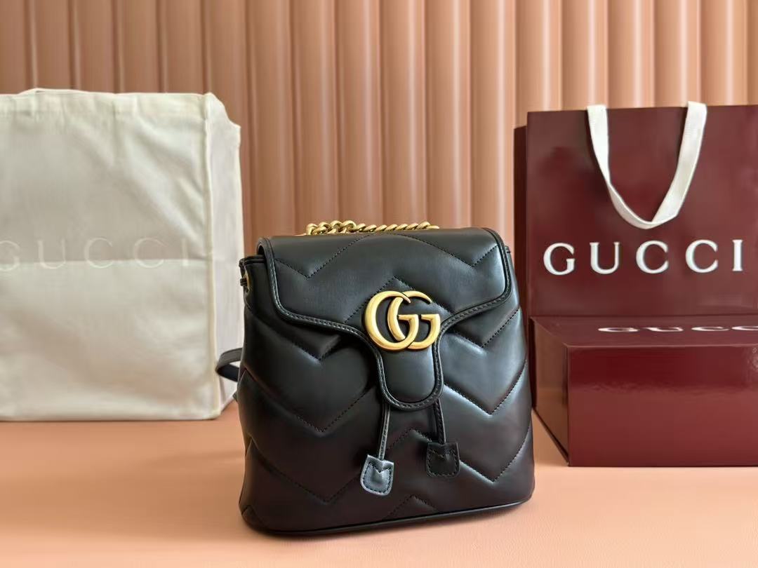 这款 Marmont系列背包以绗缝V型皮革匠心打造,造型小巧精致且柔和而不失挺括。造型配件灵感源自品牌典藏设计,翻盖造型暗藏内袋抽绳。